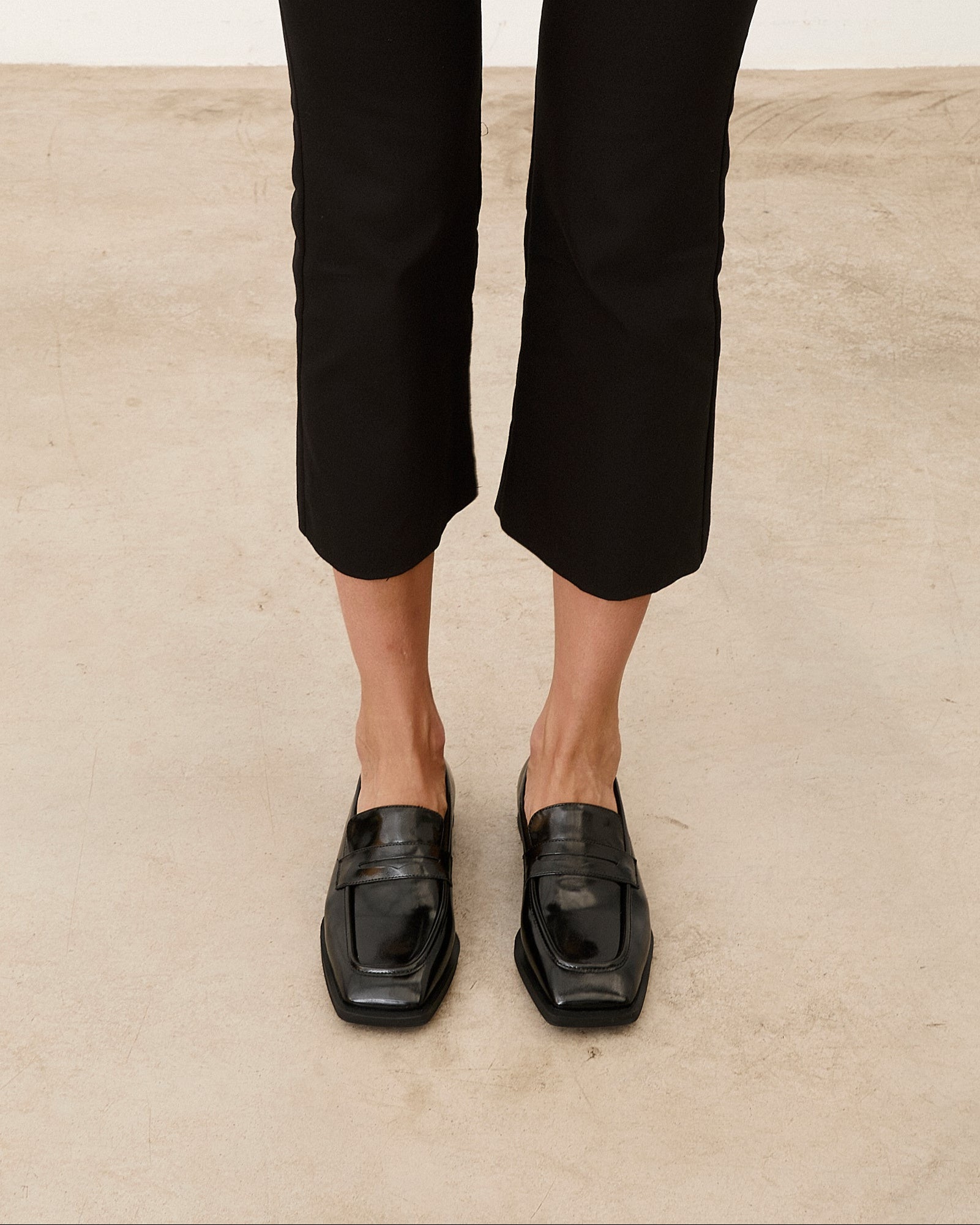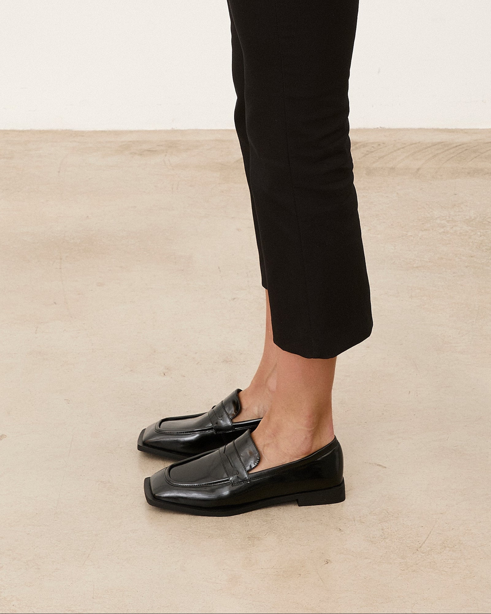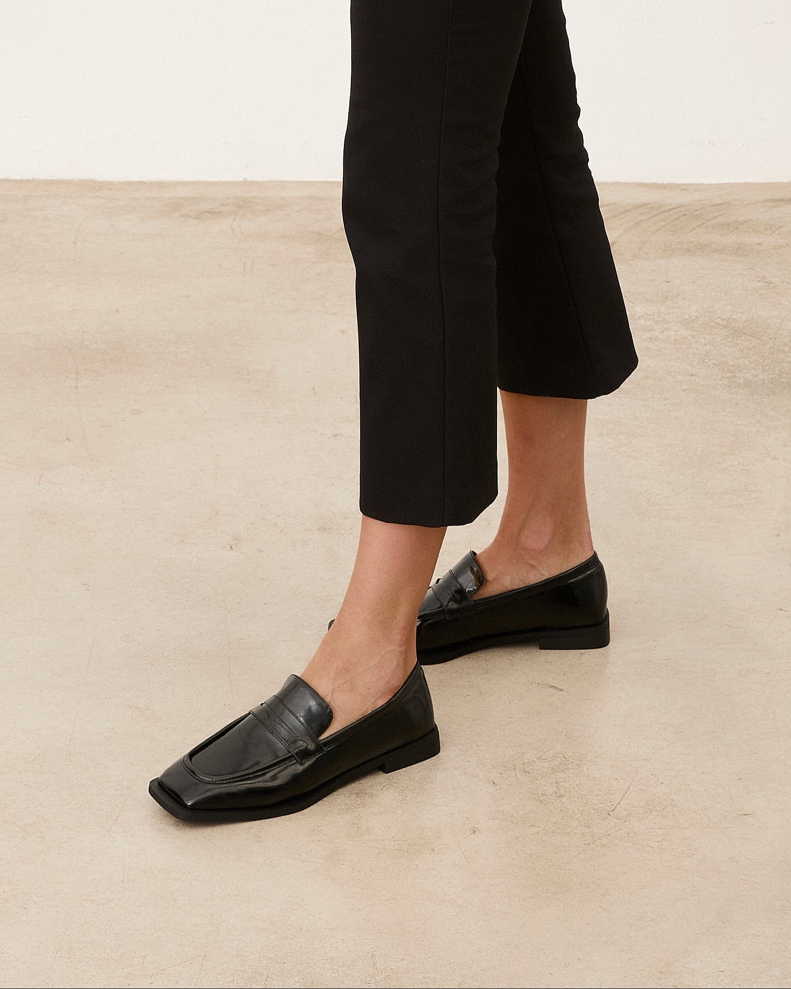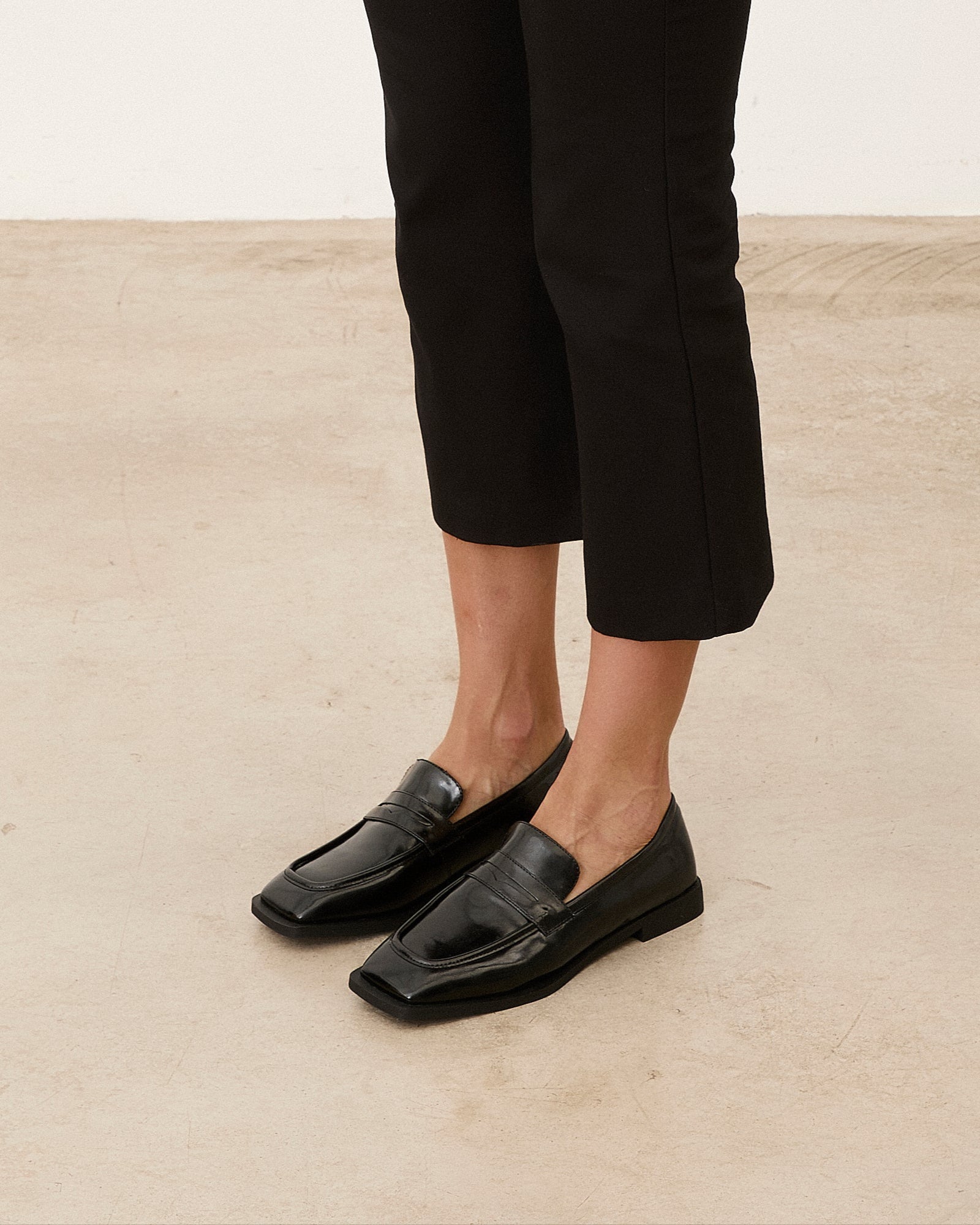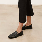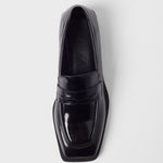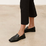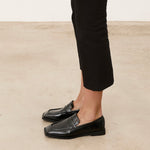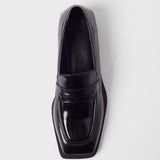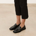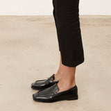 Zapato cerrado estilo mocasín efecto charol en color negro.