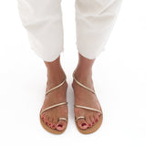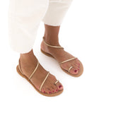 Sandalia plana con tiras en cuero color dorado. Sujeción en tobillo.