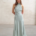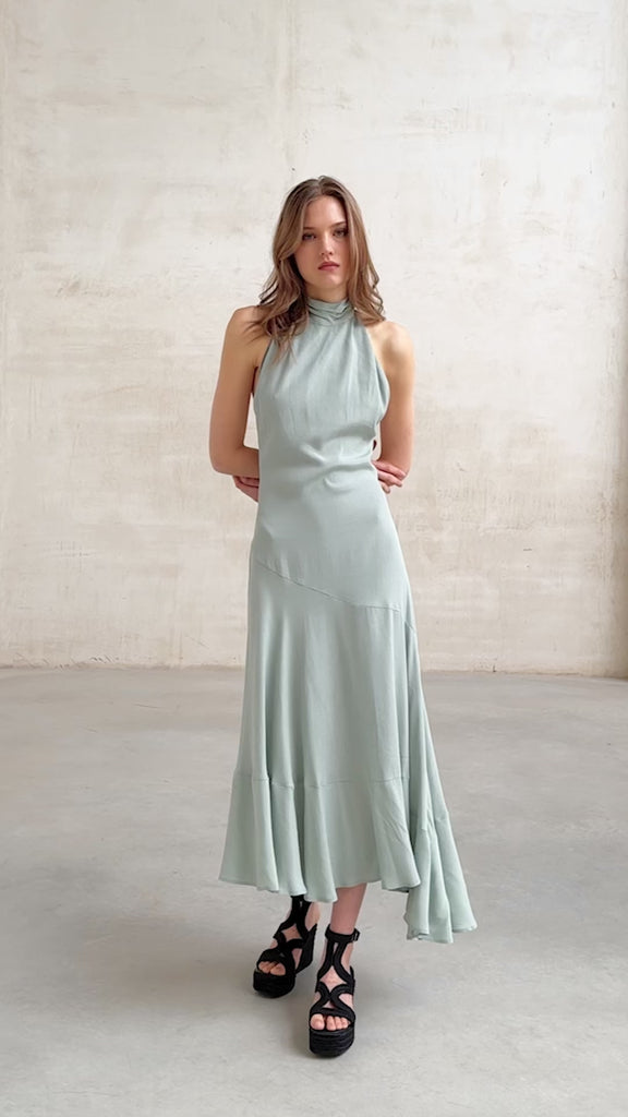 Vestido corte halter con espalda abierta en color turquesa. Ajuste en cintura y falda con vuelo. Cortes transversales y bajo asimétrico.