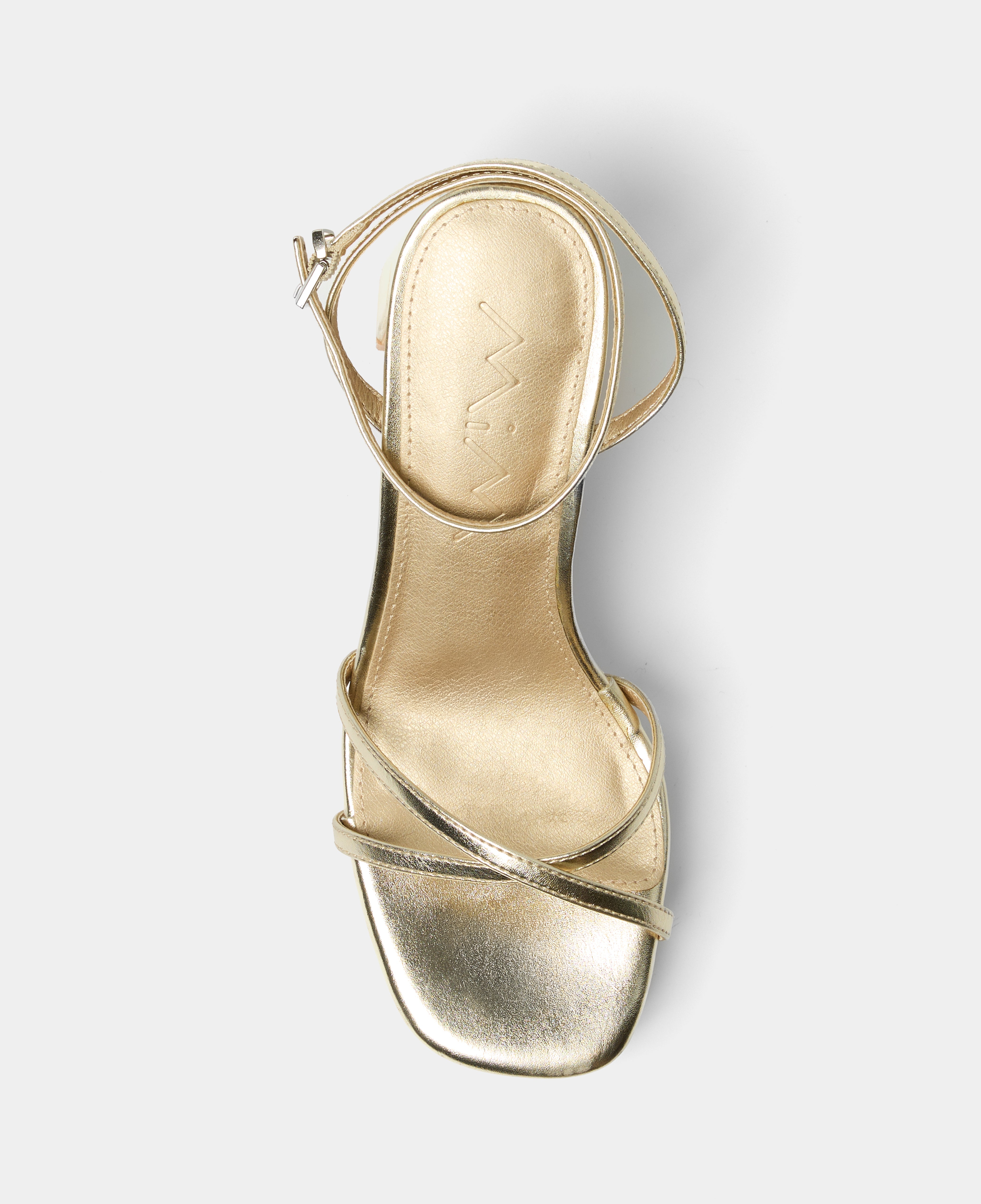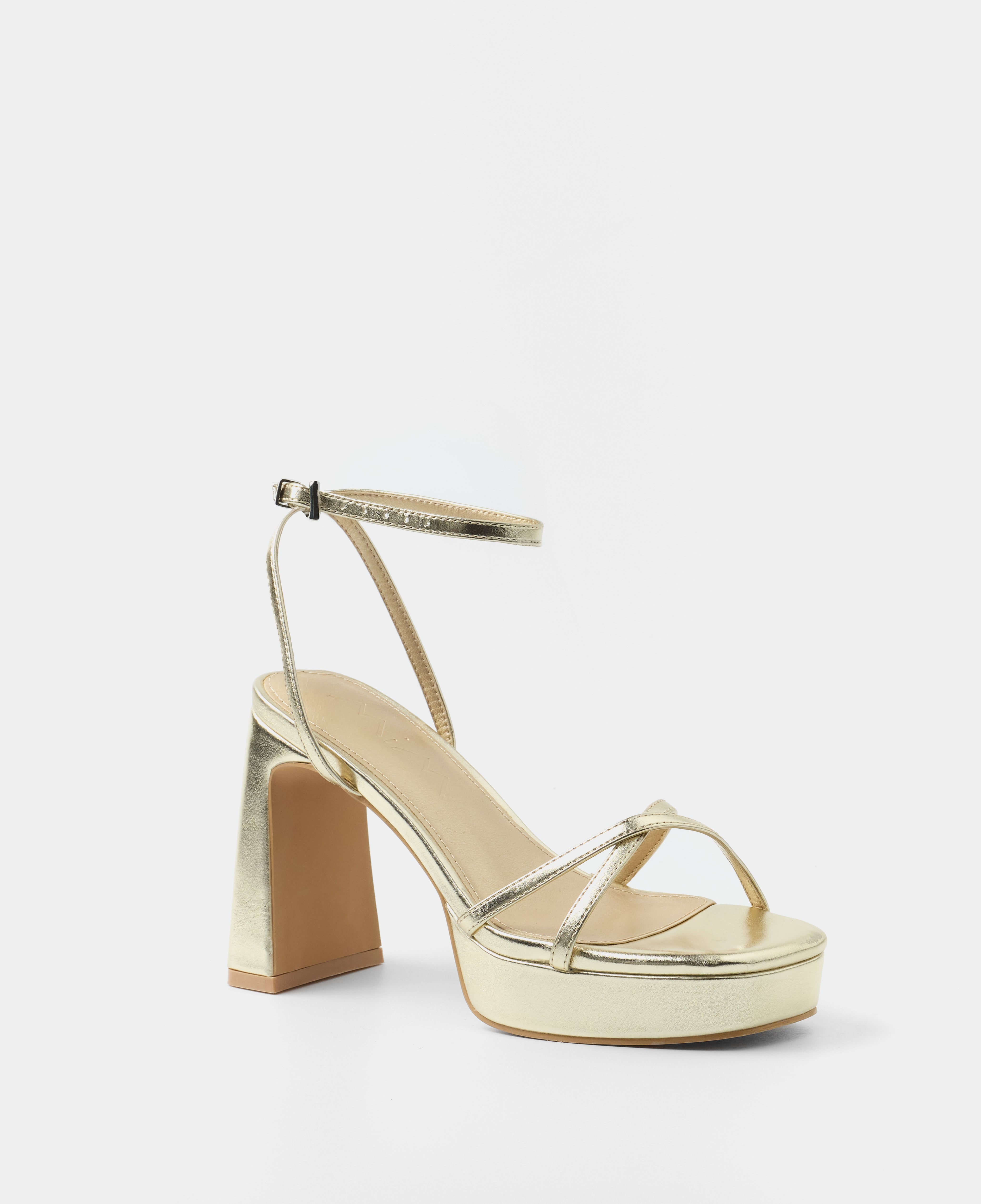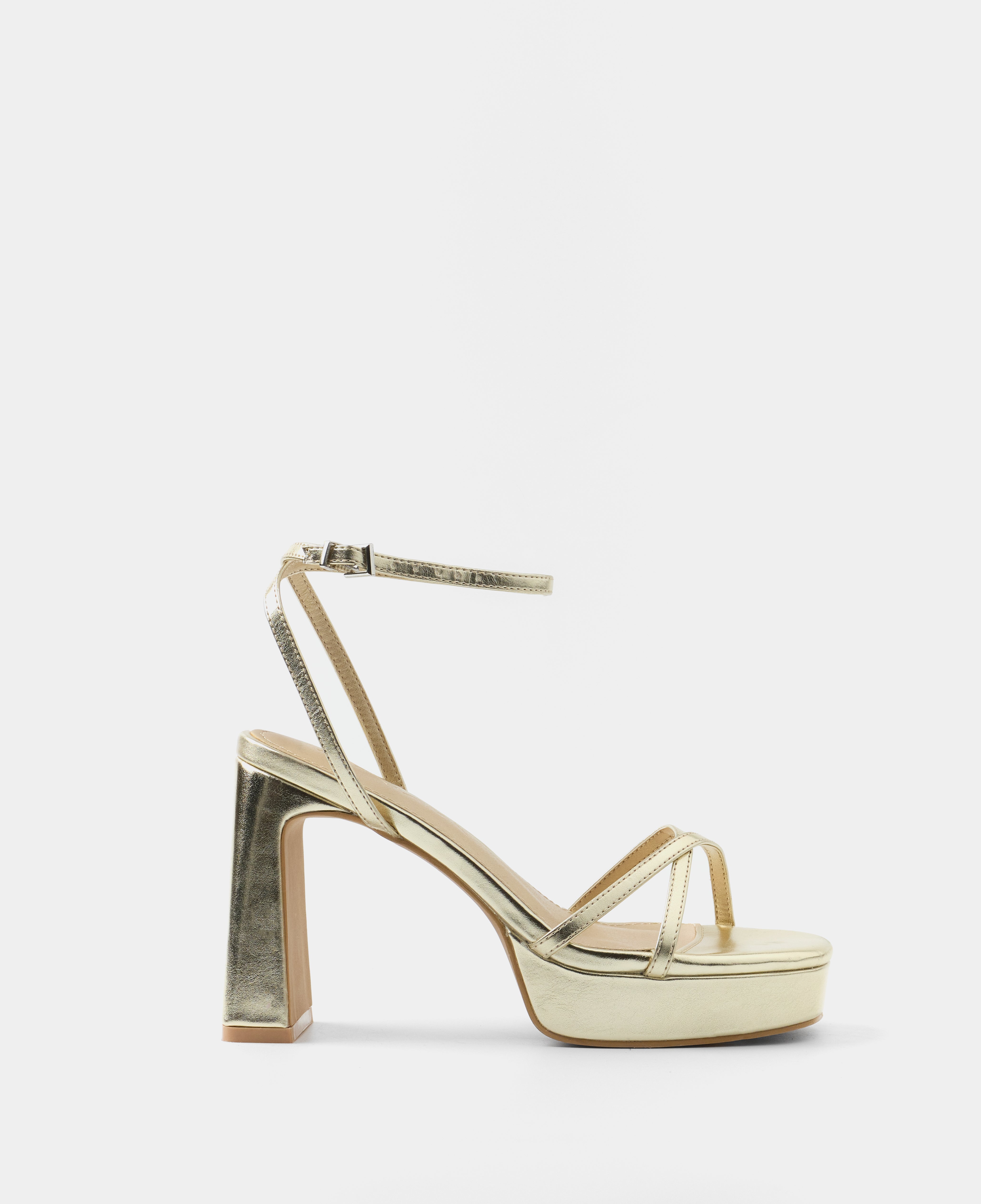 Sandalia de tacón con plataforma color dorado con tiras. Cierre en el tobillo con hebilla.