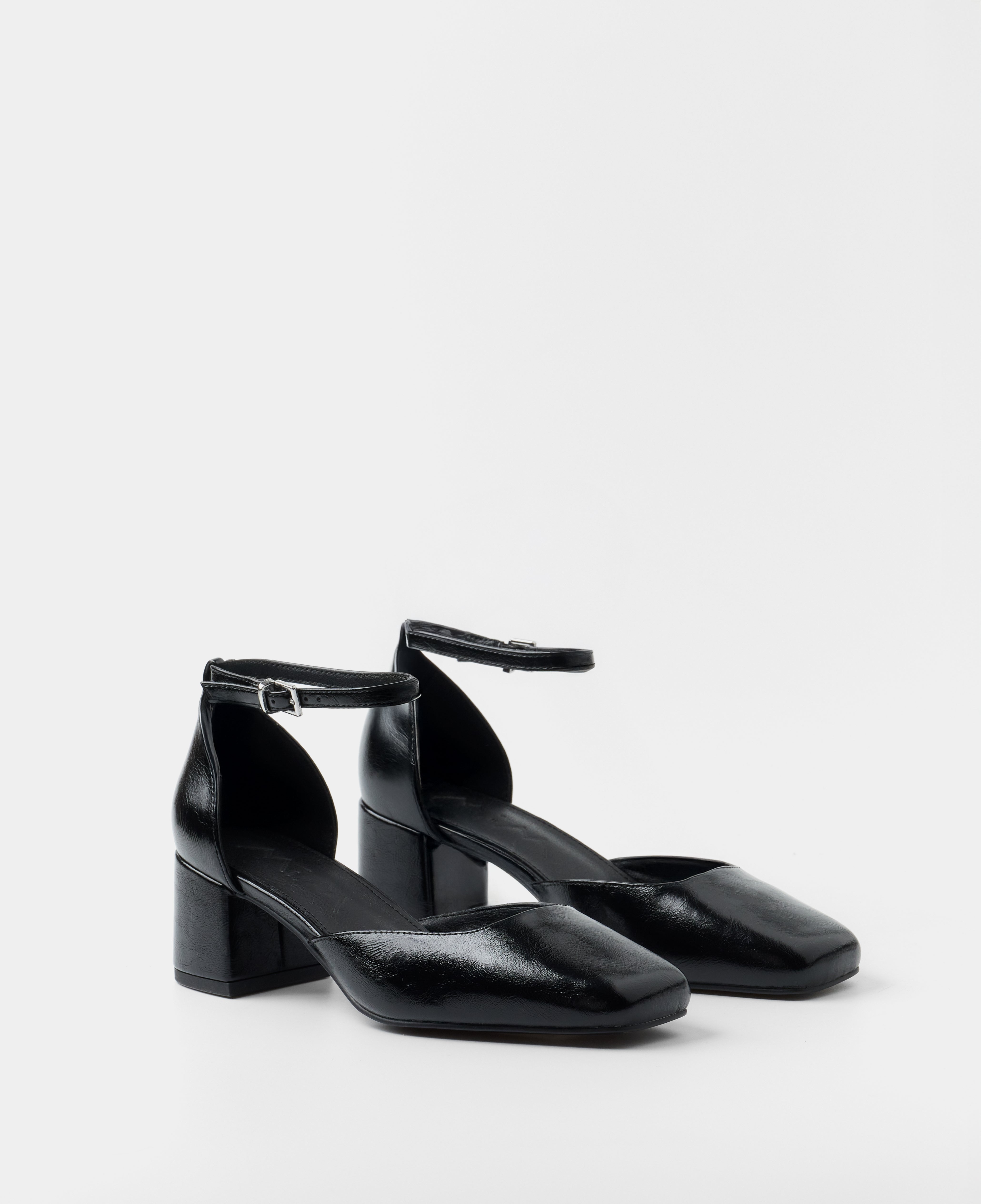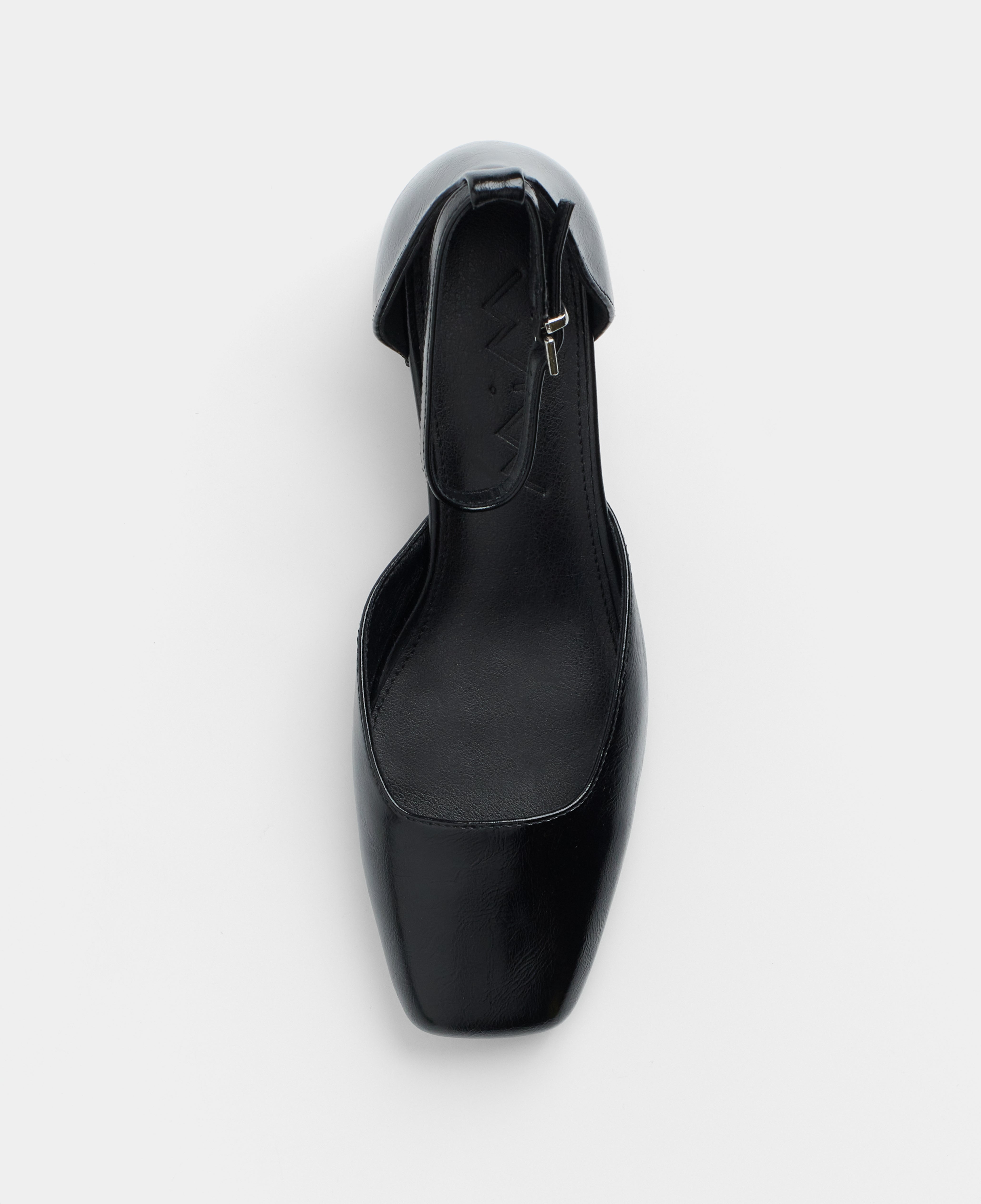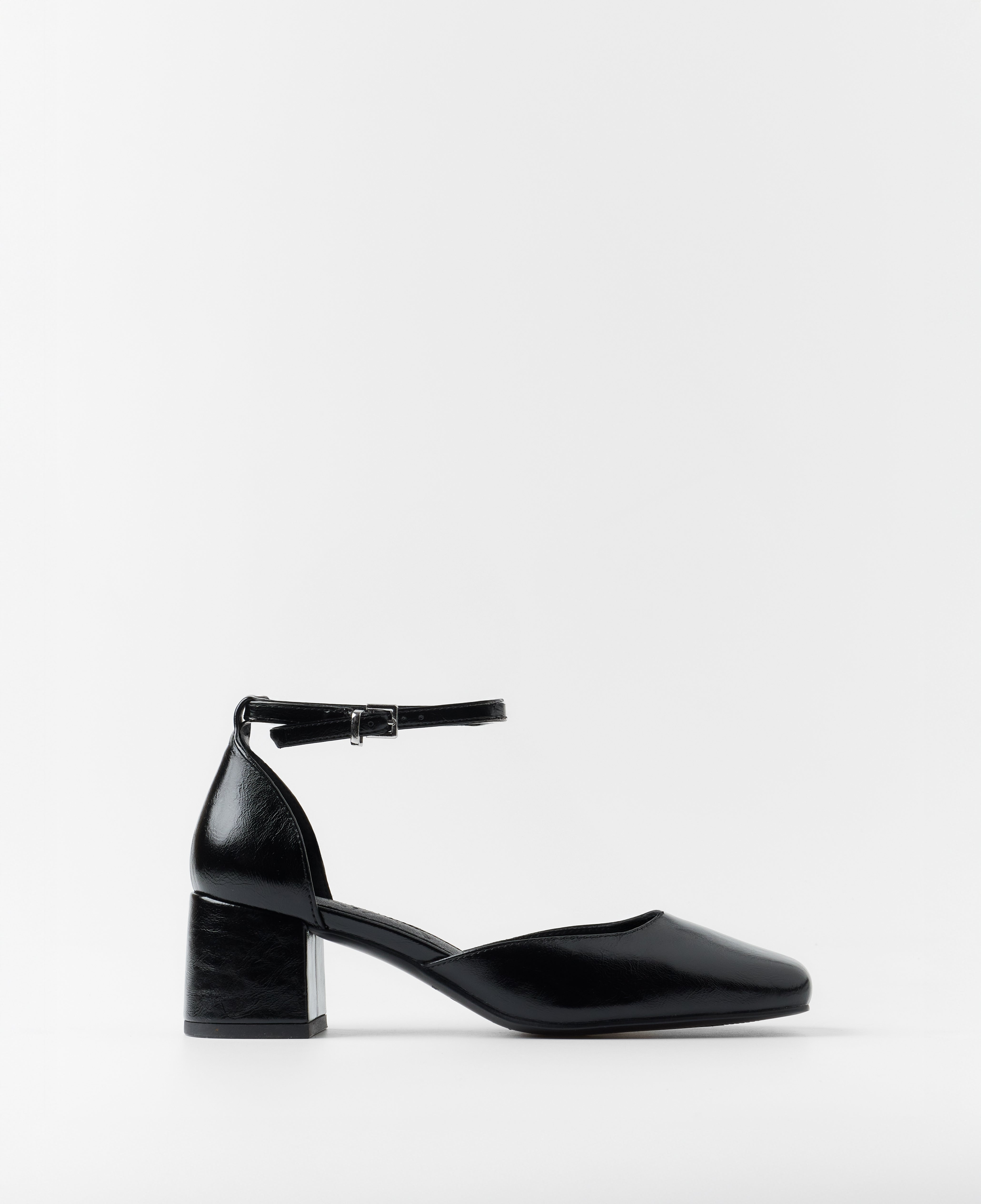 Zapato de tacón cerrado con puntera cuadrada en negro. Talonera con pulsera al tobillo. Tacón cuadrado.