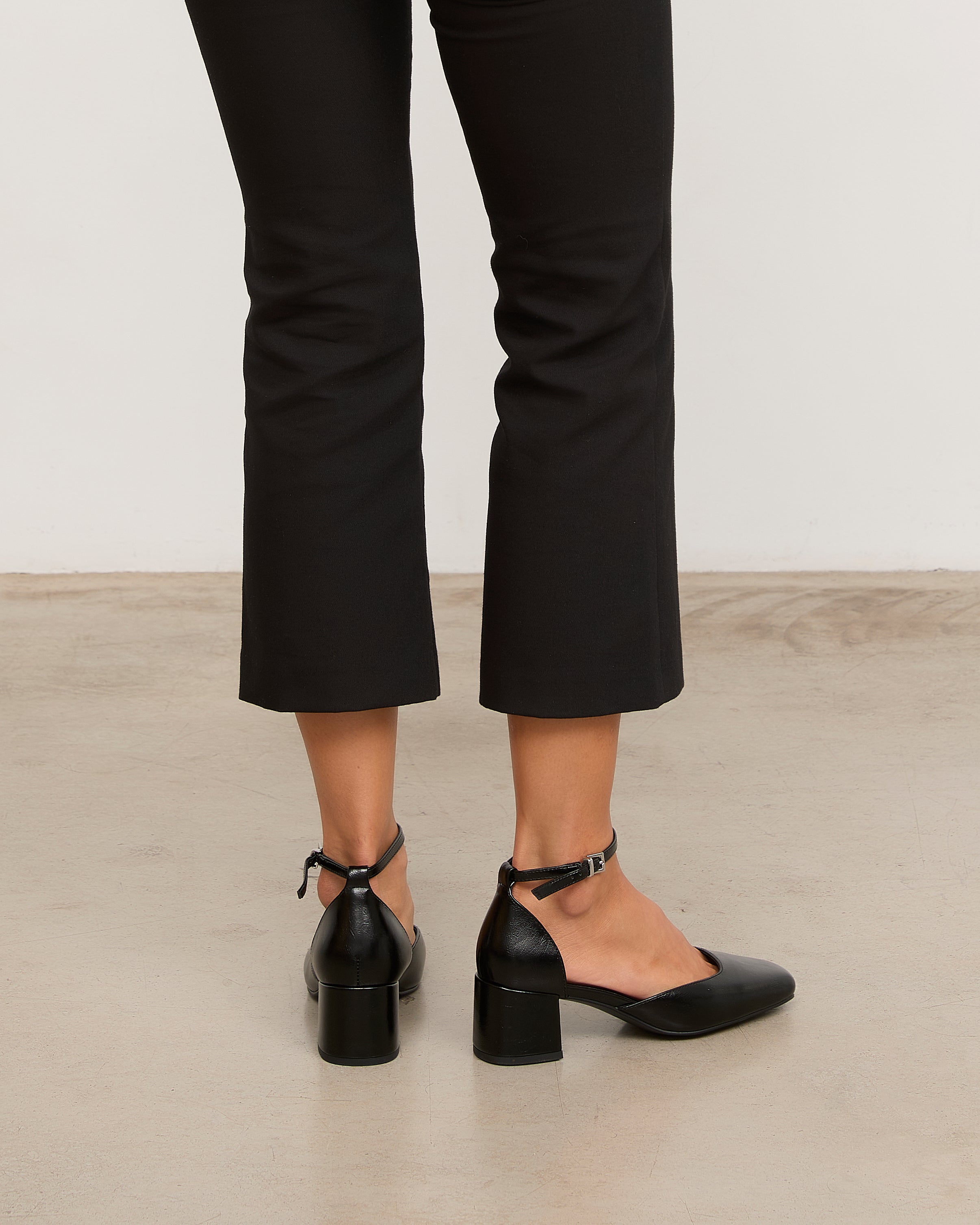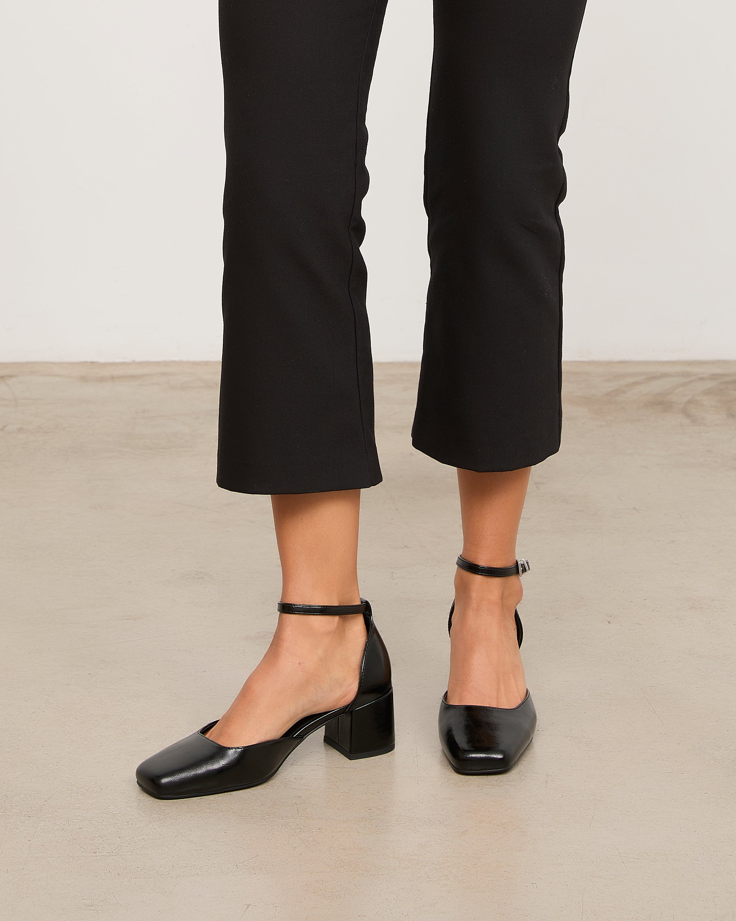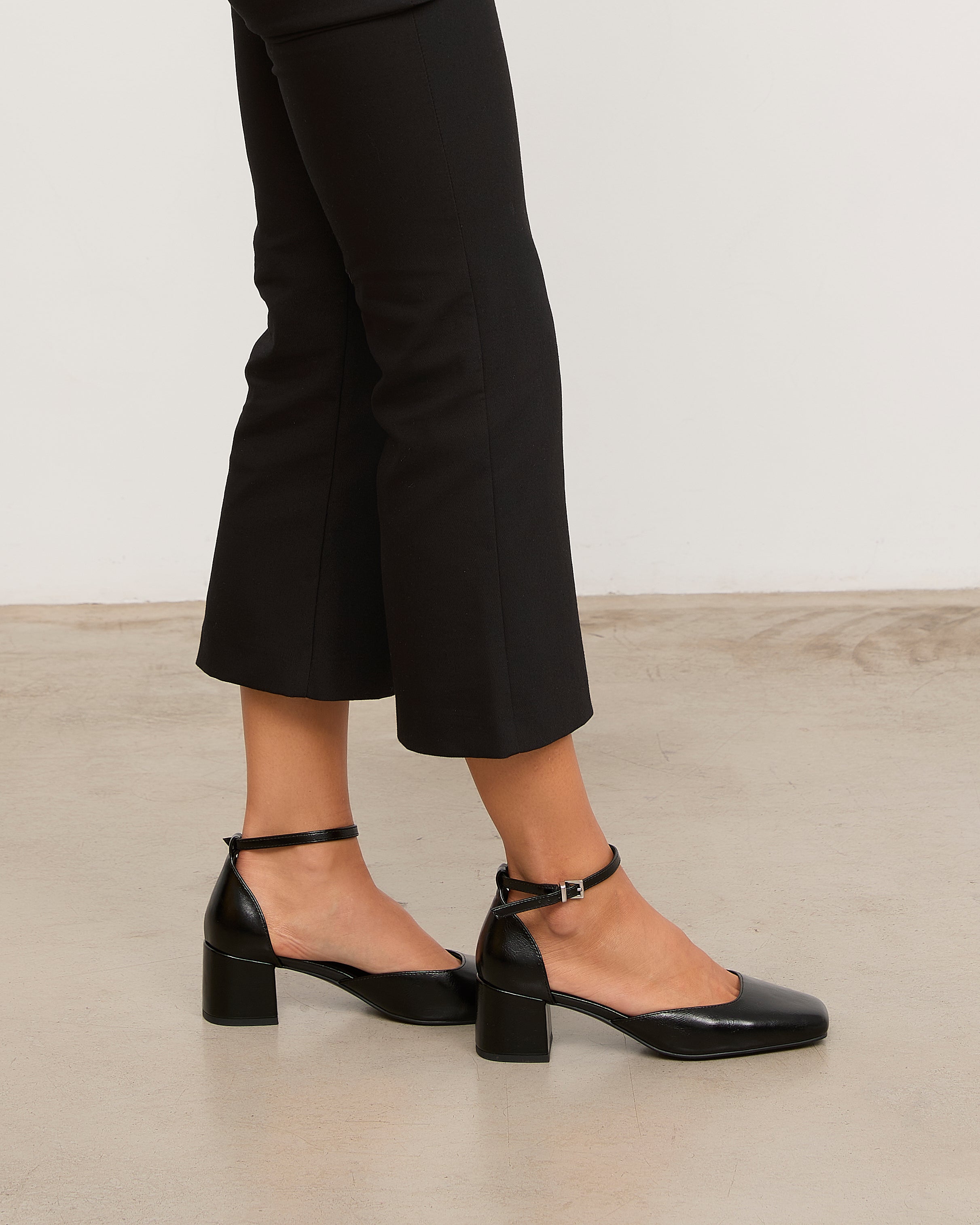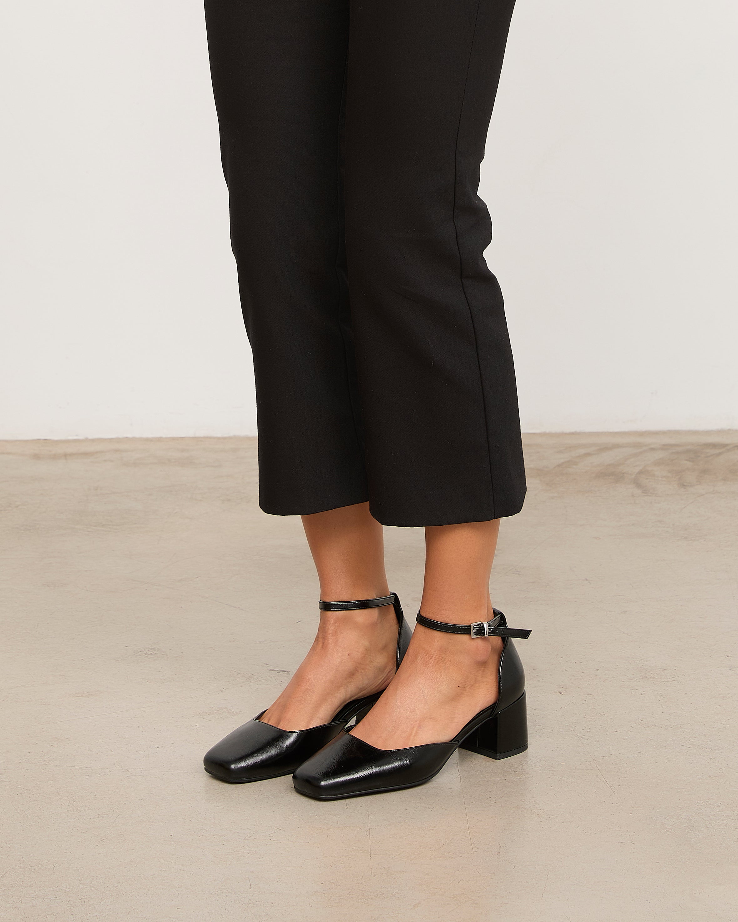 Zapato de tacón cerrado con puntera cuadrada en negro. Talonera con pulsera al tobillo. Tacón cuadrado.