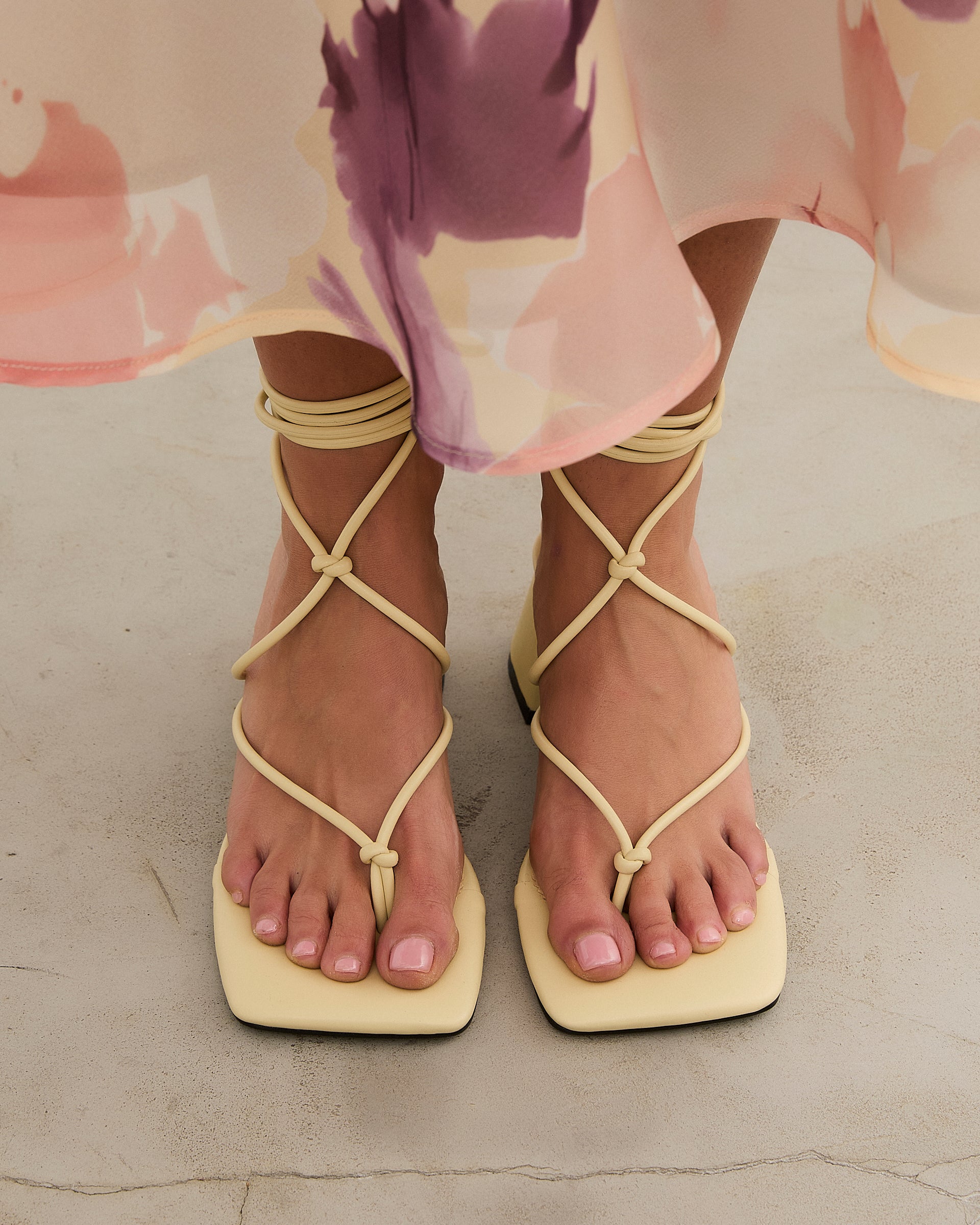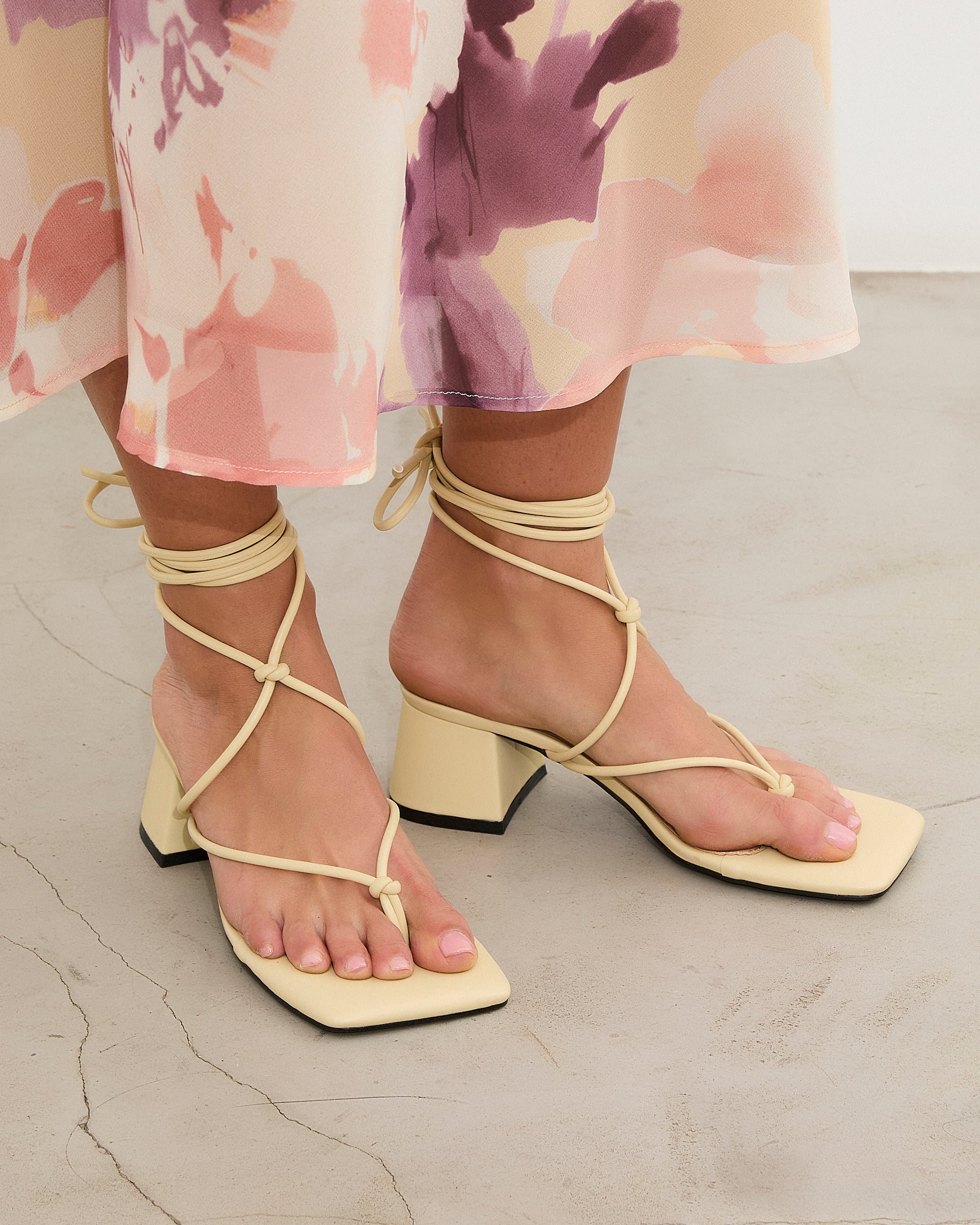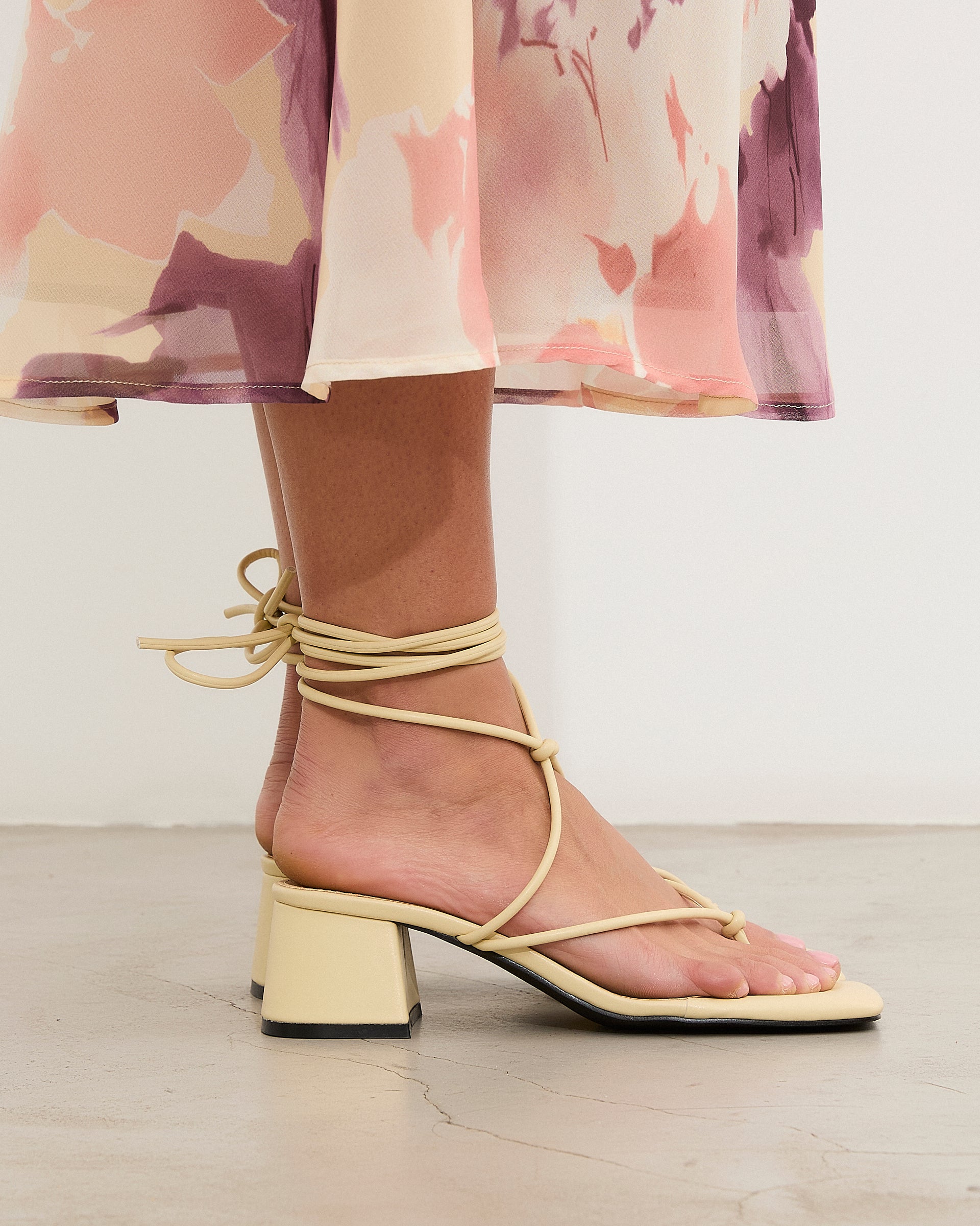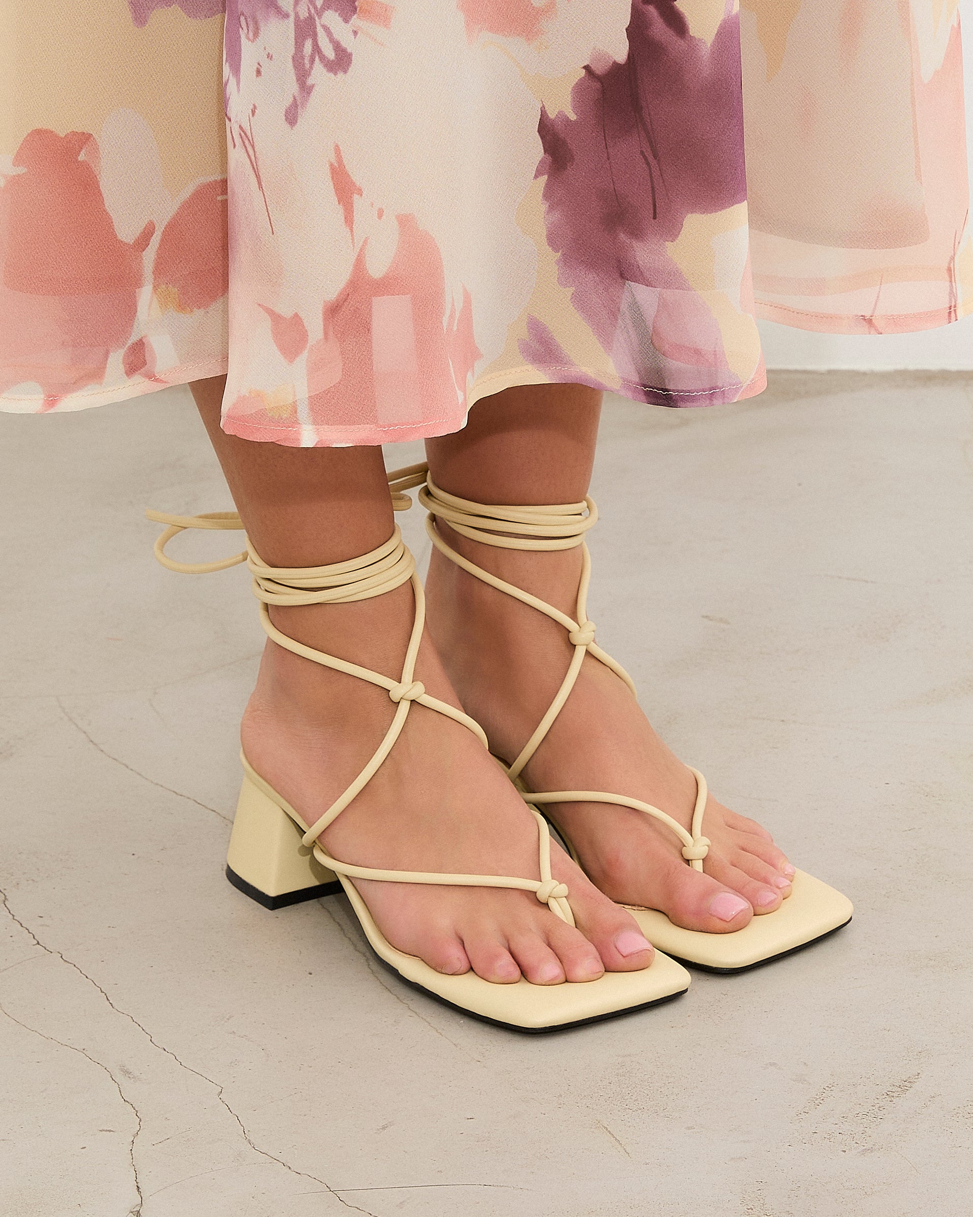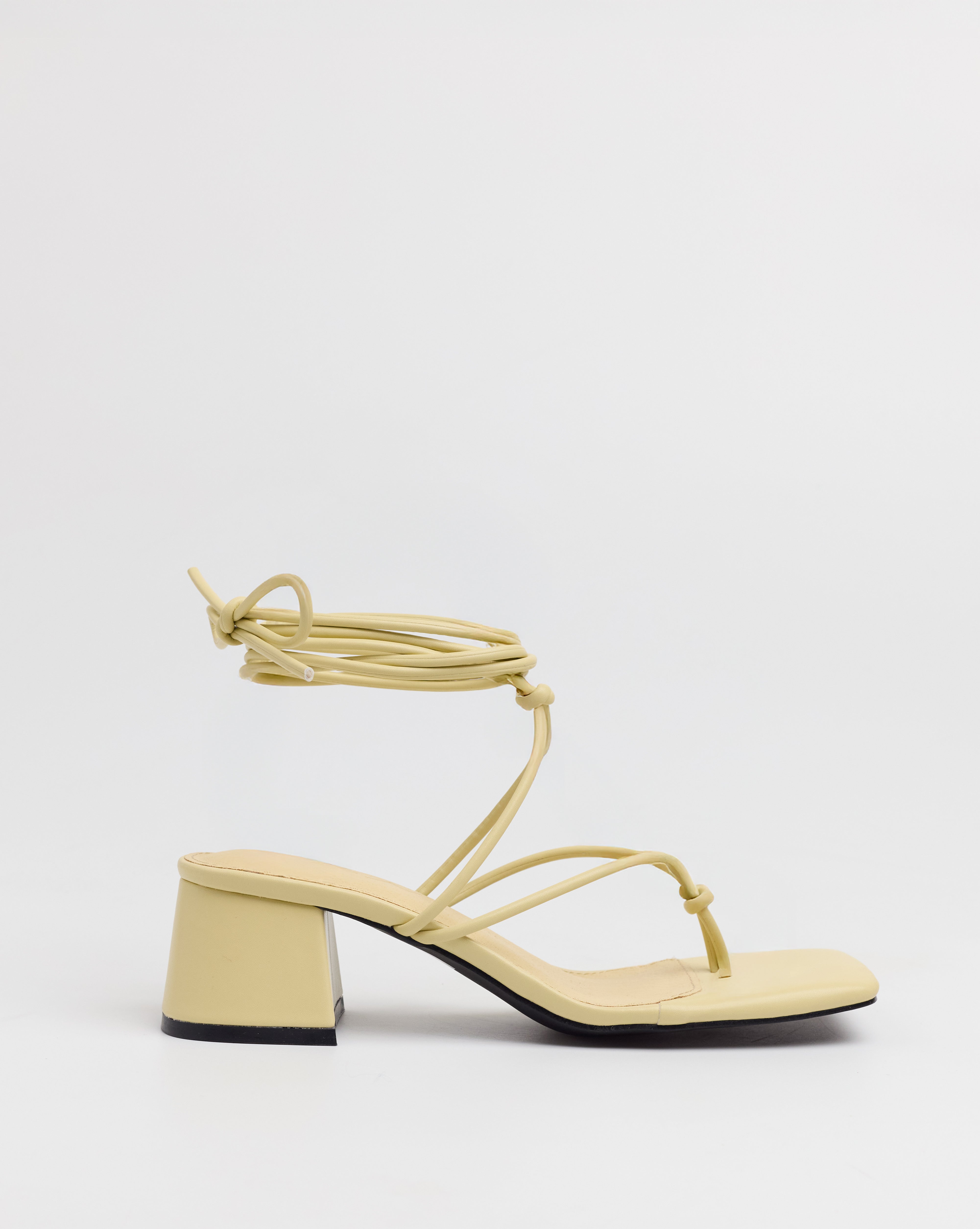 Sandalia de tacón de dedo en color amarillo. Tiras para sujección alrededor de tobilo. Tacón cuadrado.
