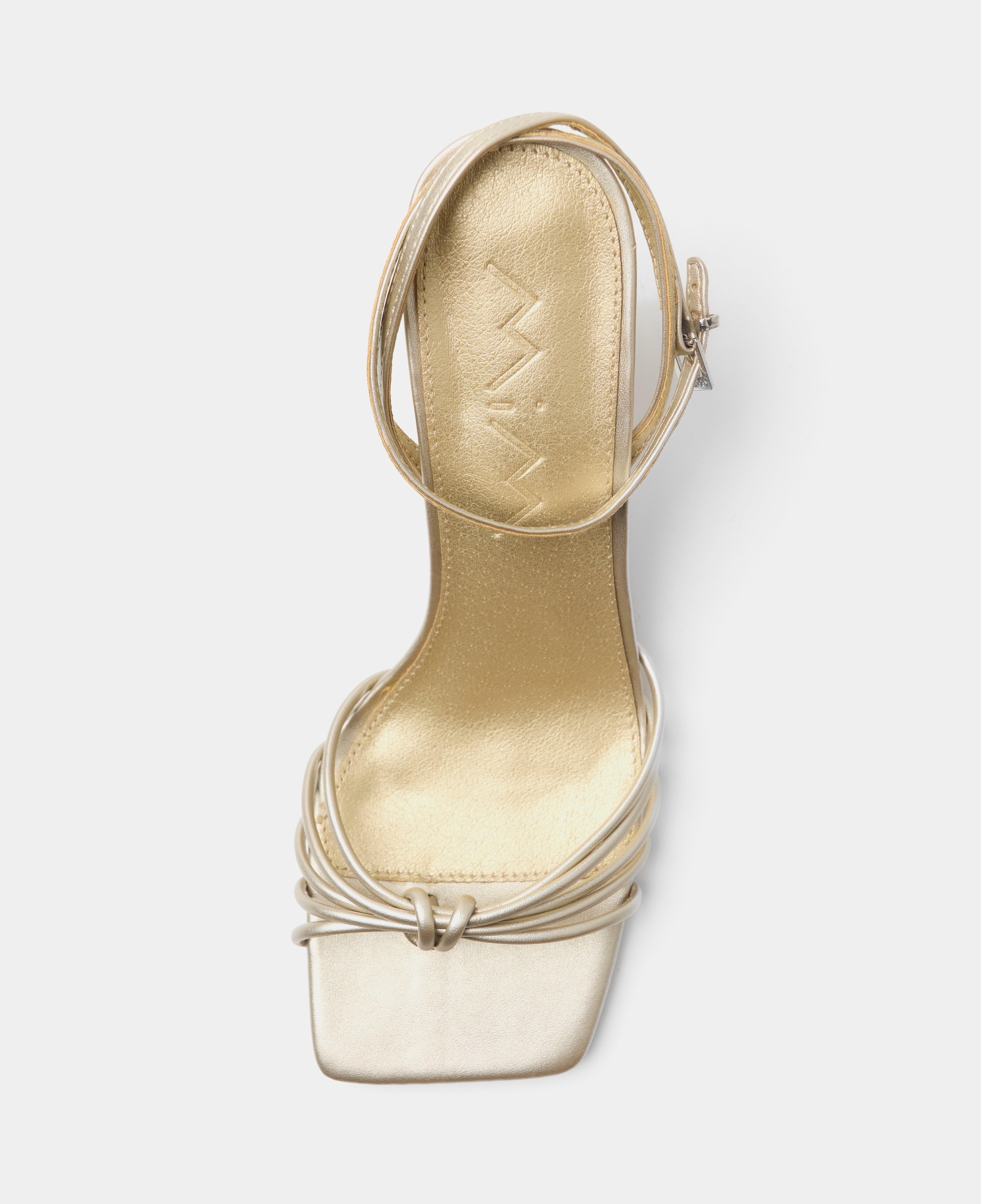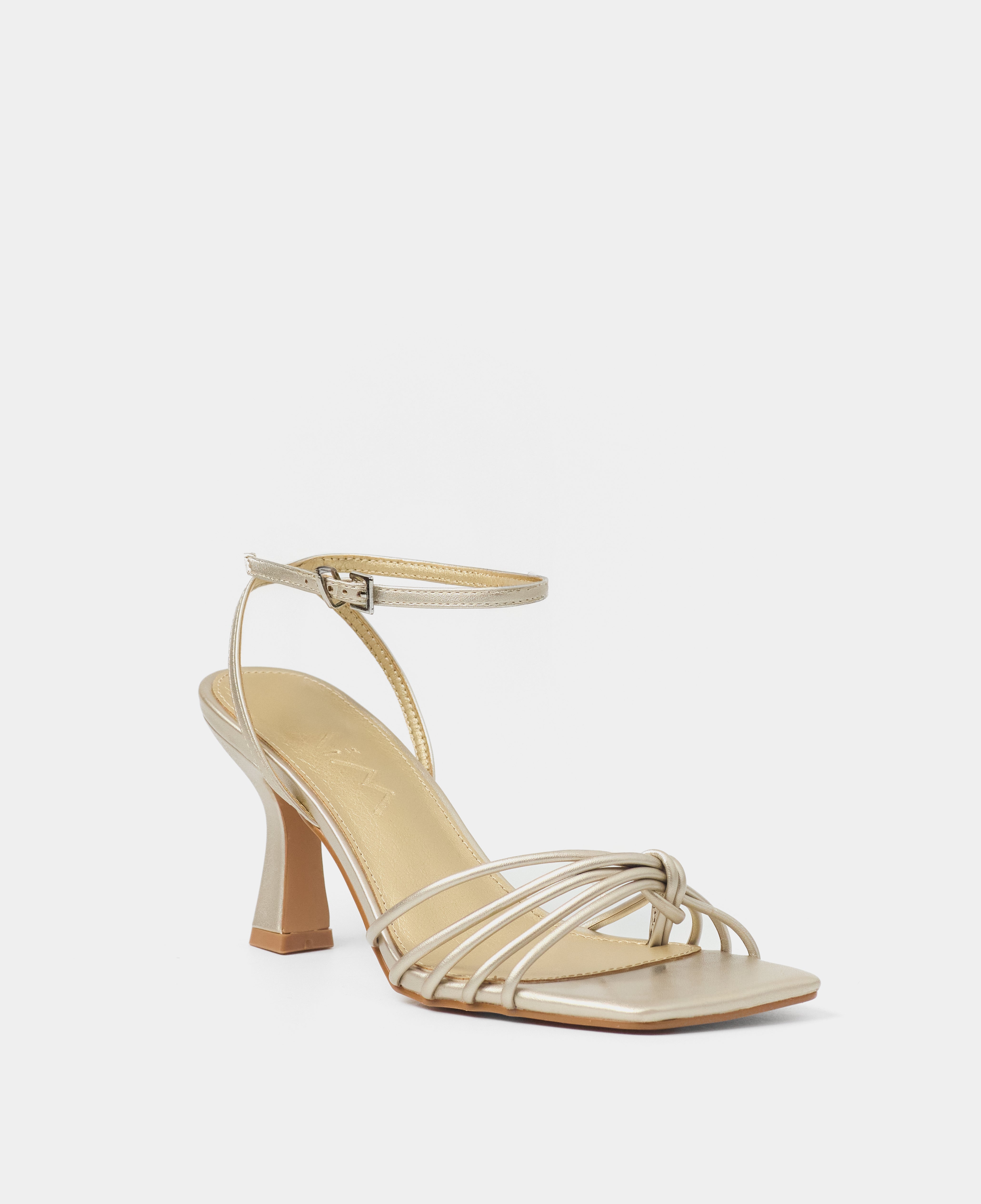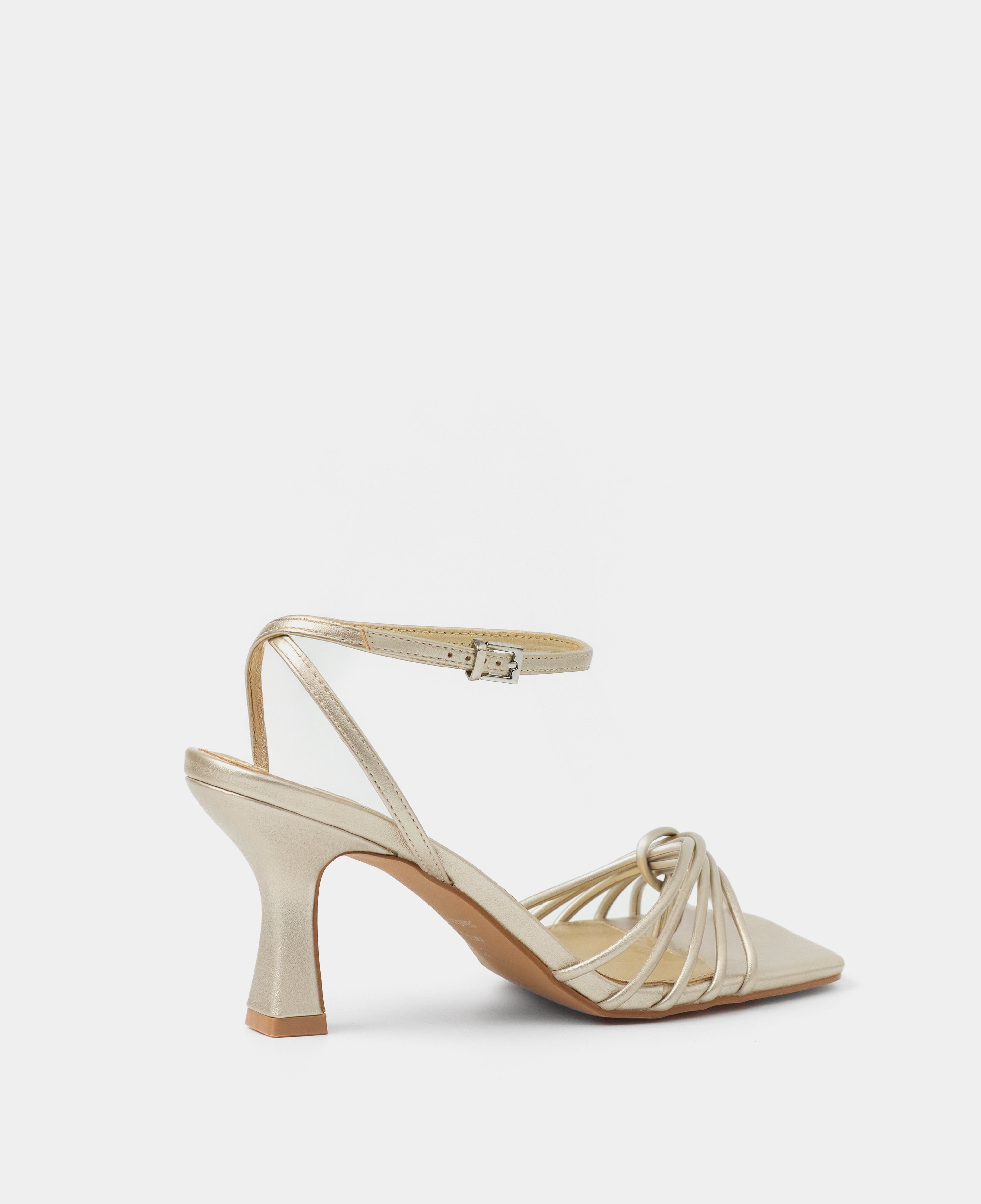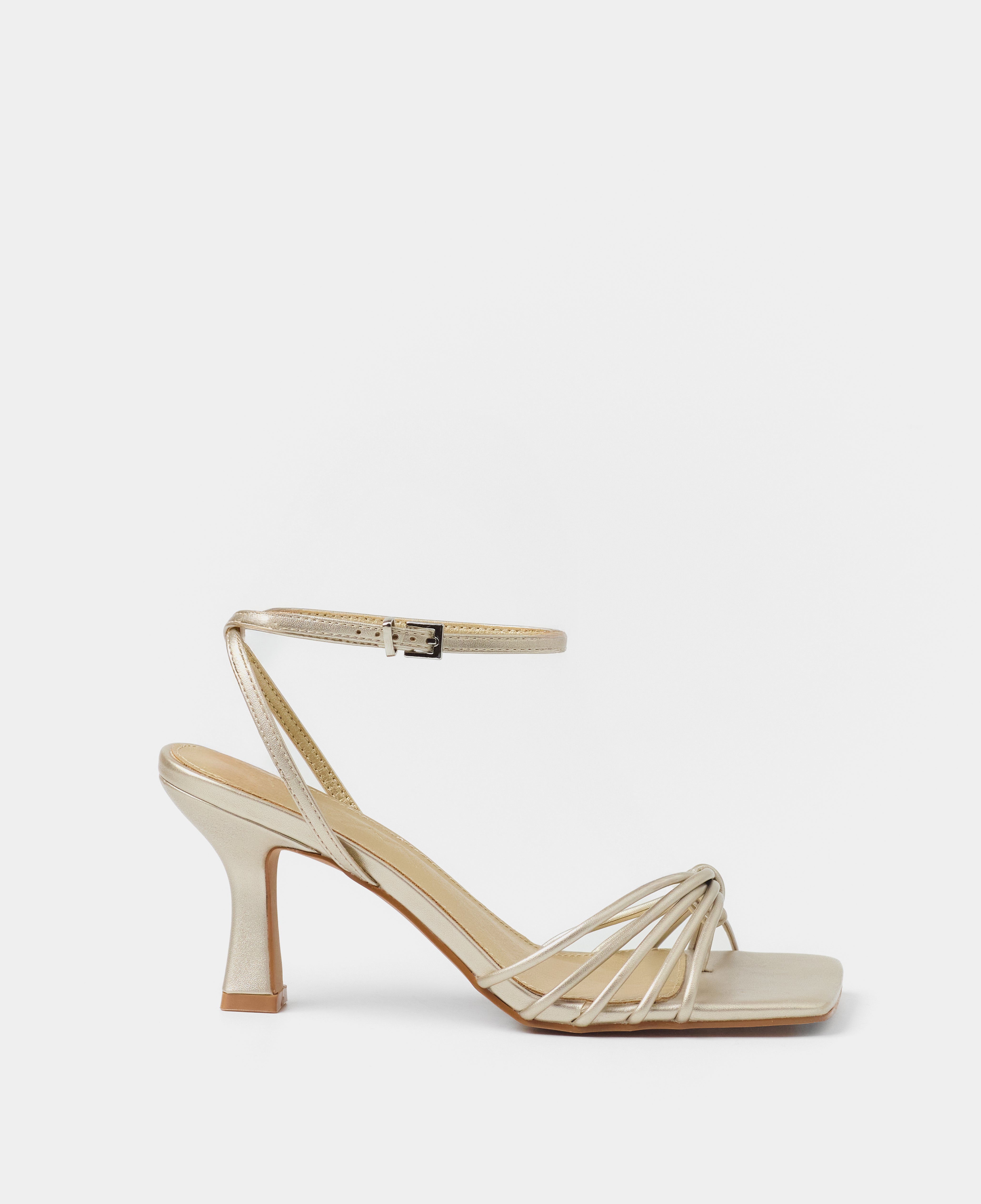 Sandalia de tacón con puntera cuadrada en color champagne. Múltiples tiras en la parte delantera unidas con sujeción en dedo. Tira trasera para sujeción en talón con hebilla. Tacón tipo aguja de base ancha.