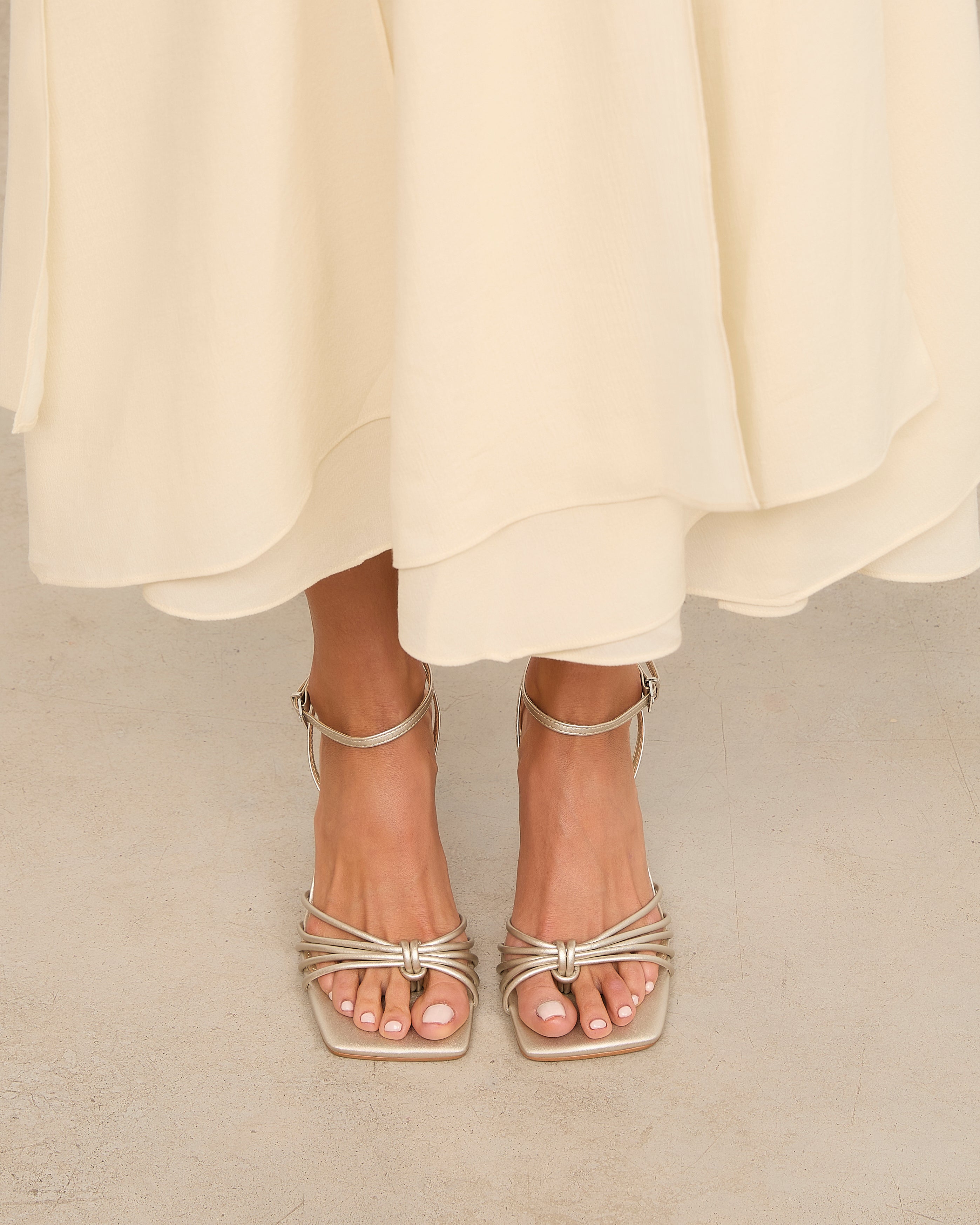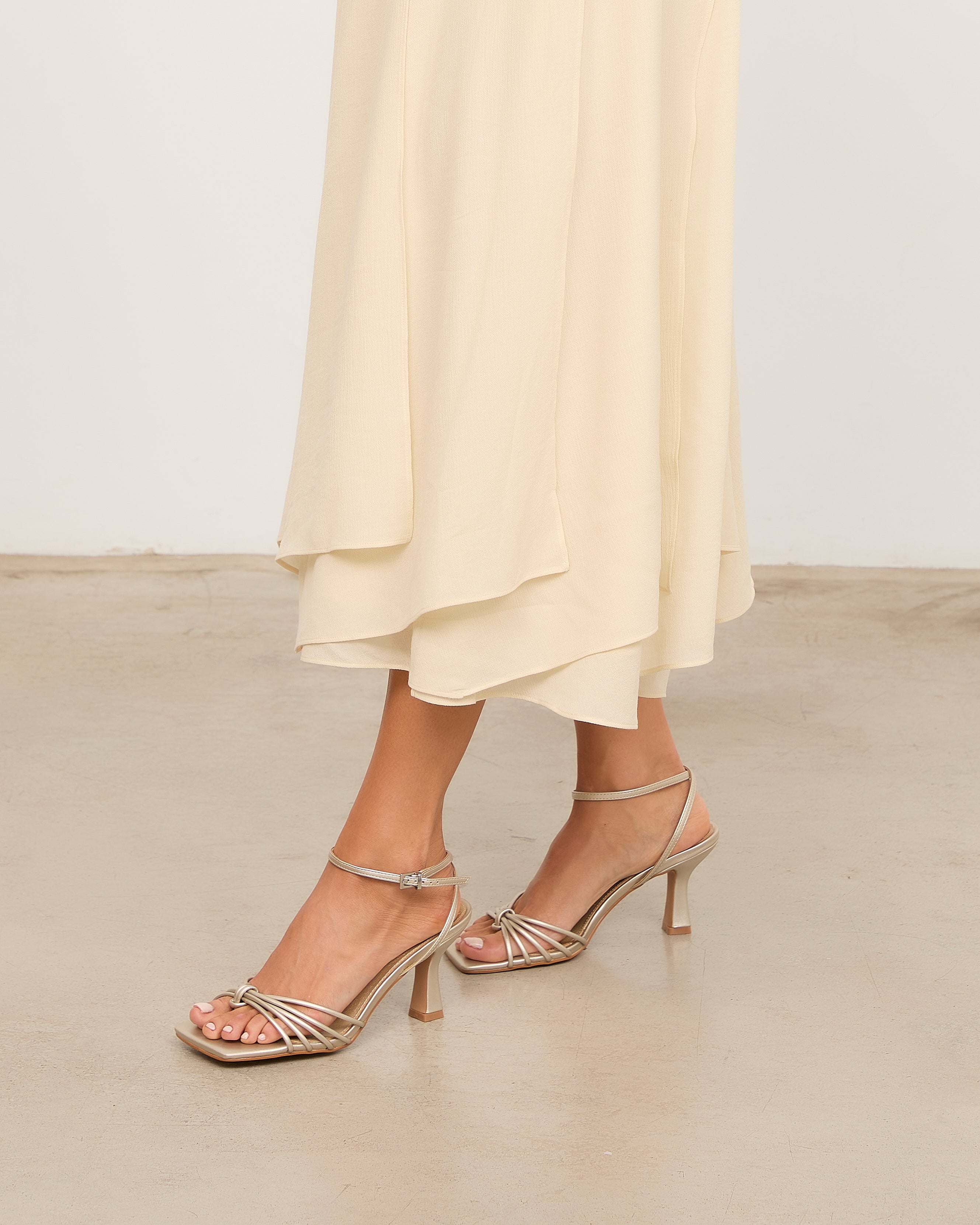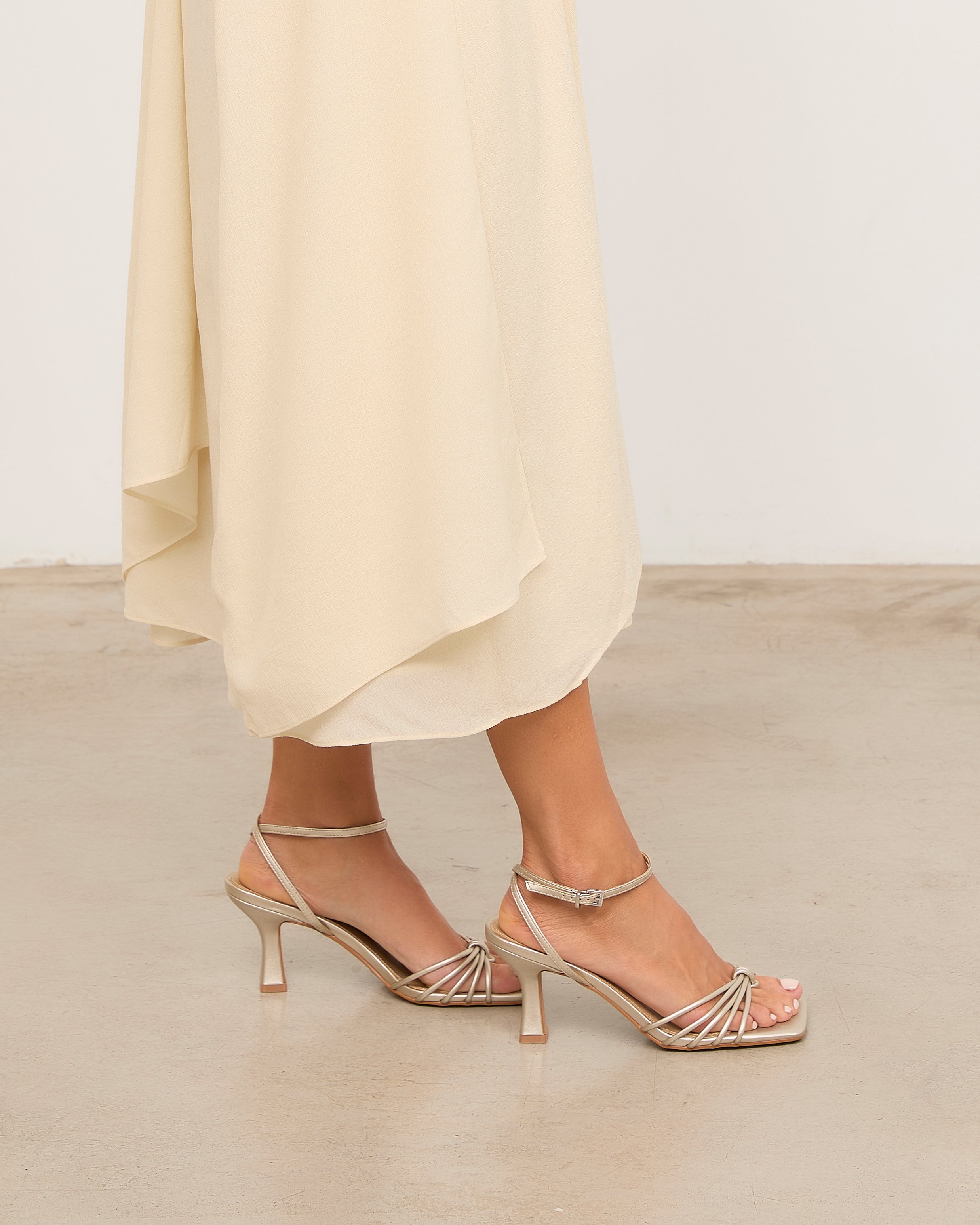 Sandalia de tacón con puntera cuadrada en color champagne. Múltiples tiras en la parte delantera unidas con sujeción en dedo. Tira trasera para sujeción en talón con hebilla. Tacón tipo aguja de base ancha.