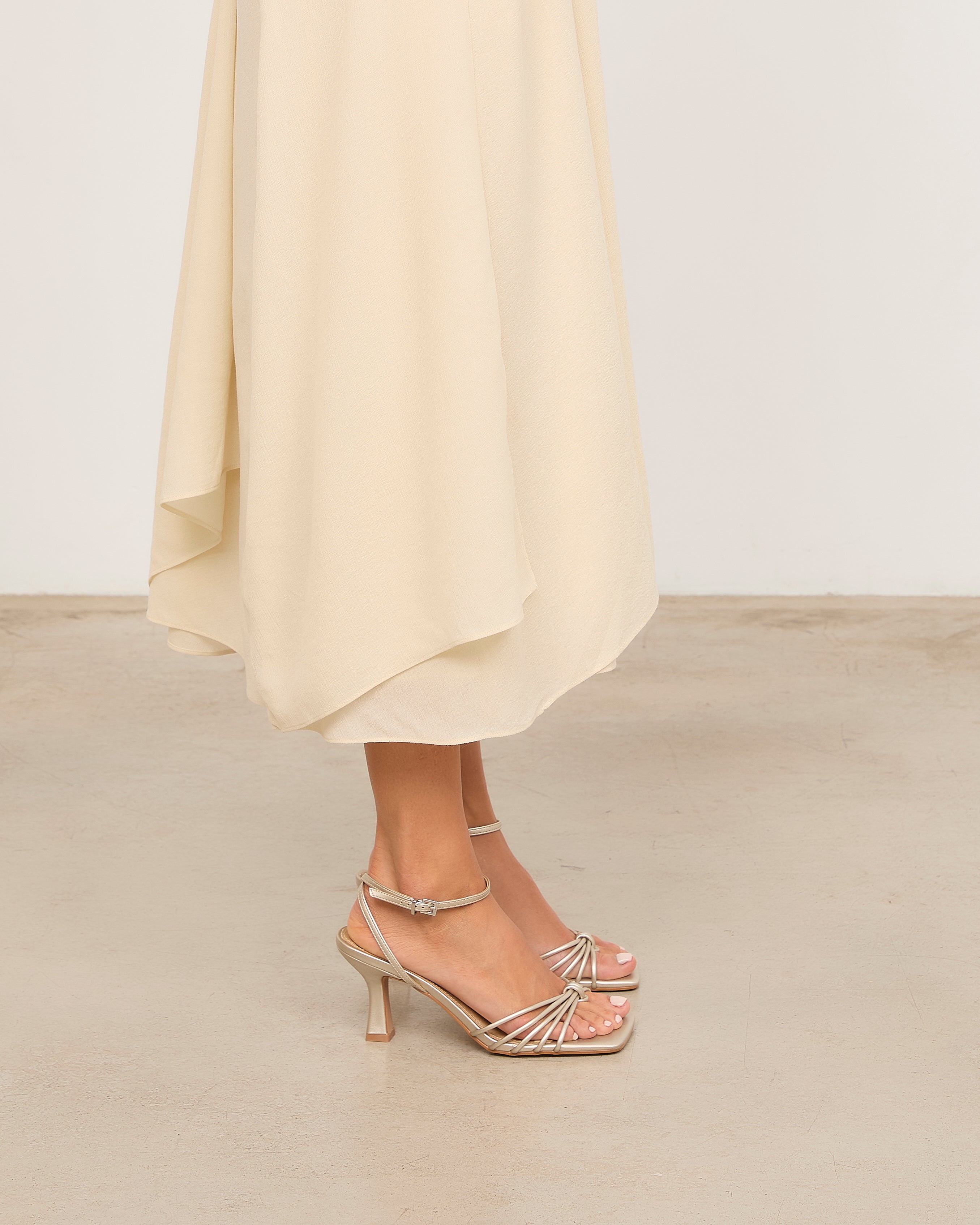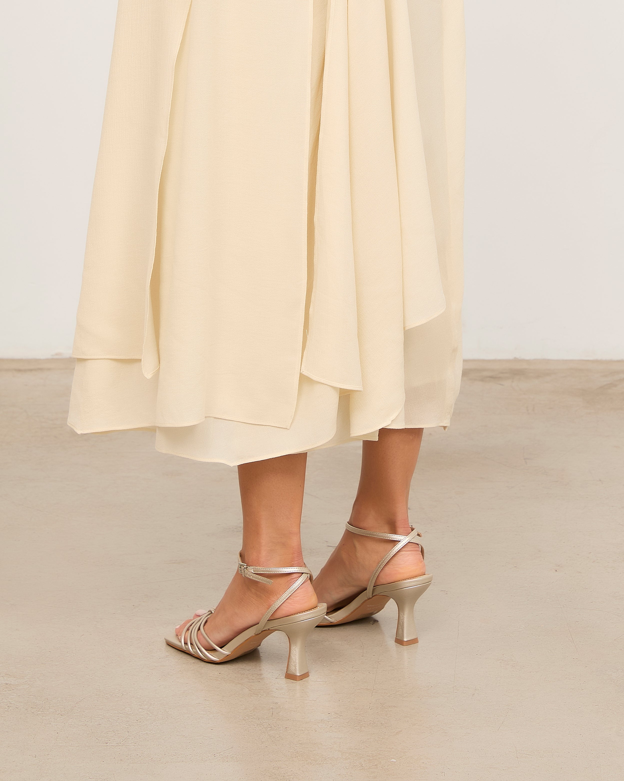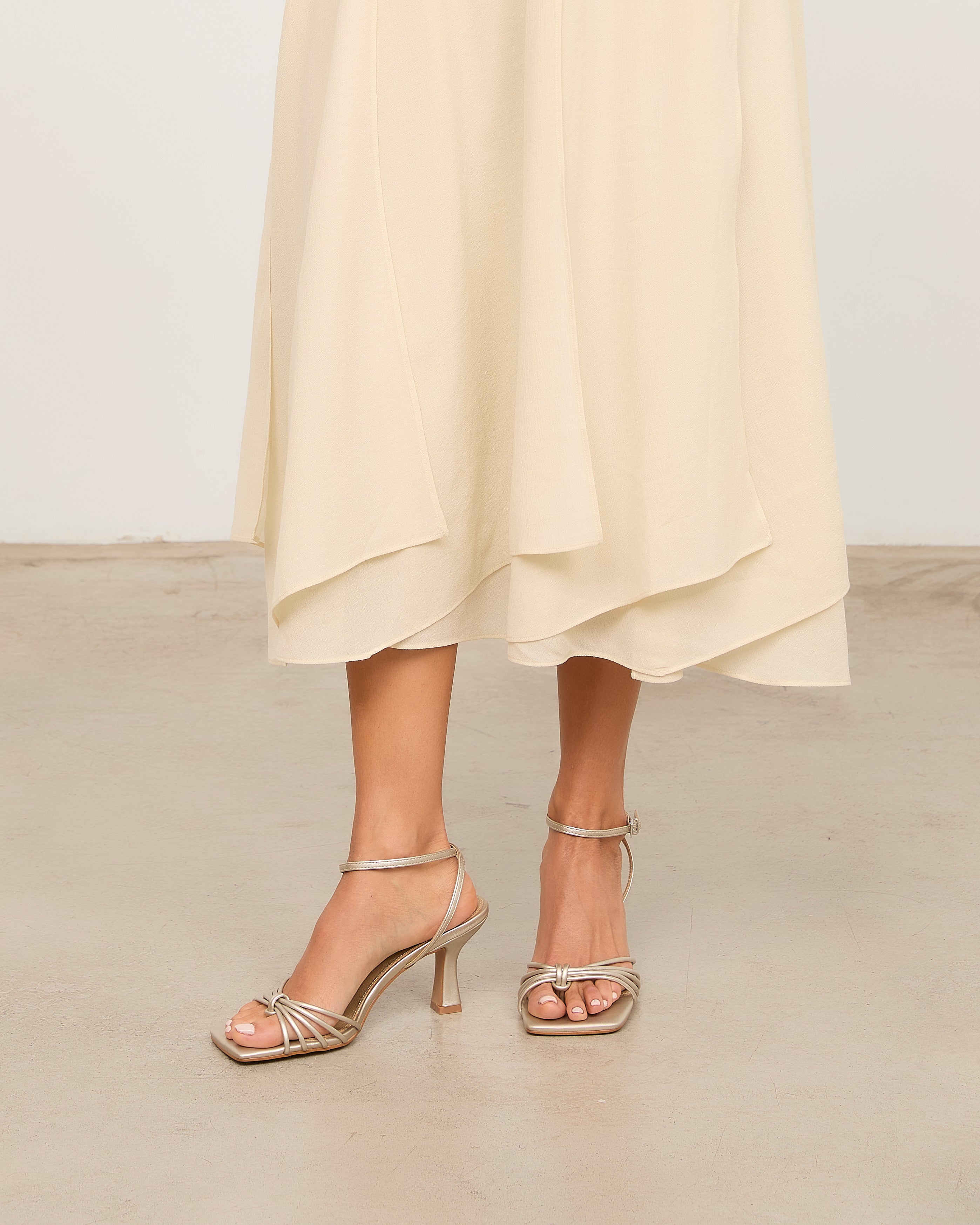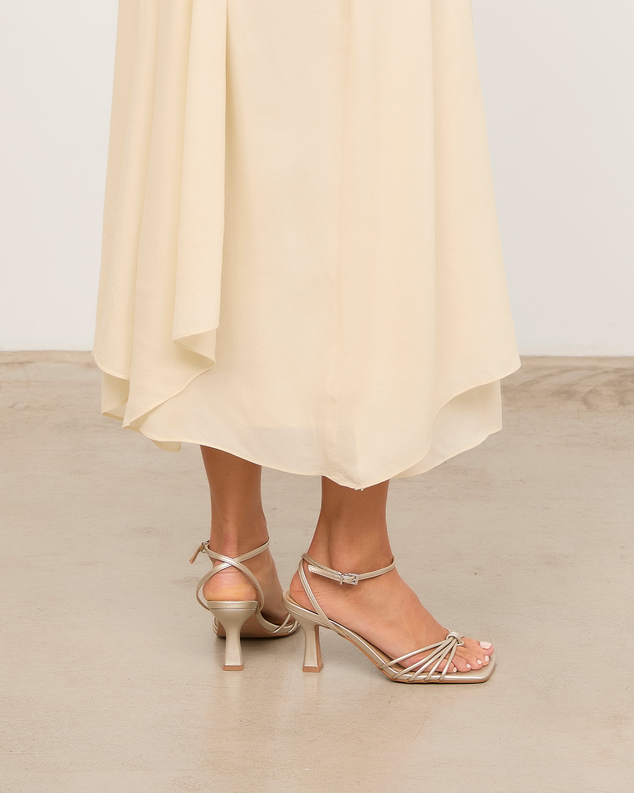 Sandalia de tacón con puntera cuadrada en color champagne. Múltiples tiras en la parte delantera unidas con sujeción en dedo. Tira trasera para sujeción en talón con hebilla. Tacón tipo aguja de base ancha.