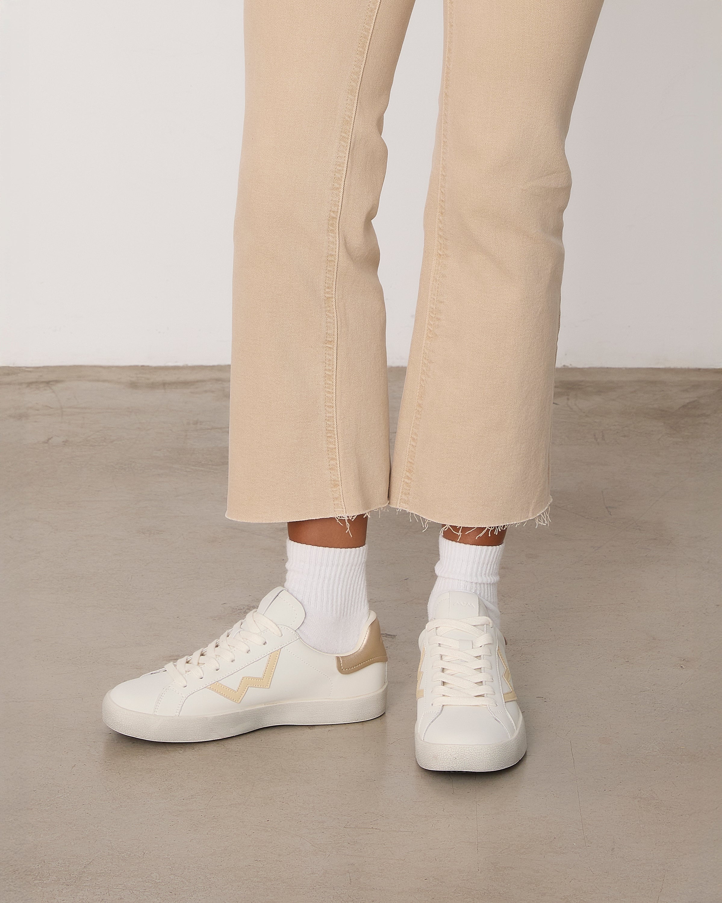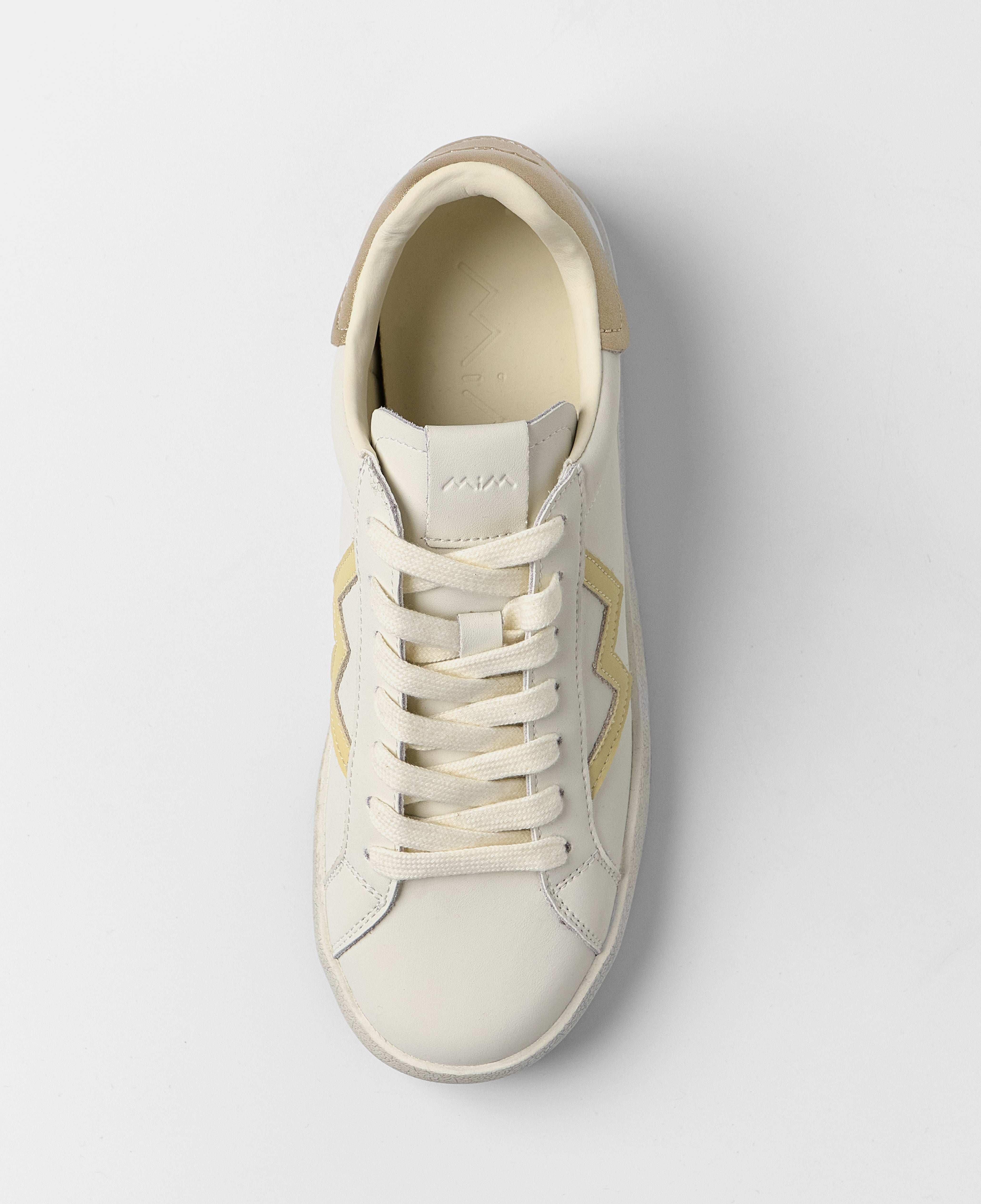 Zapatilla de cordones en piel blanca. Detalla de logo en amarillo y trasera a contraste en dorado.