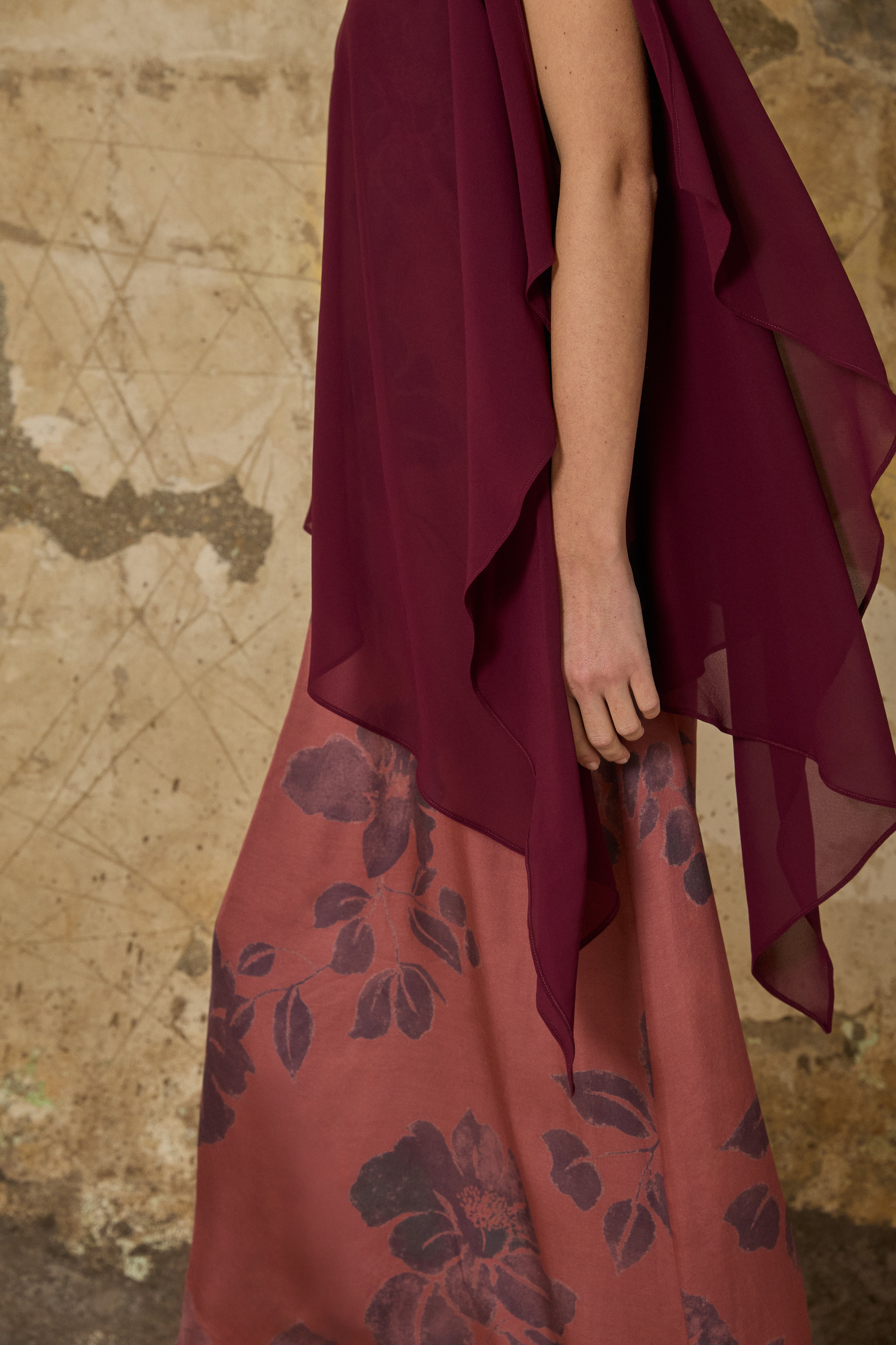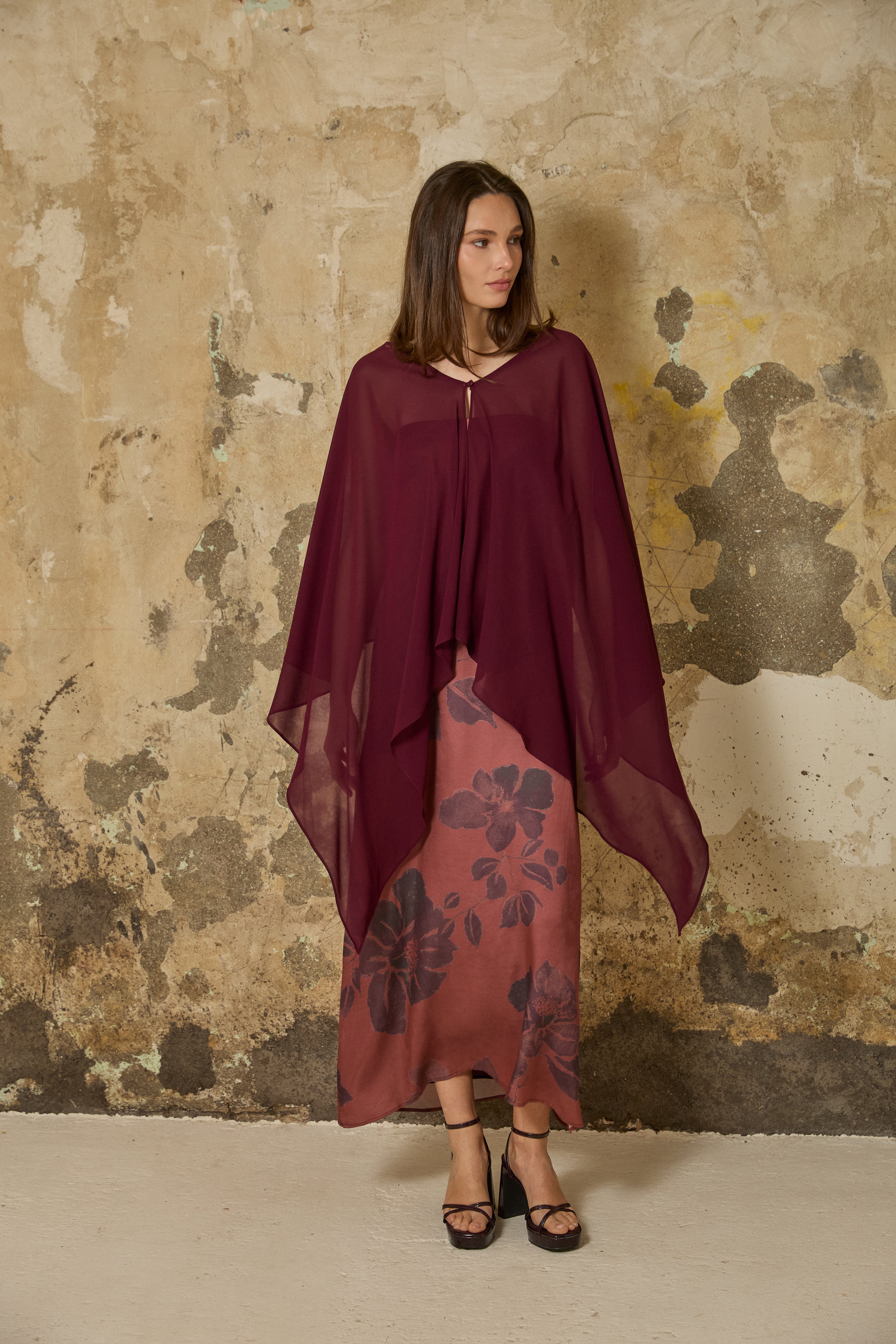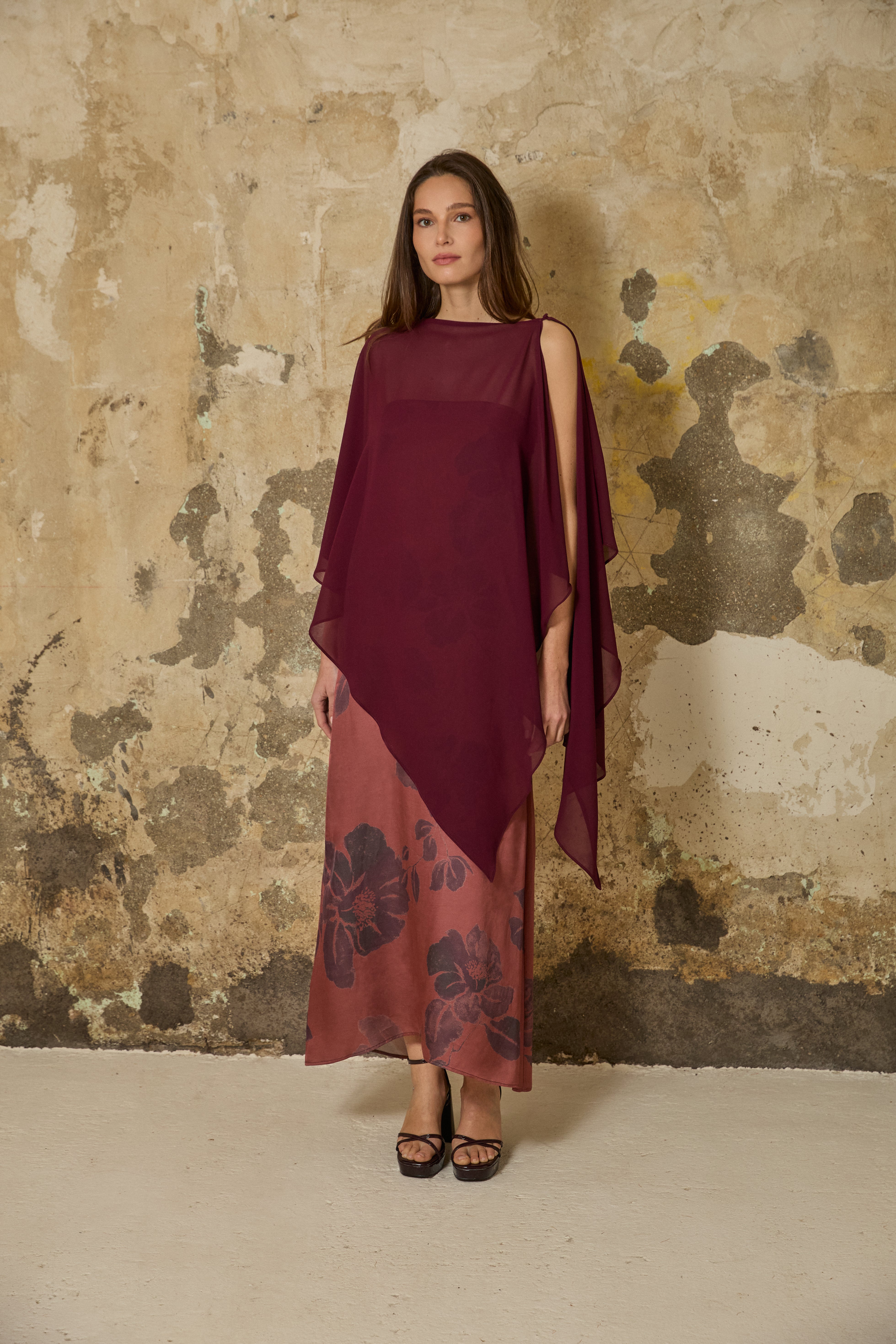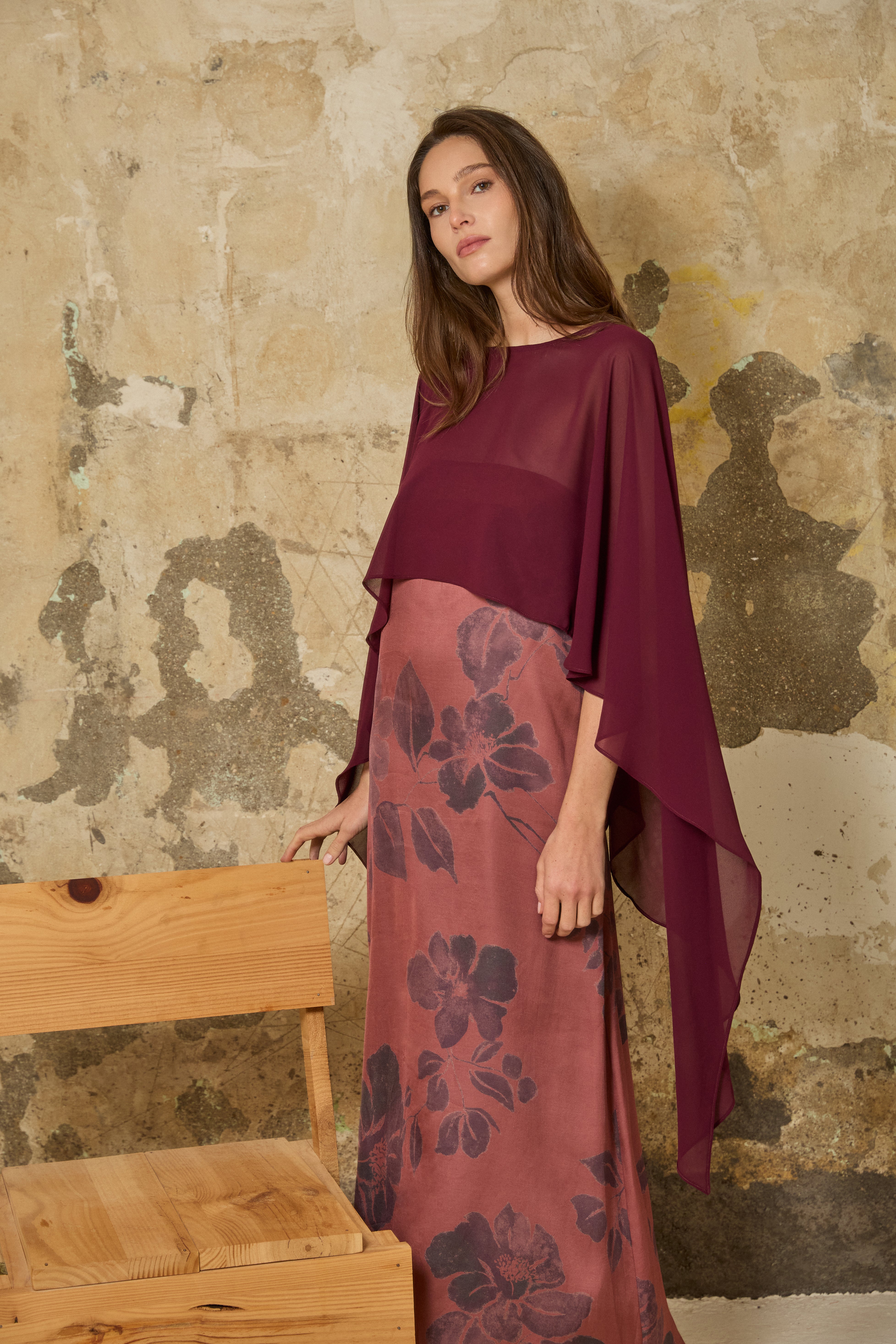 Capa de gasa multiposición con corte asimétrico en berenjena. Posible ajuste con botón entelado.