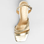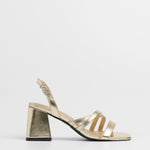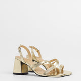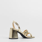 Sandalia de tacón en color dorado brillante. Parte delantera abierta con varias tiras. Tacón cuadrado. Cierre con tira al talón con hebilla metálica.
