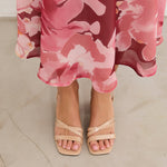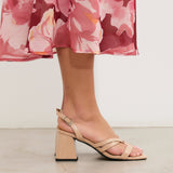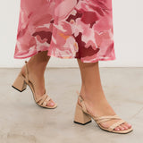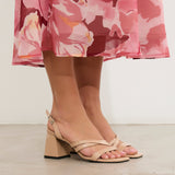 Sandalia de tacón en color nude con puntera cuadrada. Parte delantera abierta con varias tiras. Tacón cuadrado. Cierre con tira al talón con hebilla metálica.