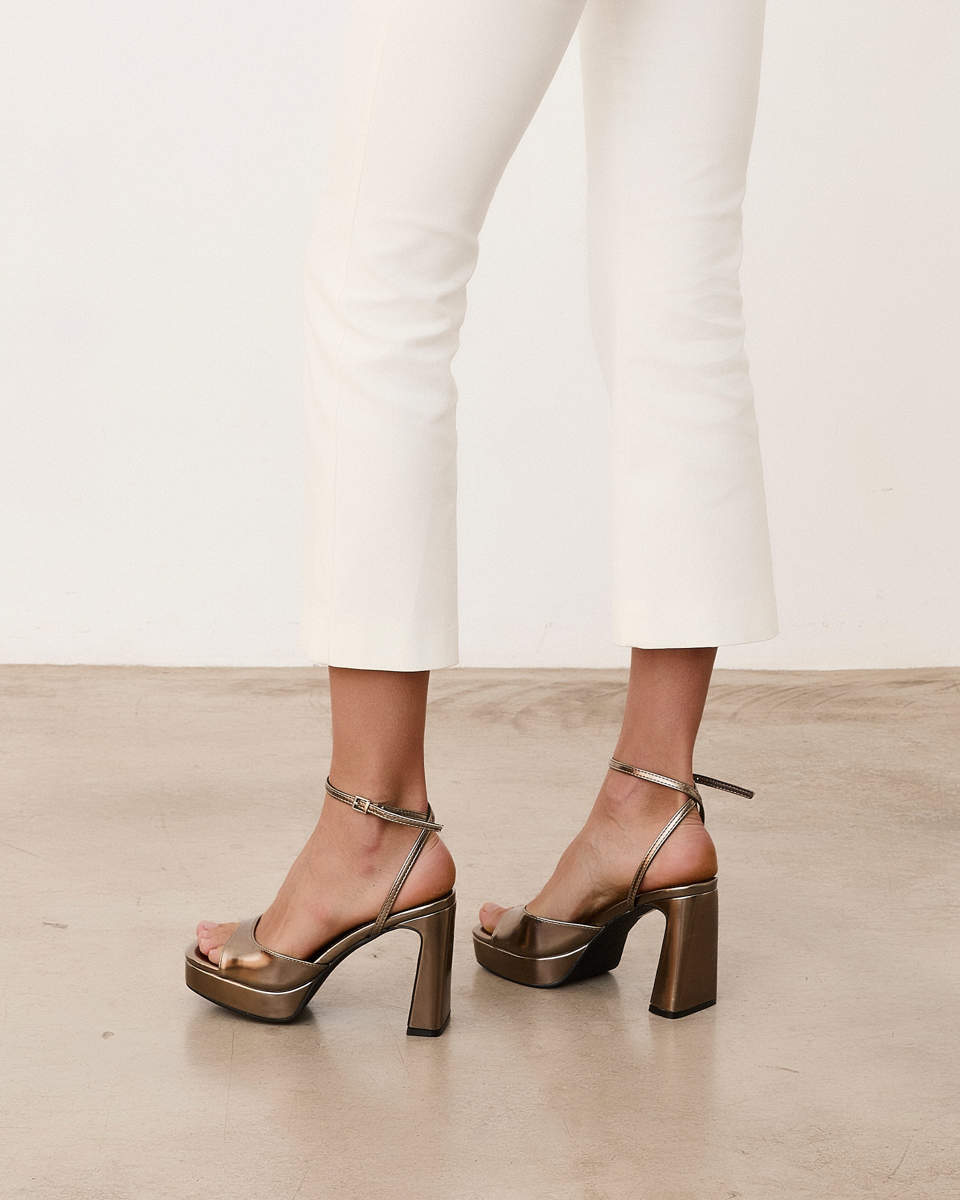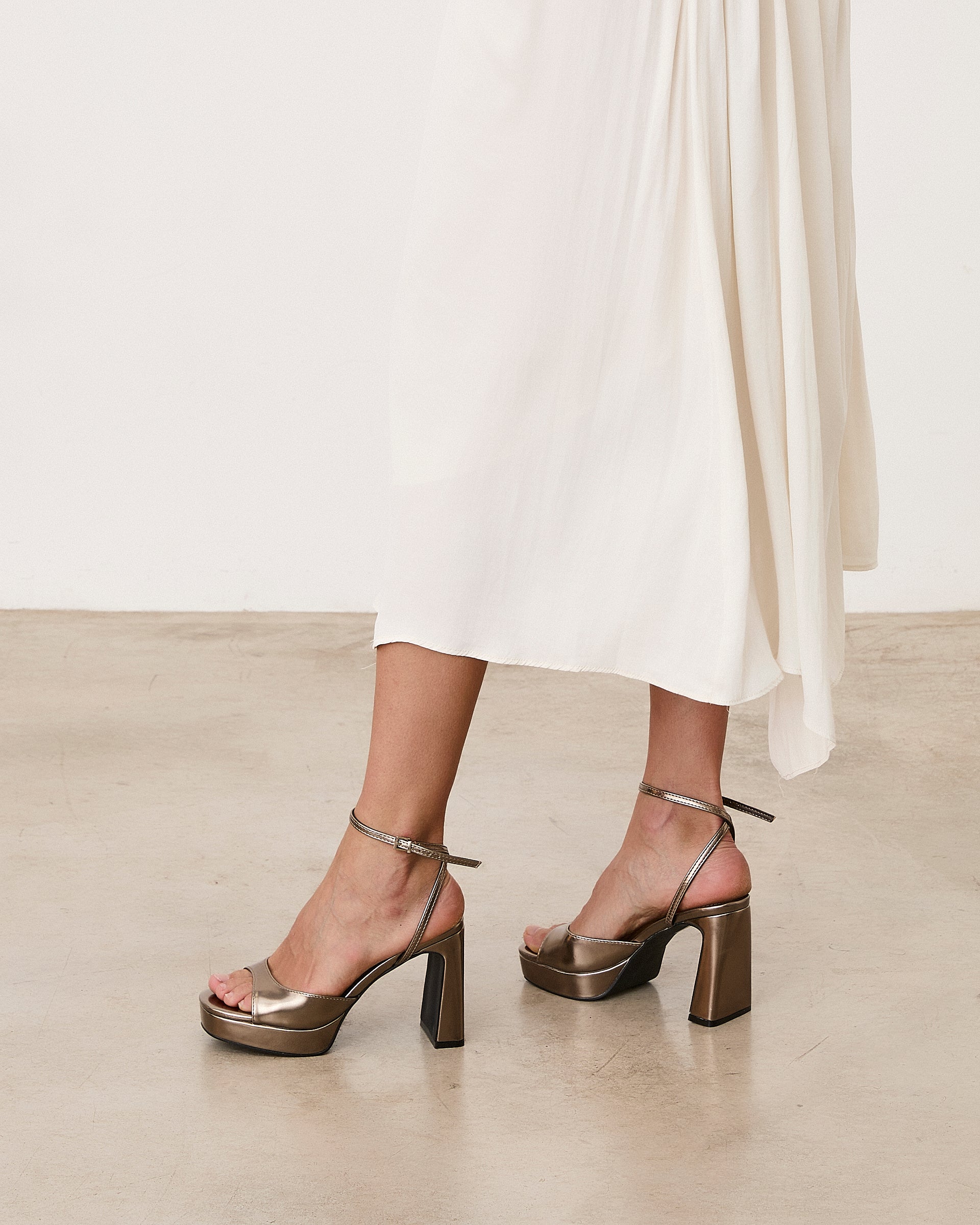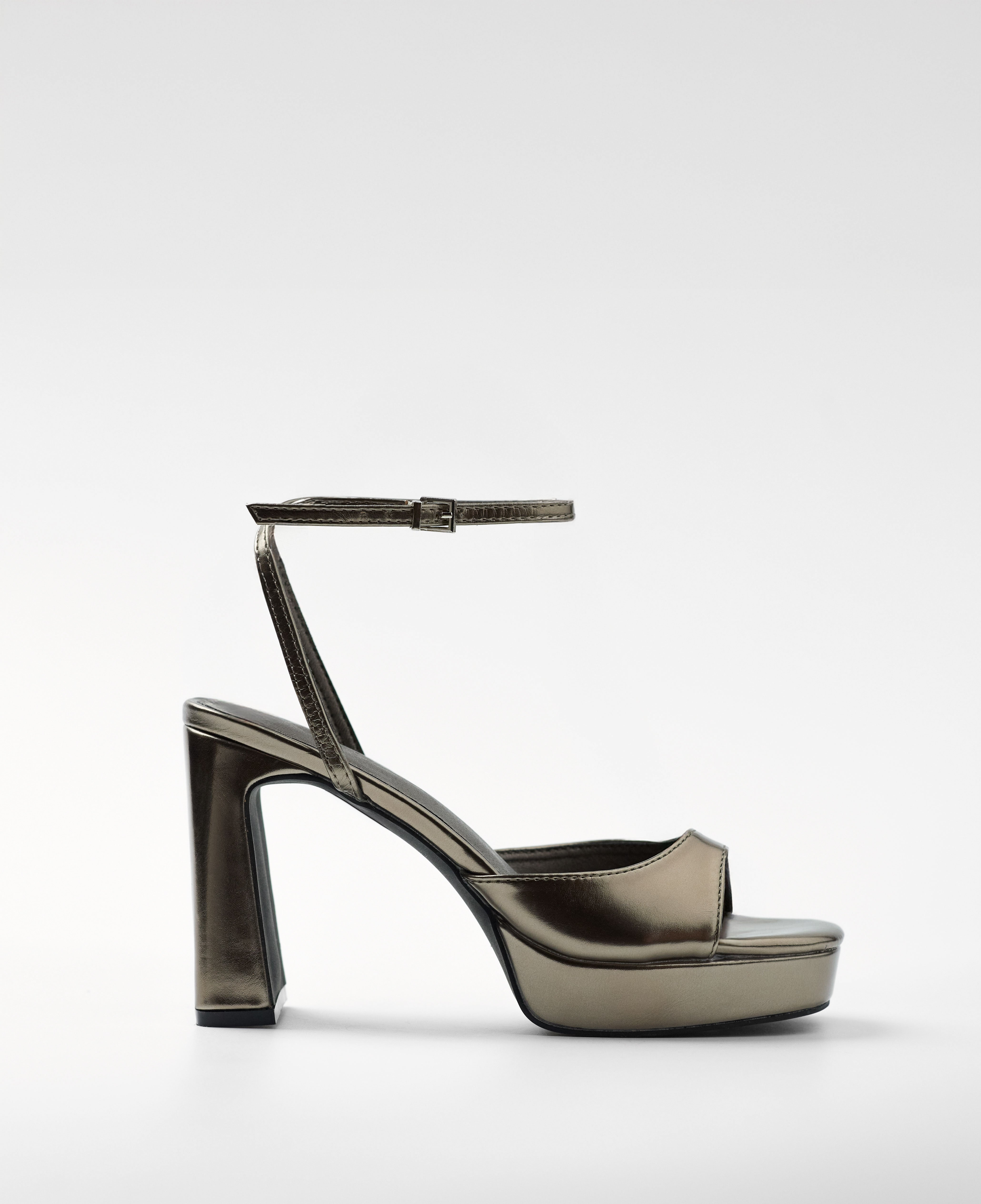 Sandalia de tacón con plataforma en color metalizado. Tira ancha en la parte frontal y cierre con pulsera al tobillo. Tacón rectangular.