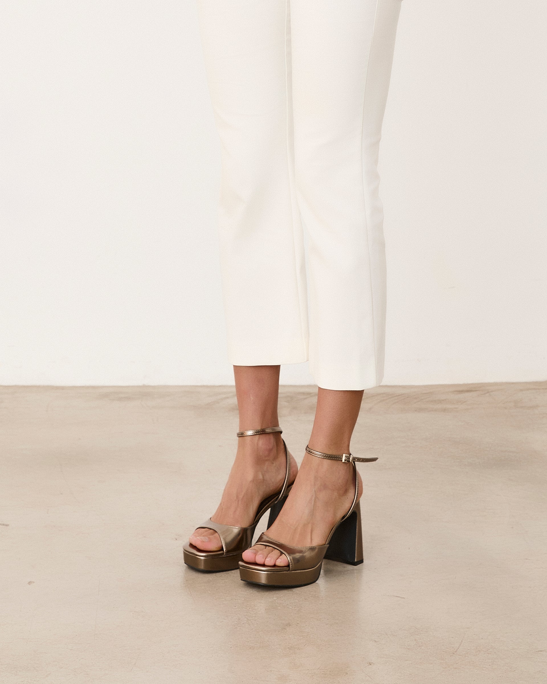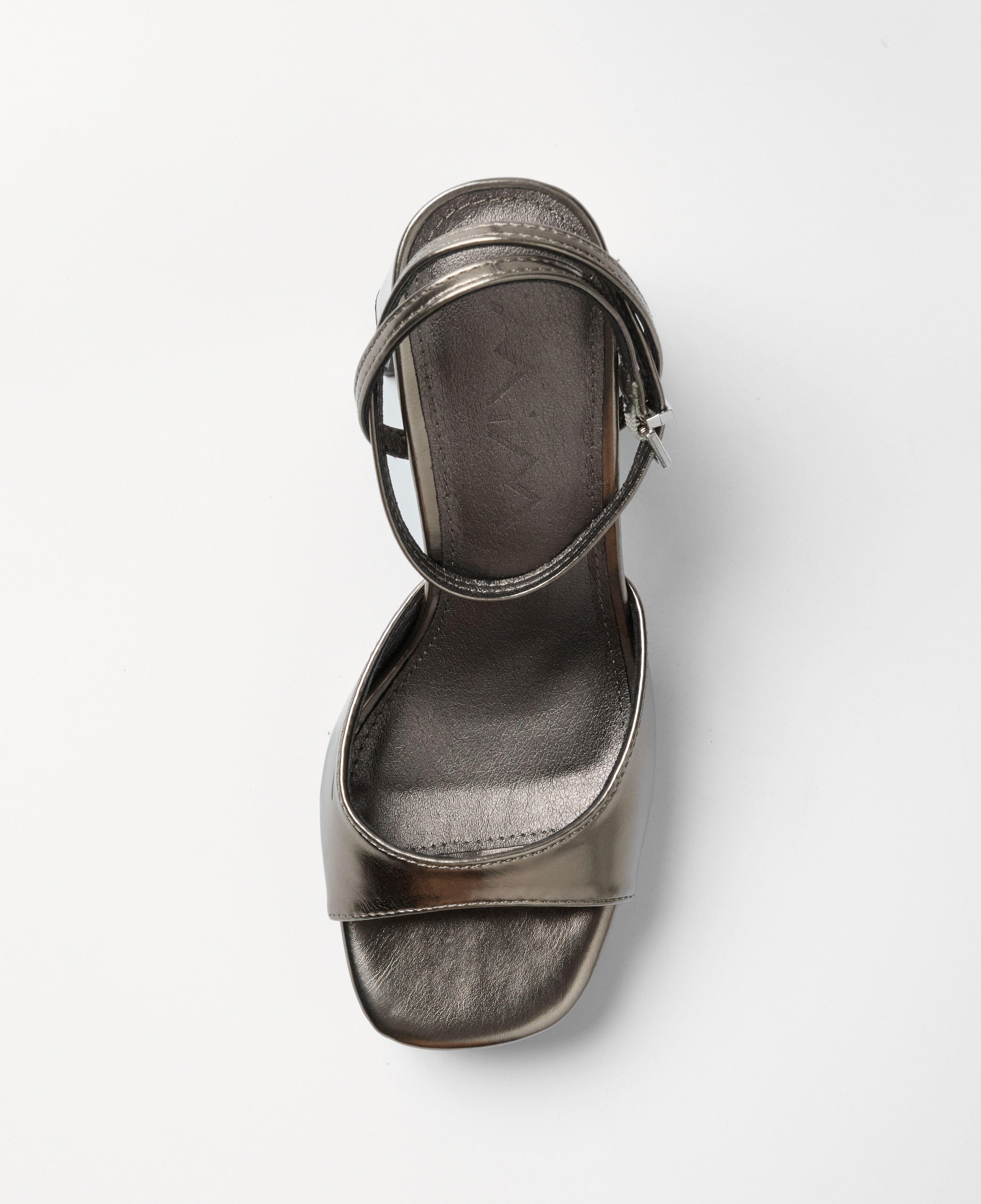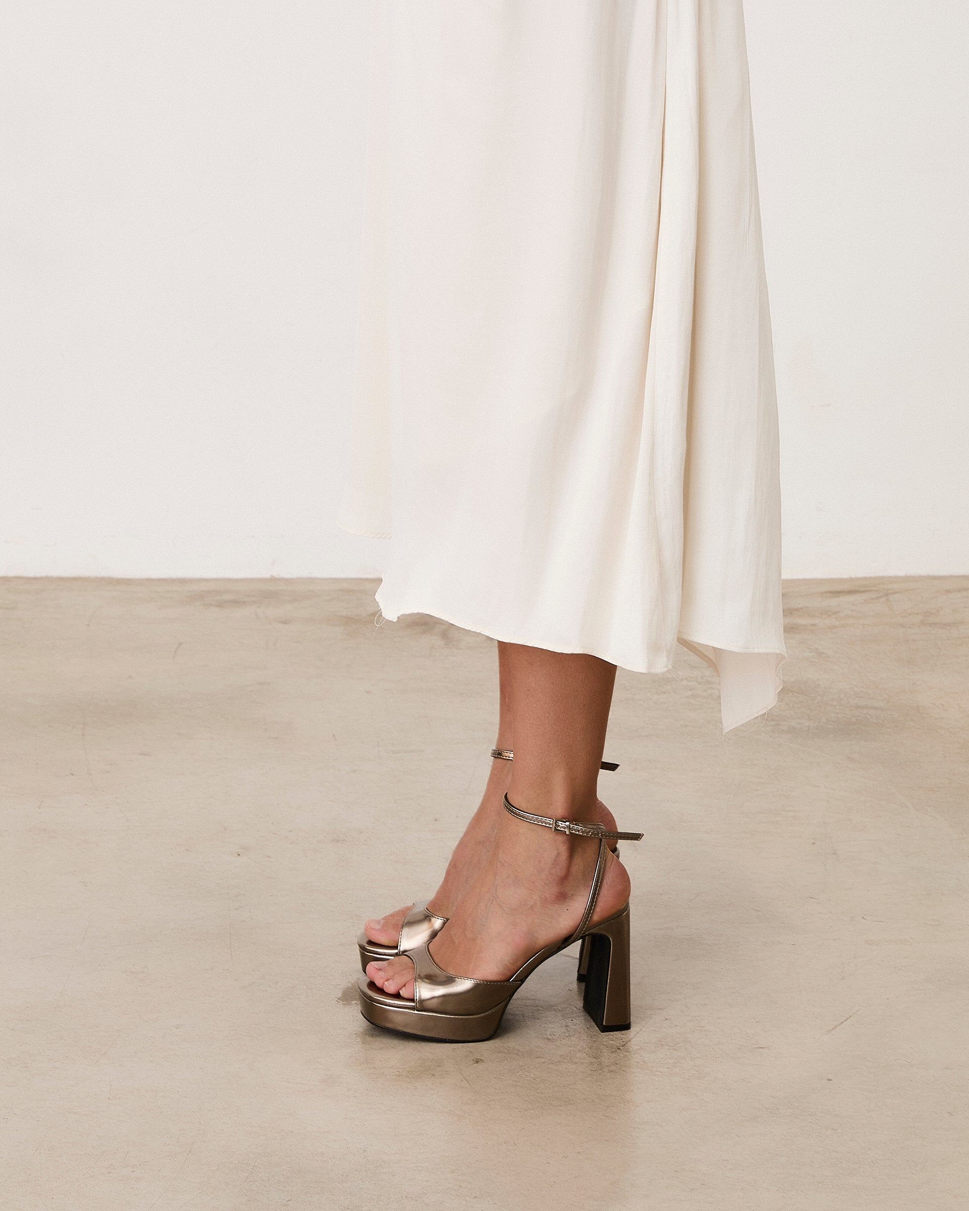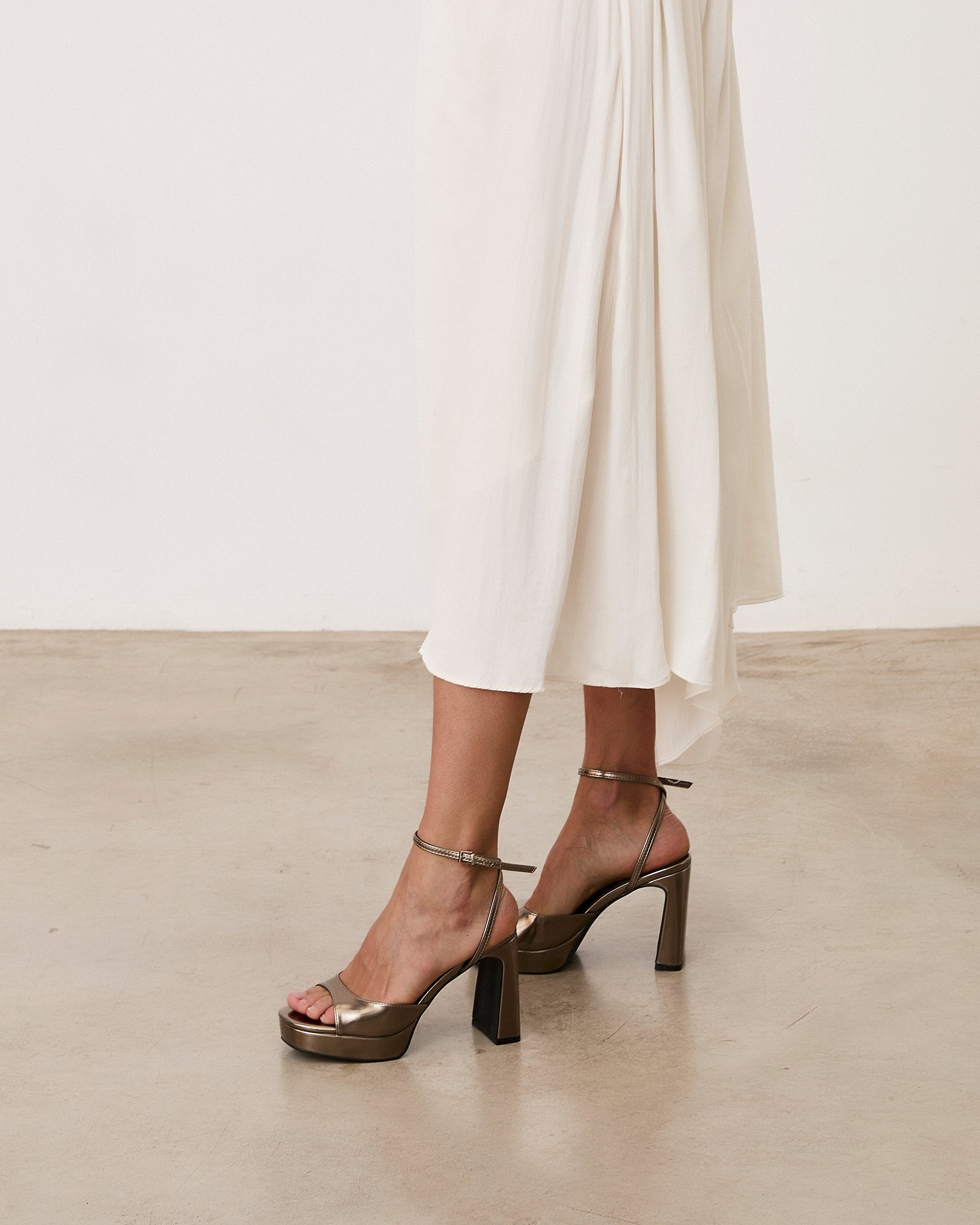 Sandalia de tacón con plataforma en color metalizado. Tira ancha en la parte frontal y cierre con pulsera al tobillo. Tacón rectangular.
