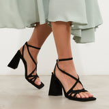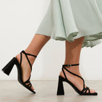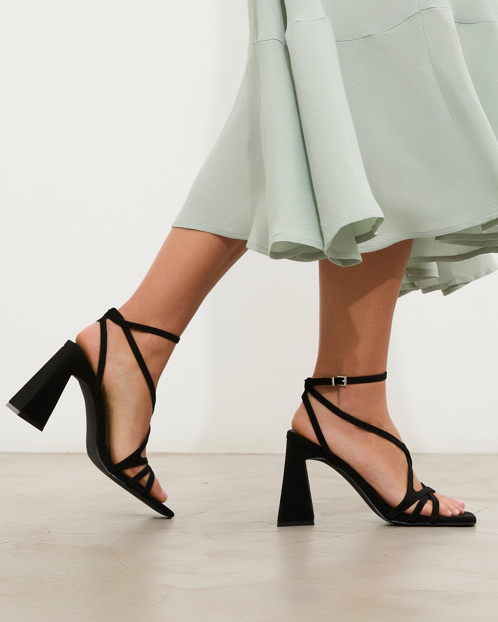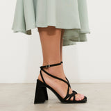 Sandalia de tacón con puntera cuadrada en color negro. Compuesto por tiras cruzadas en el empiene con cierre en tobillo con hebilla. Tacón ancho geométrico.