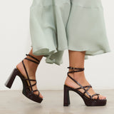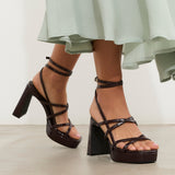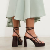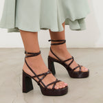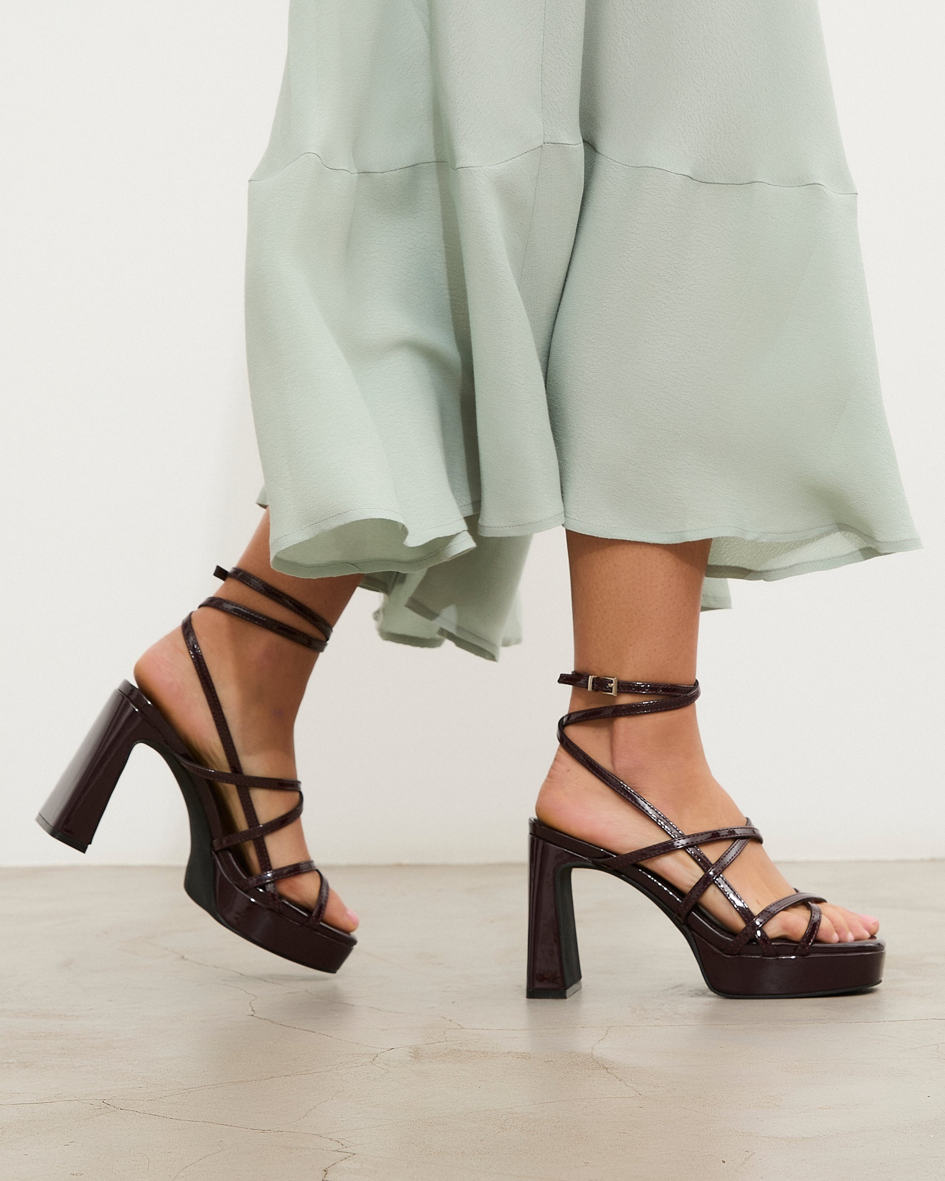 Sandalia de tacón y plataforma color burdeos. Parte delantera abierta con tiras y tacón rectangular. Cierre de pulsera al tobillo con hebilla metálica.