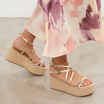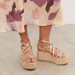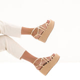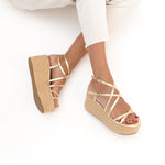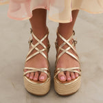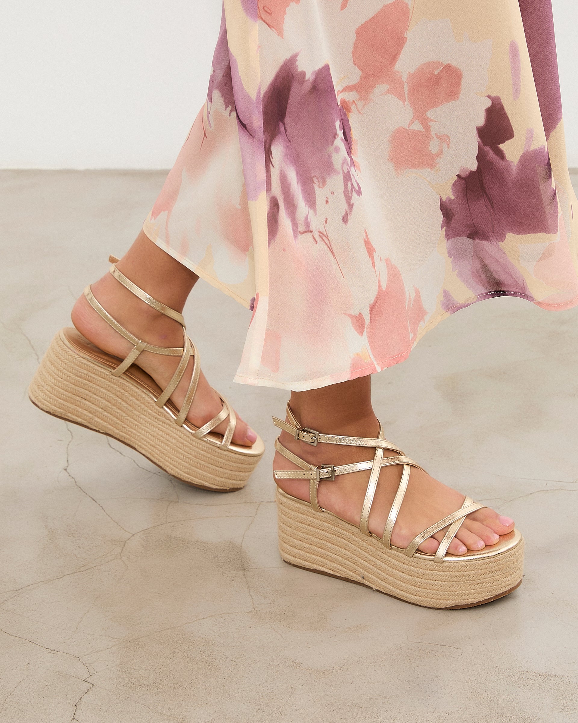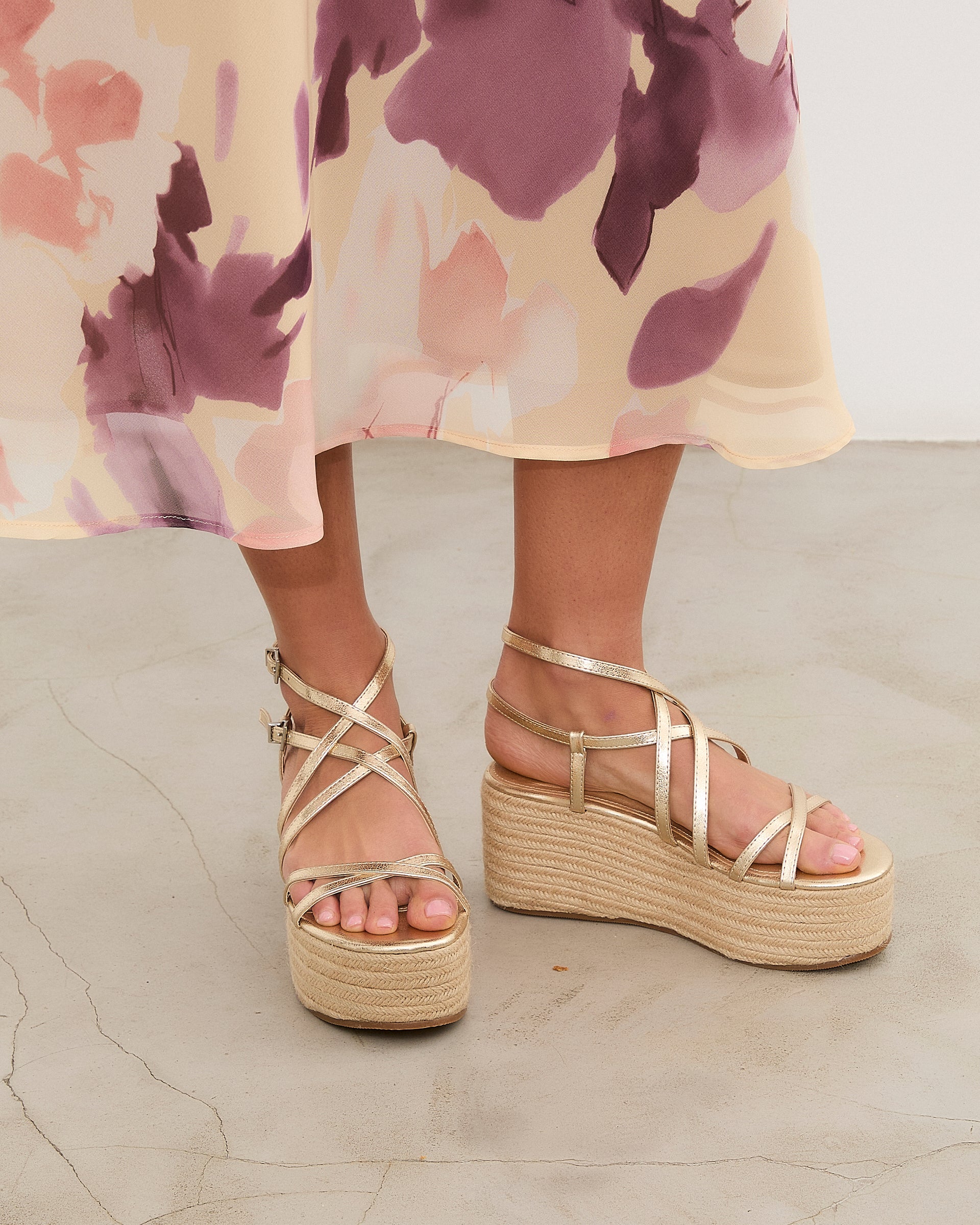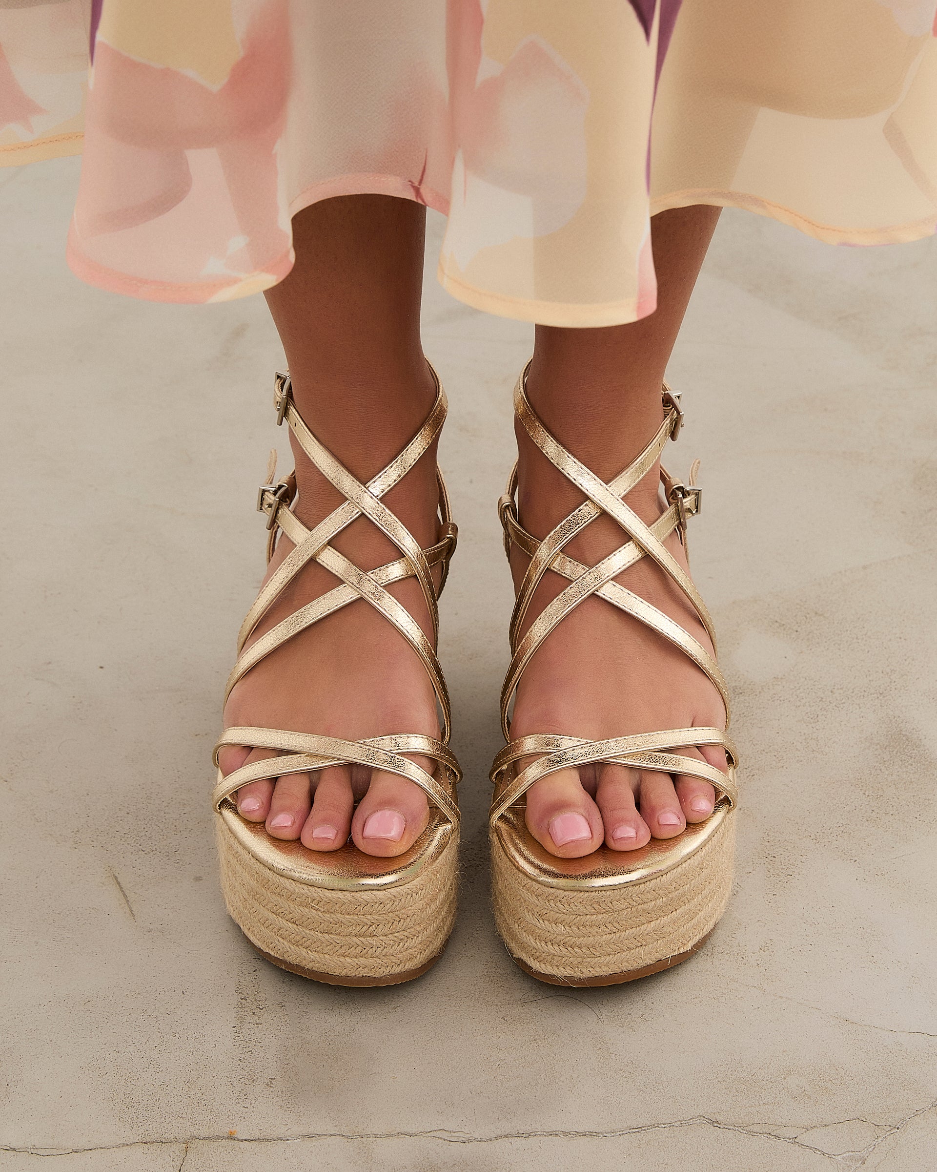 Sandalia con plataforma de esparto color dorado con tiras a diferentes niveles y con doble hebilla para atar alrededor del tobillo.