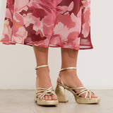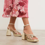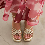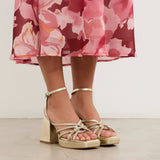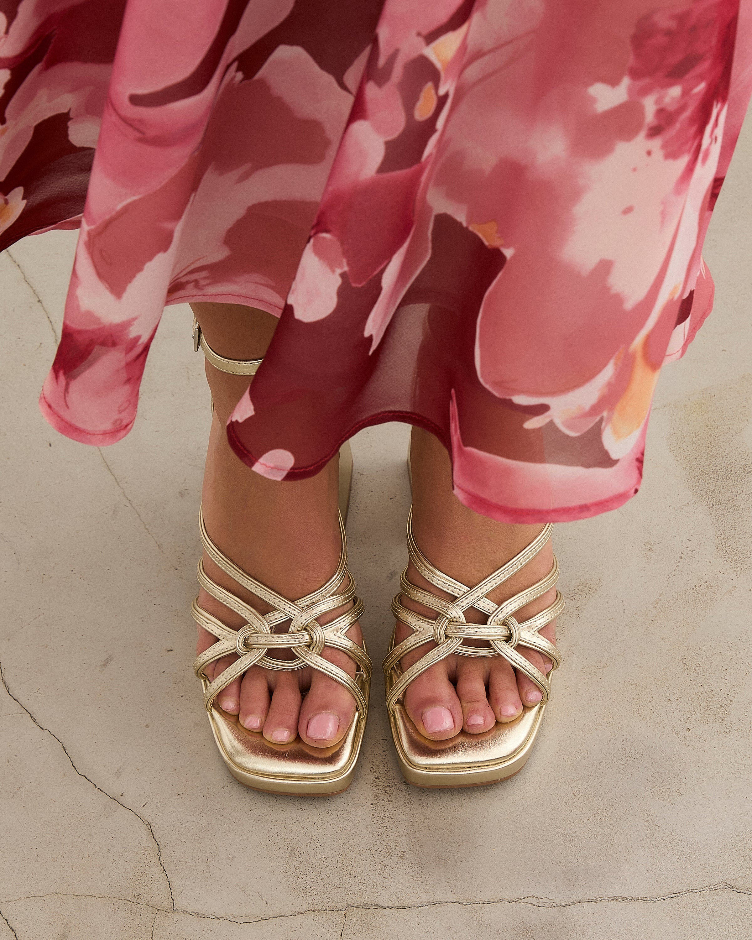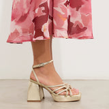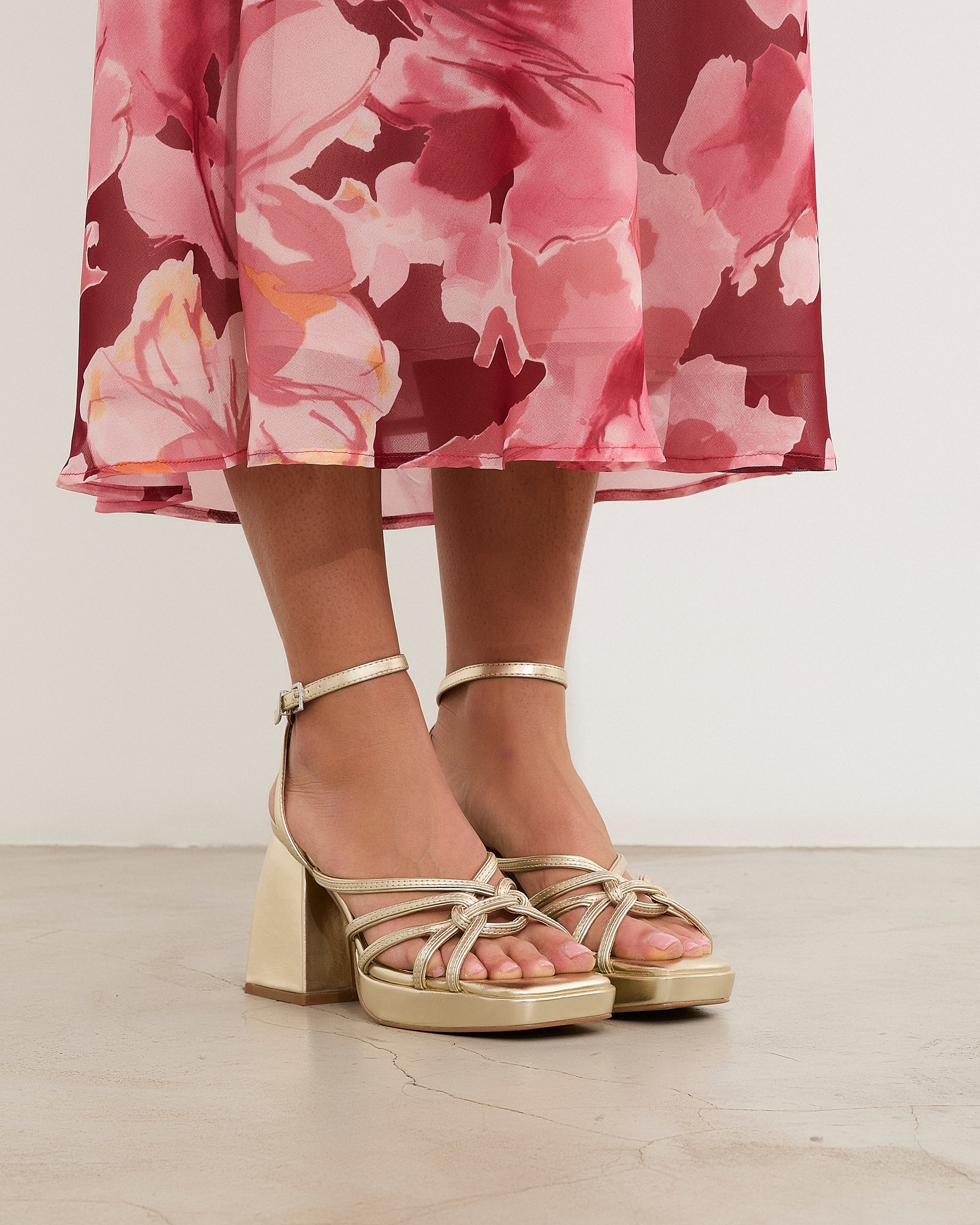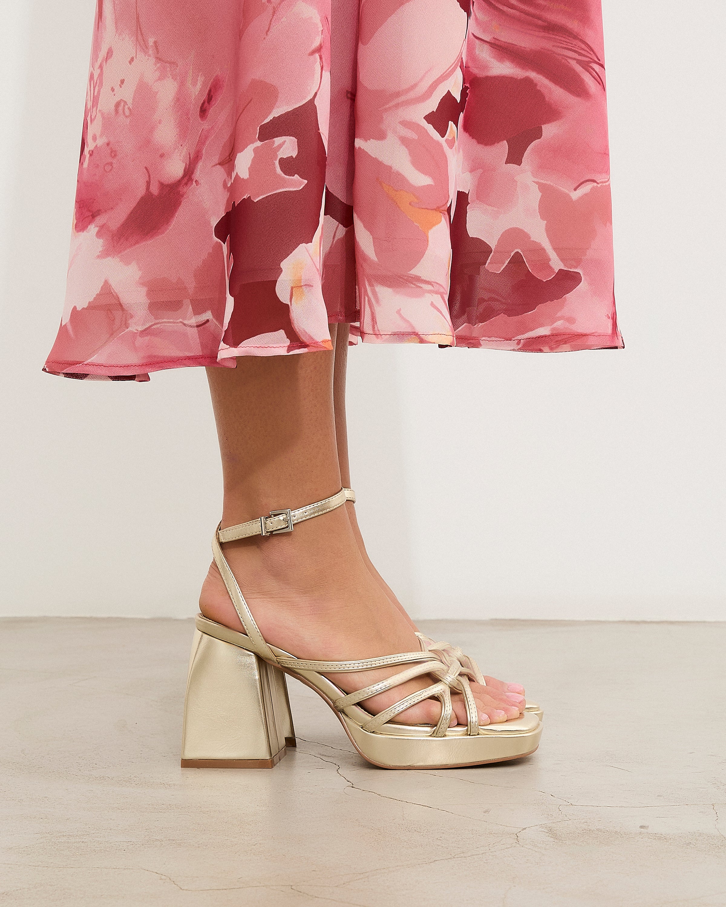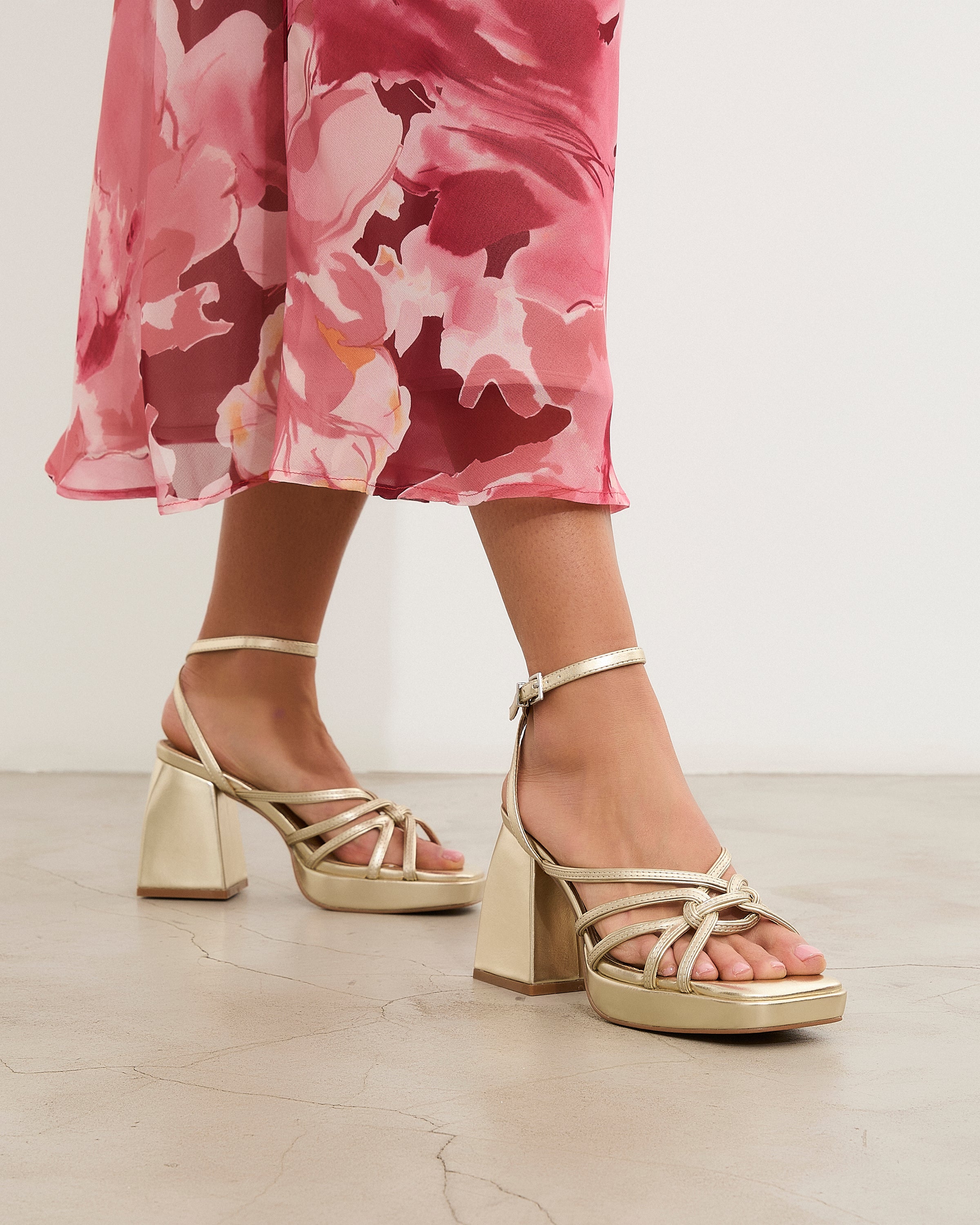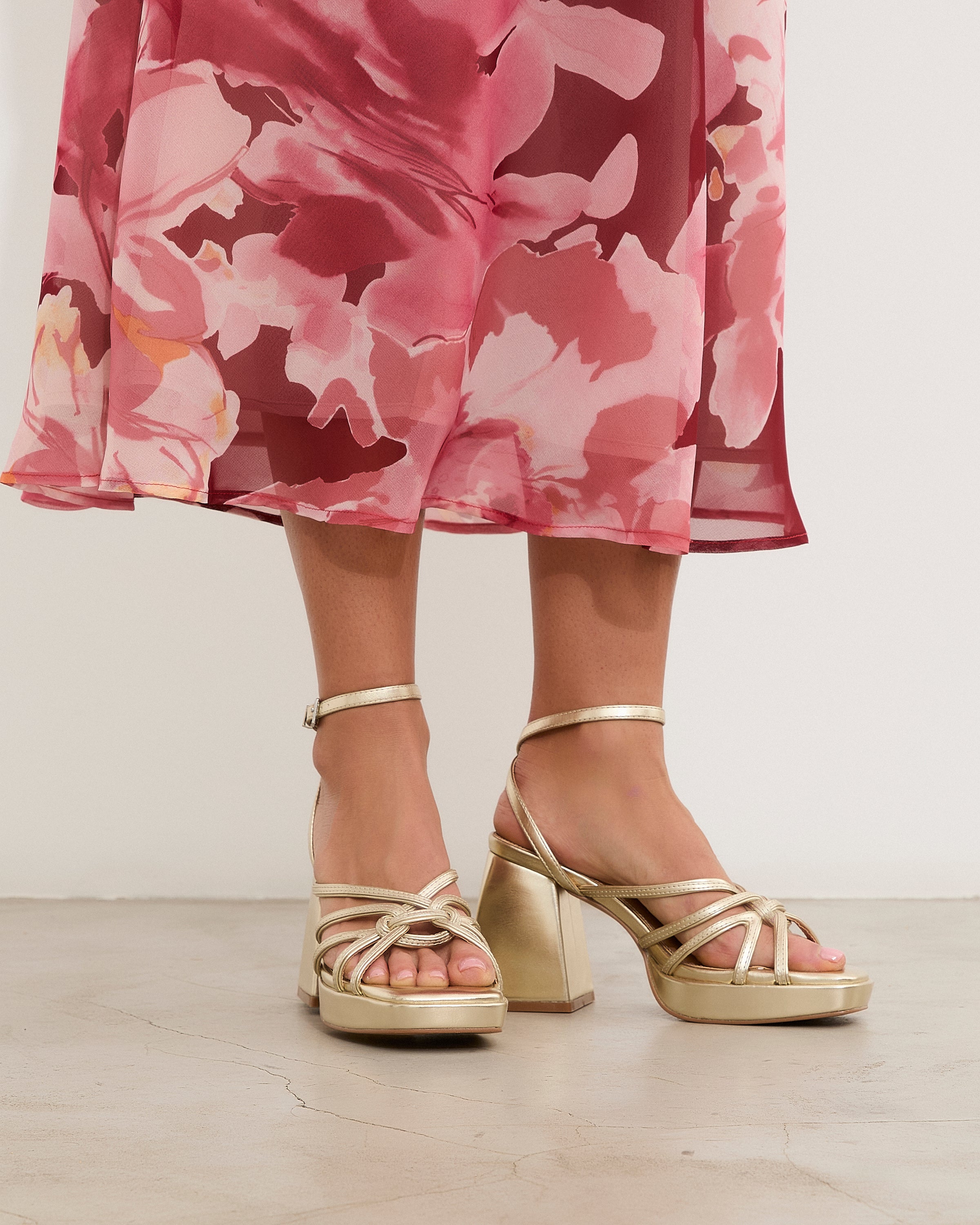 Sandalia de tacón en piel vegana color dorado. Parte delantera abierta cuadrada con plataforma y varias tiras delanteras. Cierre de pulsera al tobillo con hebilla metálica.