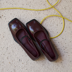 Zapato plano en burdeos. Parte delantera cerrada en punta cuadrada y trasera cerrada con tacón cuadrado. Cierre en tira elástica delantera.