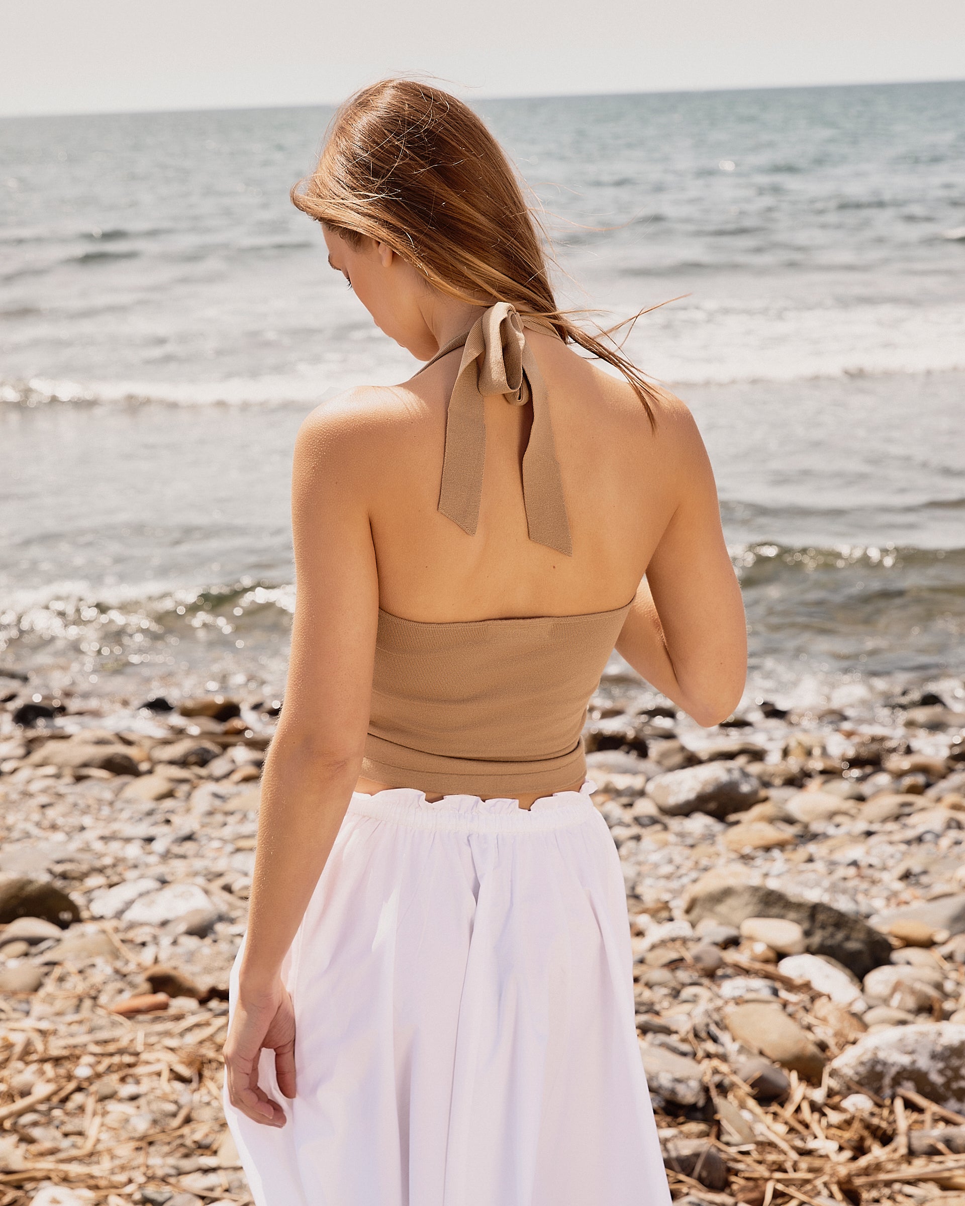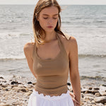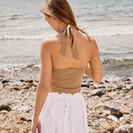 Top de punto en color caramelo. Corte tipo halter con ajuste en cuello. Espalda descubierta.