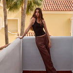 Top de punto en color caramelo. Corte tipo halter con ajuste en cuello. Espalda descubierta.