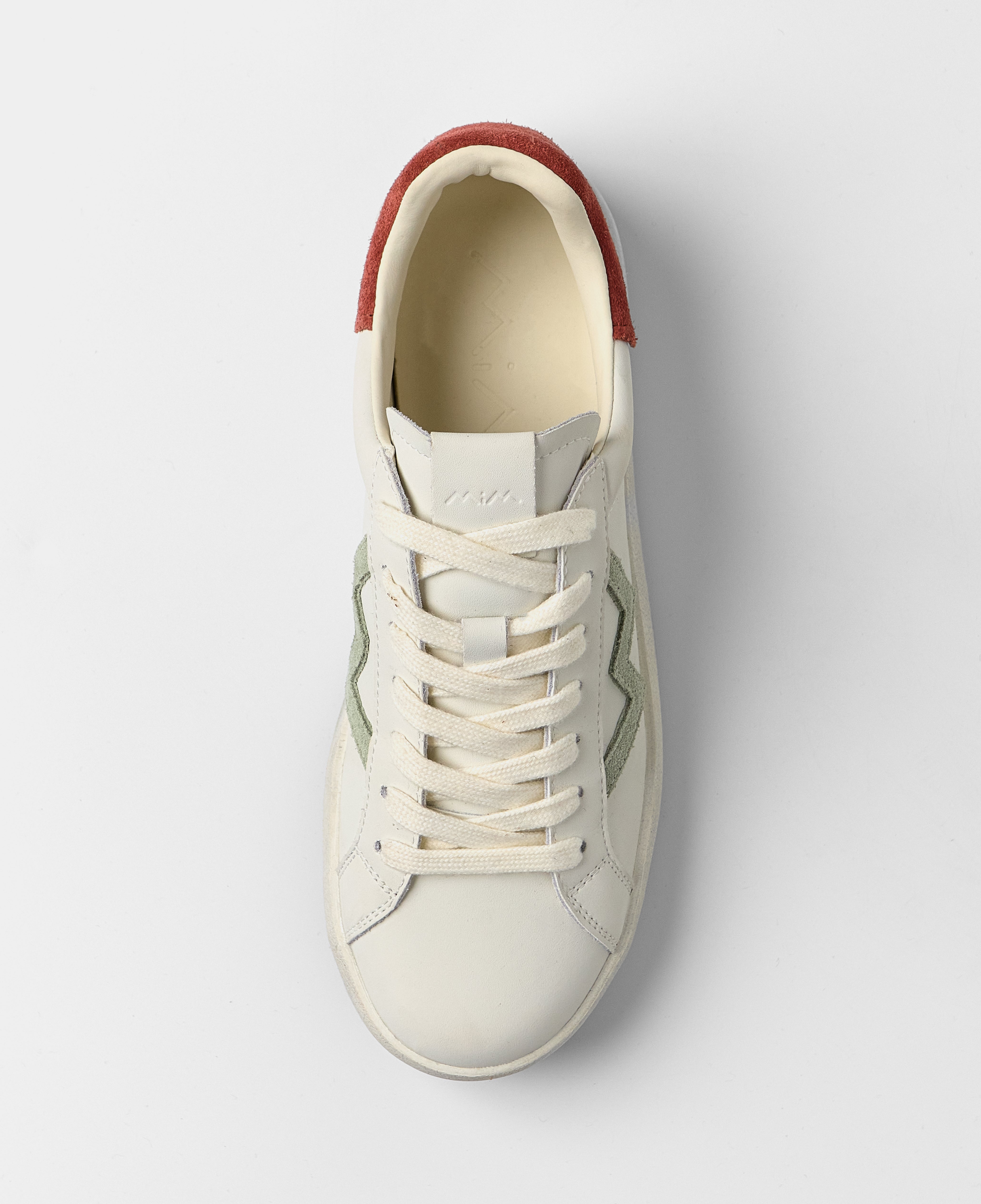 Zapatilla de cordones en piel blanca. Detalla de logo en verde y trasera a contraste en color teja.