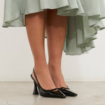Zapato de tacón de aguja y cerrado, en piel color nude con acabado en negro. Parte delantera en pico y trasera contira para sujección en talón.