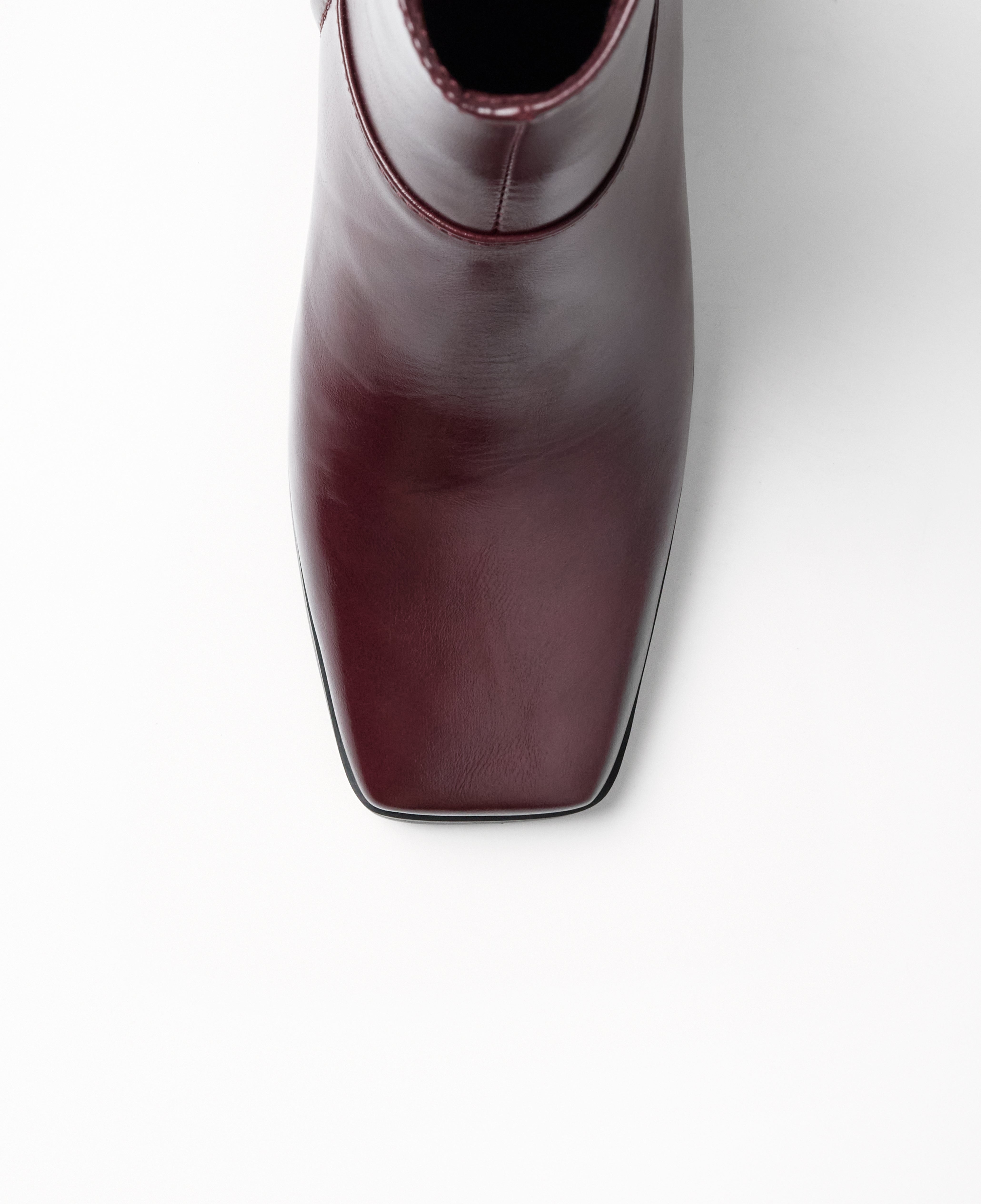 Botín de caña baja conpuntera cuadrada en color burdeos. Cremallera lateral. Tacón rectangular.