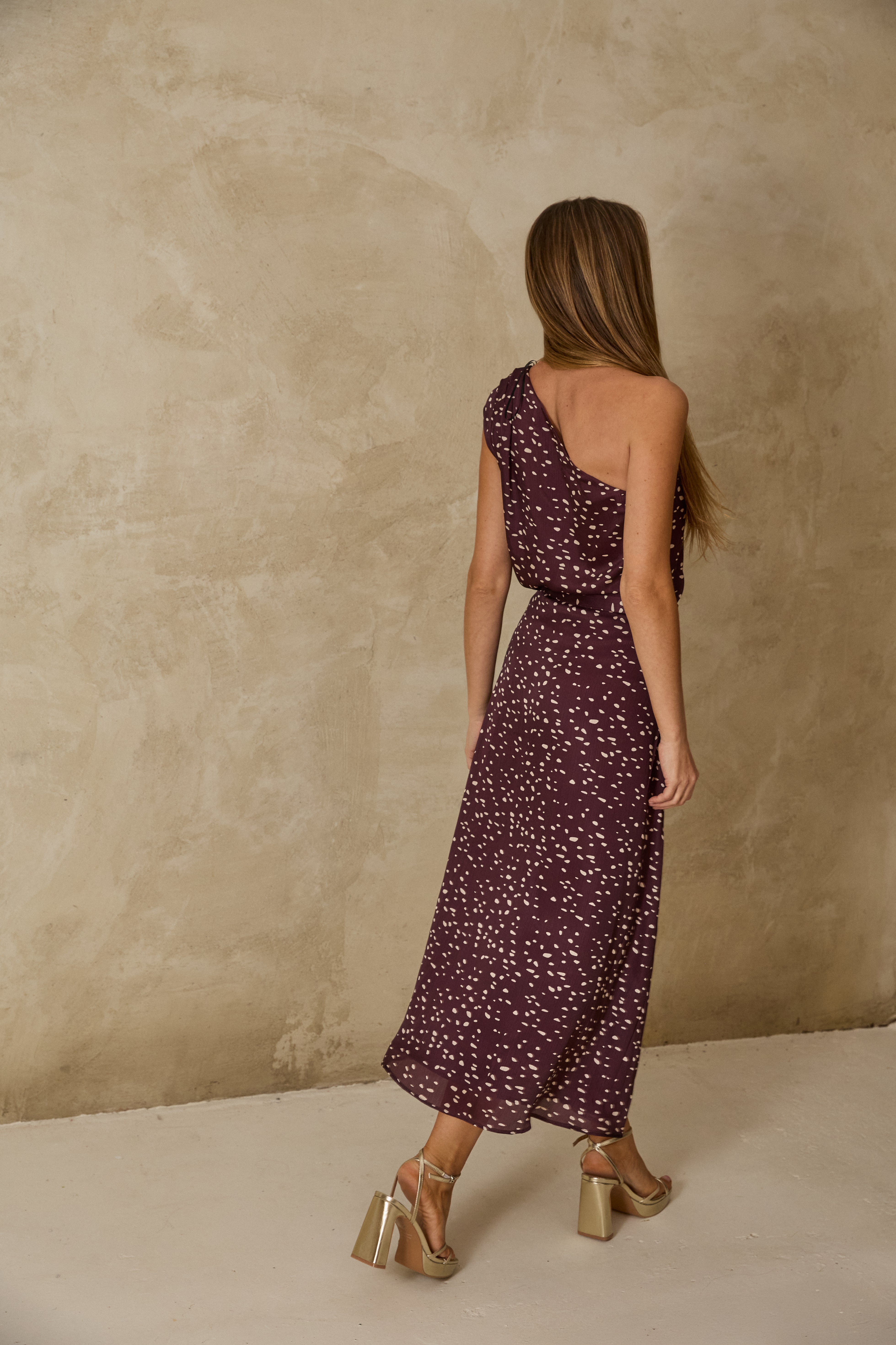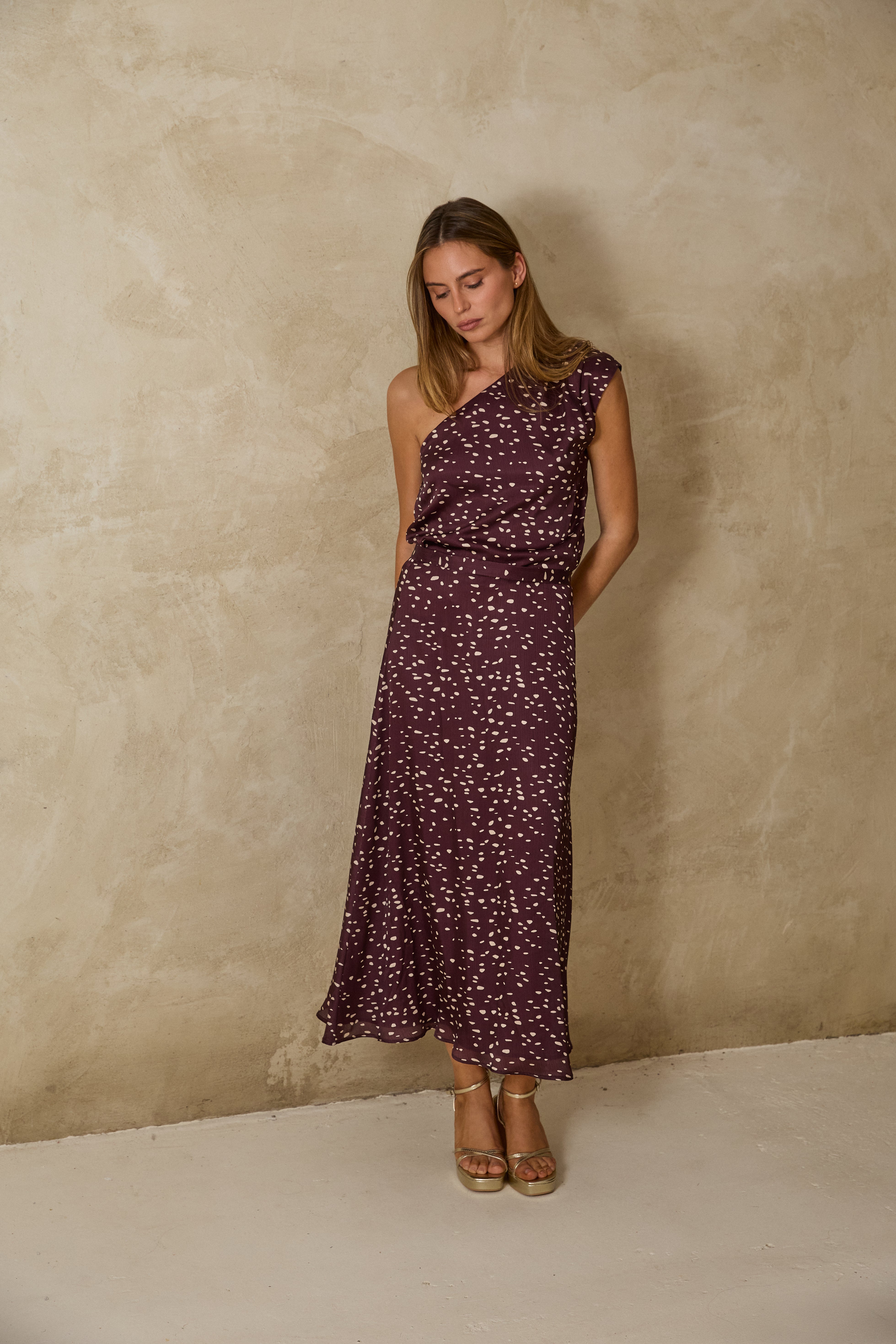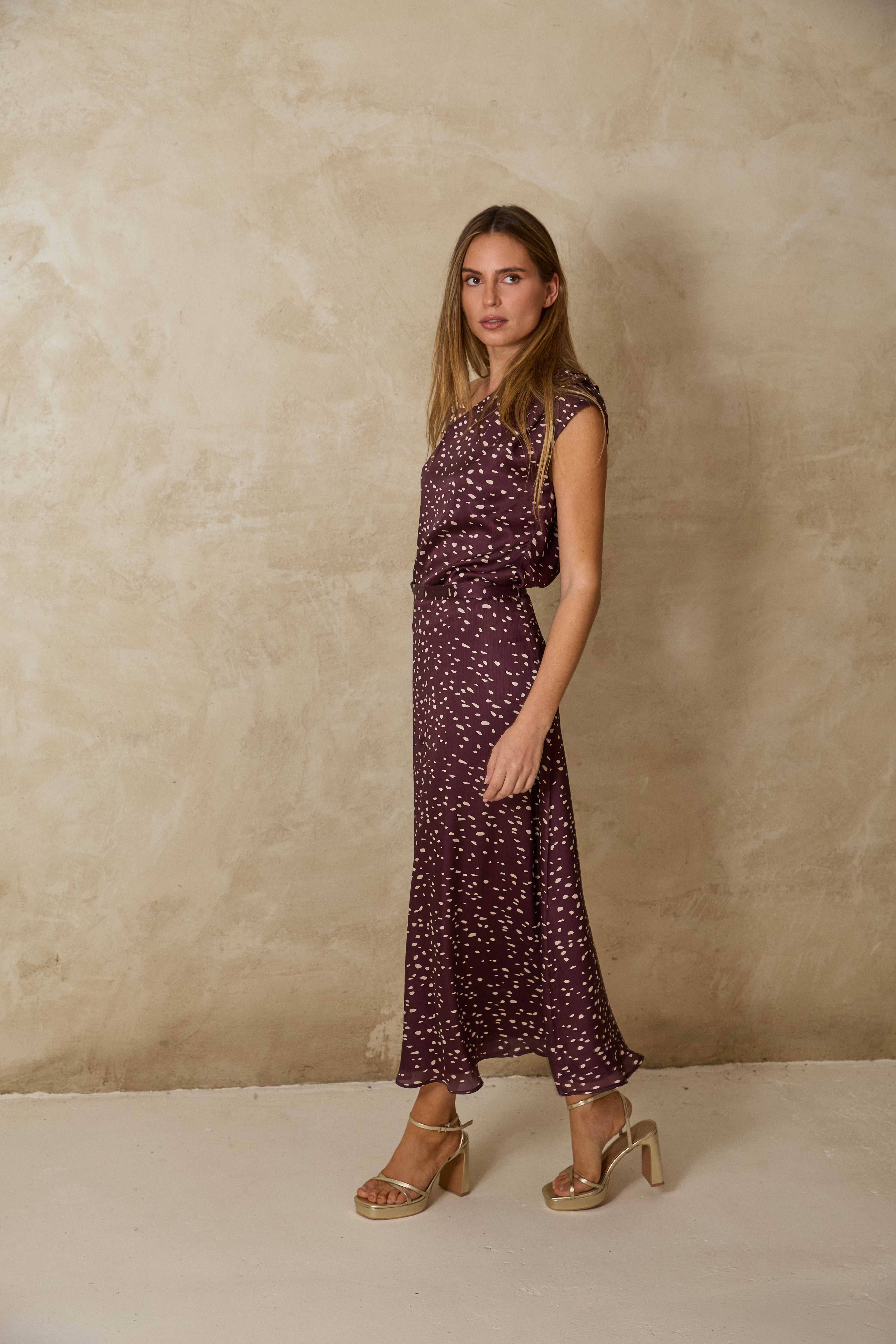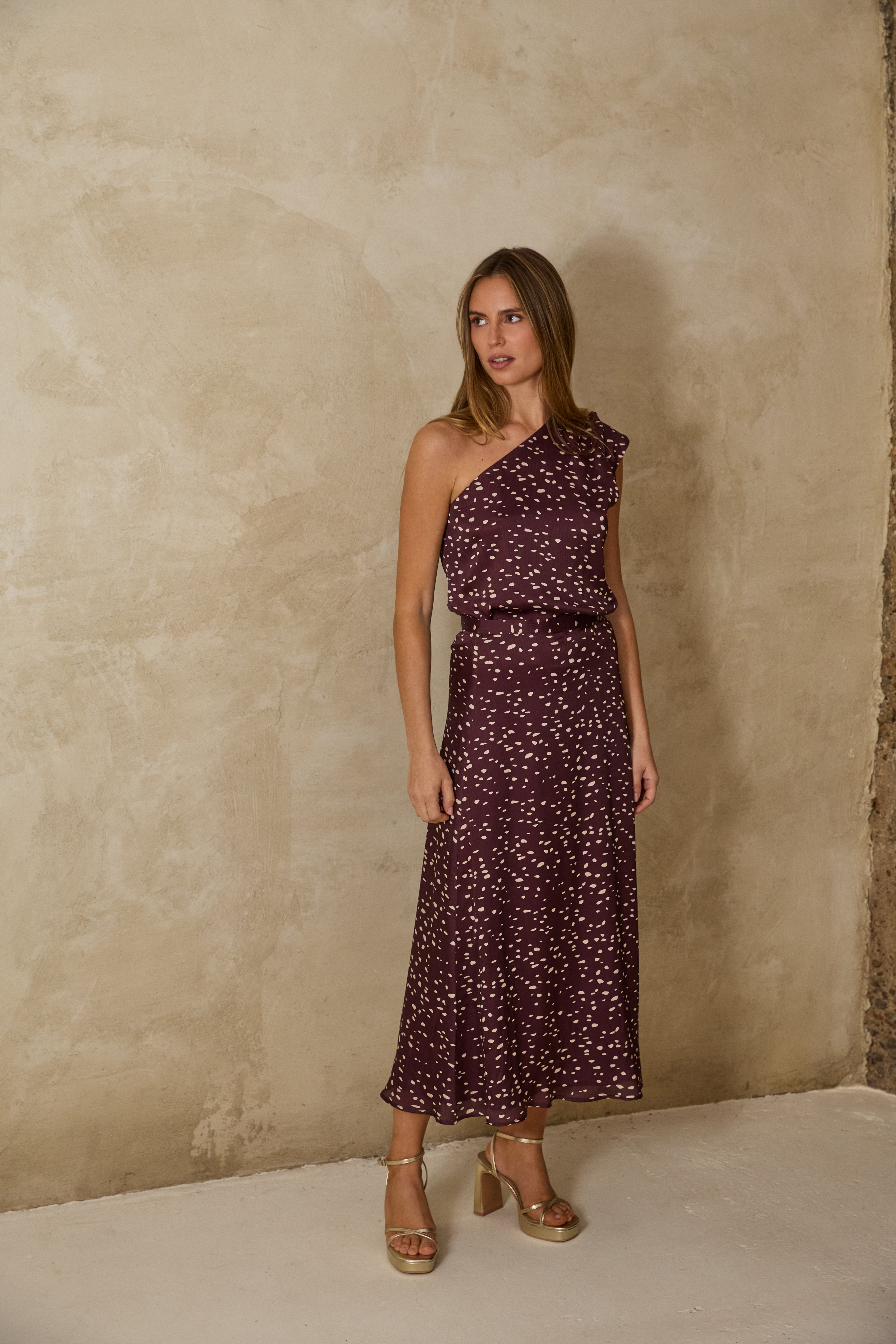 Falda midi fluida con corte evasé. Tiro medio con cremallera lateral. Print moteado en tono berenjena. Forro interior combinado.