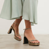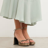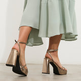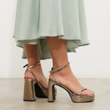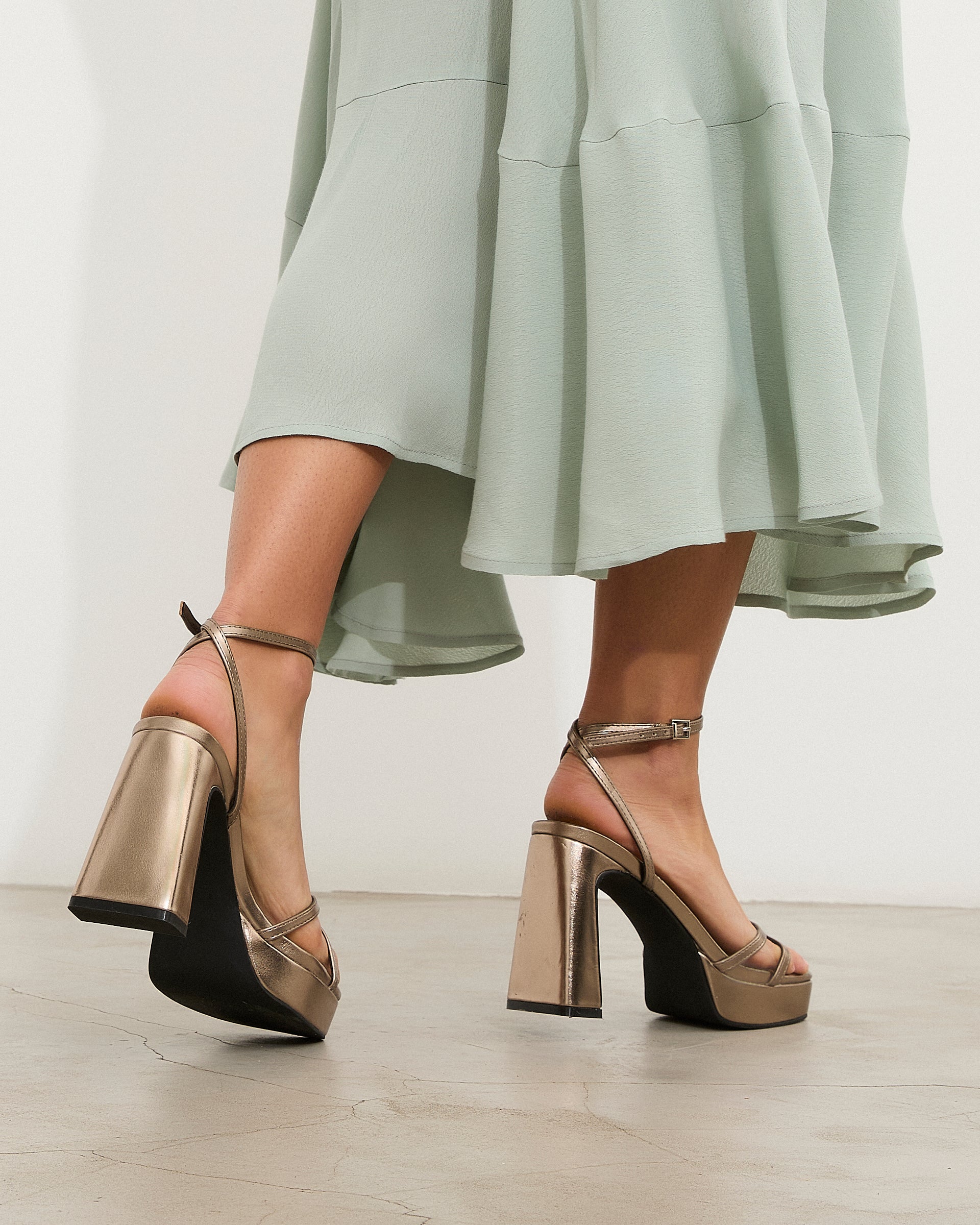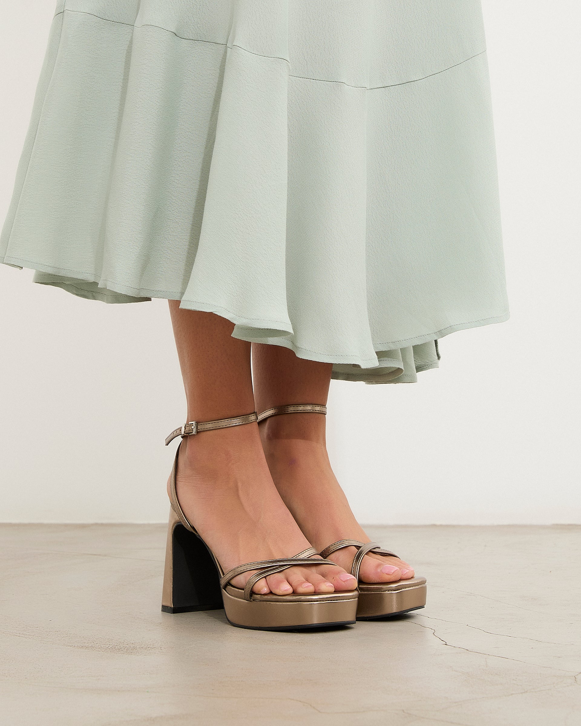 Sandalia de tacón con plataforma en tono metalizado con tiras en la parte delantera. Cierre en el tobillo con hebilla.
