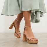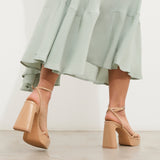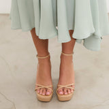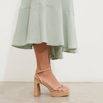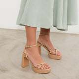 Tacón de plataforma en charol nude. Dos tiras finas frontales cruzadas y dos tiras finas para sujeción en tobillo y cierre con hebilla.