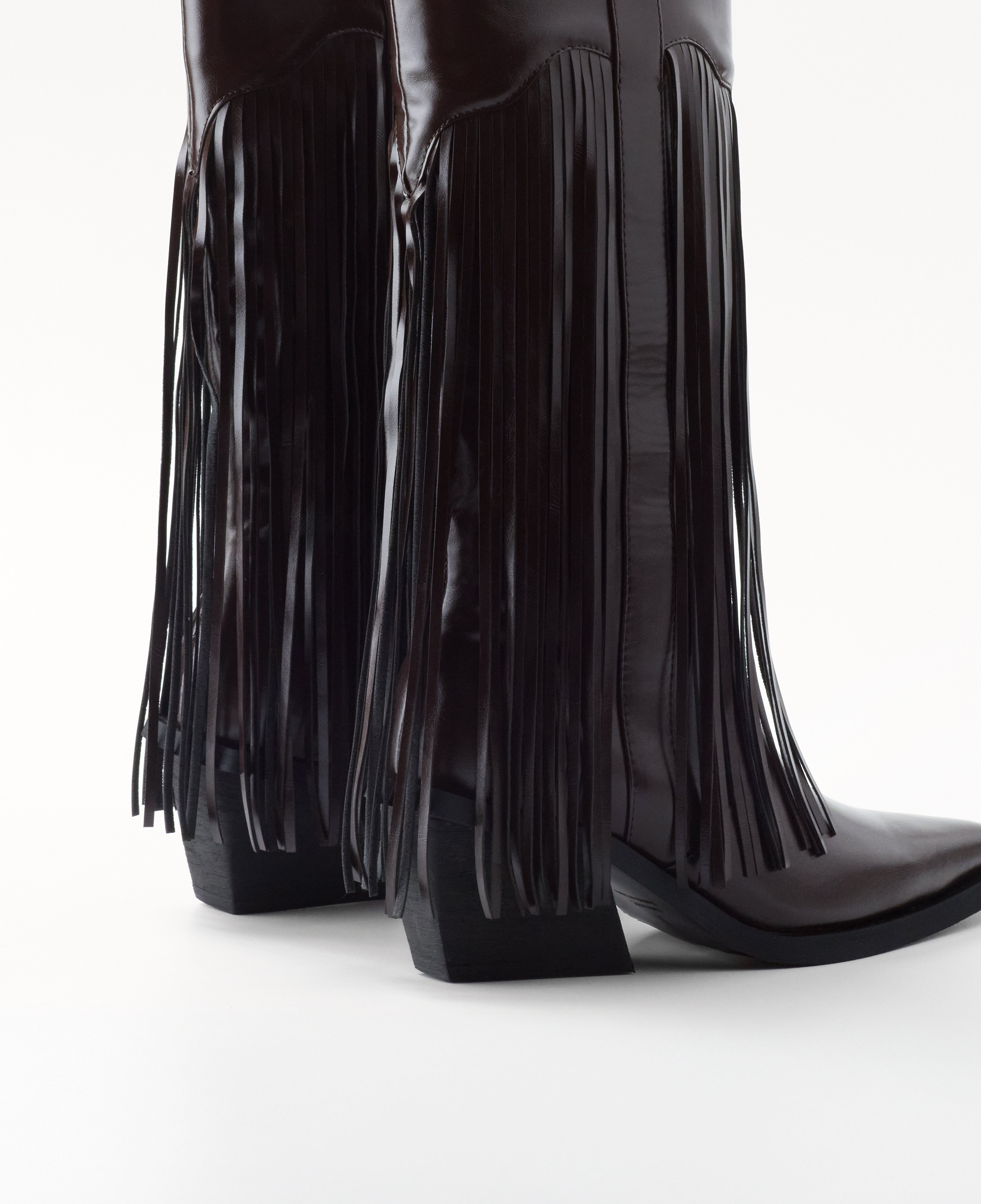 Bota de caña alta con acabado en punta en color chocolate. Detalle de flecos. Tacón ancho tipo cowboy.