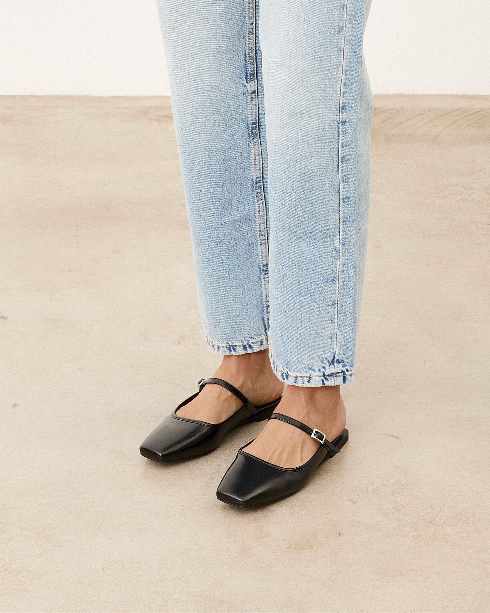 Zapato plano tipo mule con puntera cuadrada en color negro. Detalle de tira empiene.