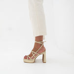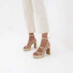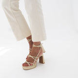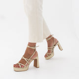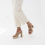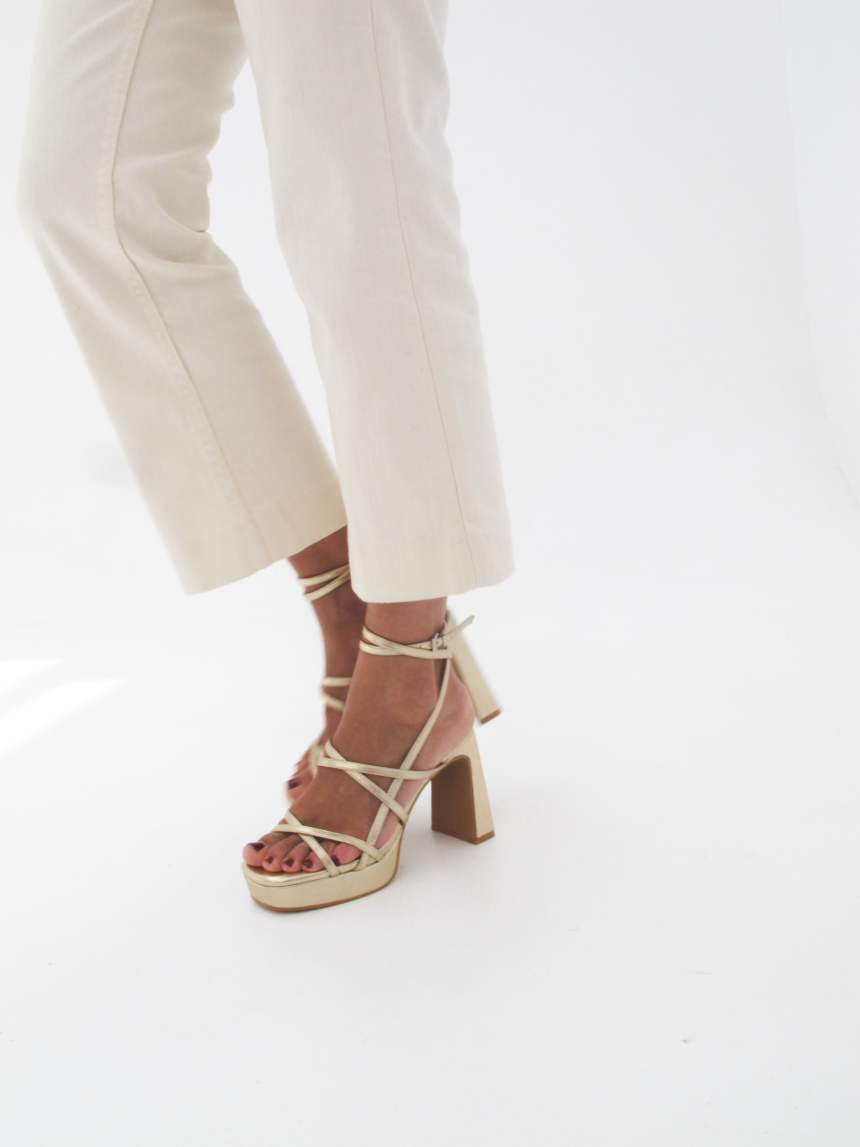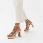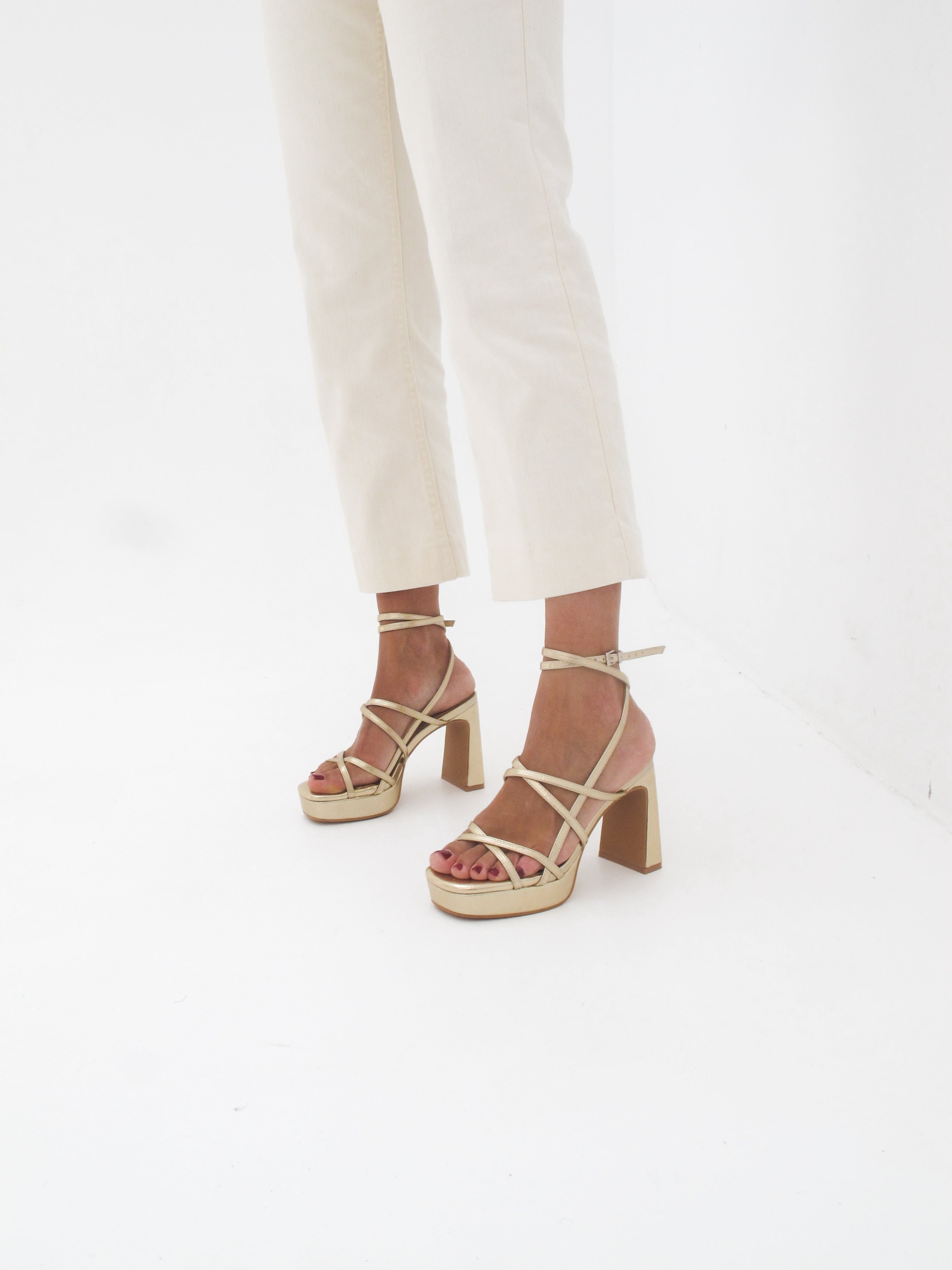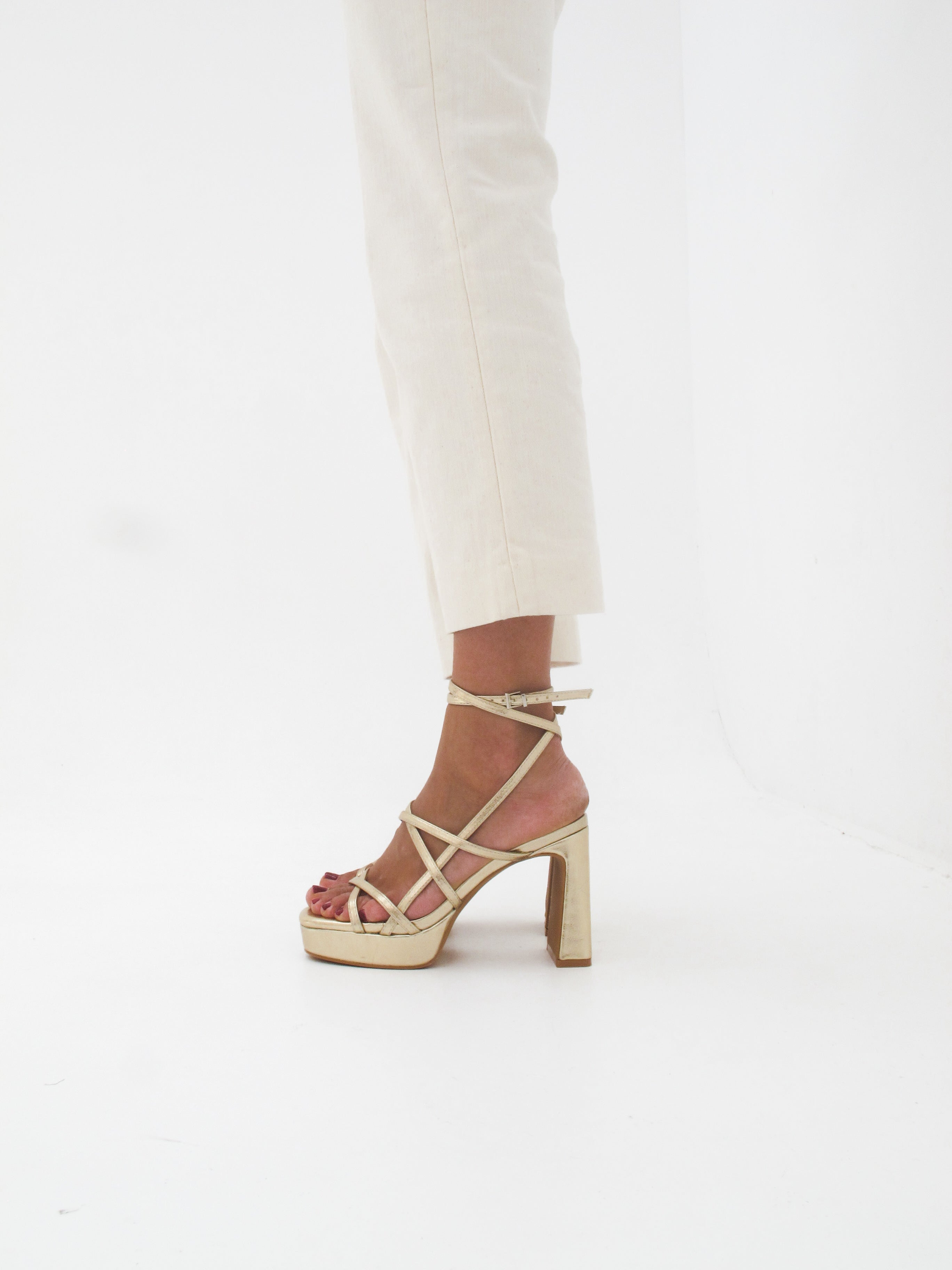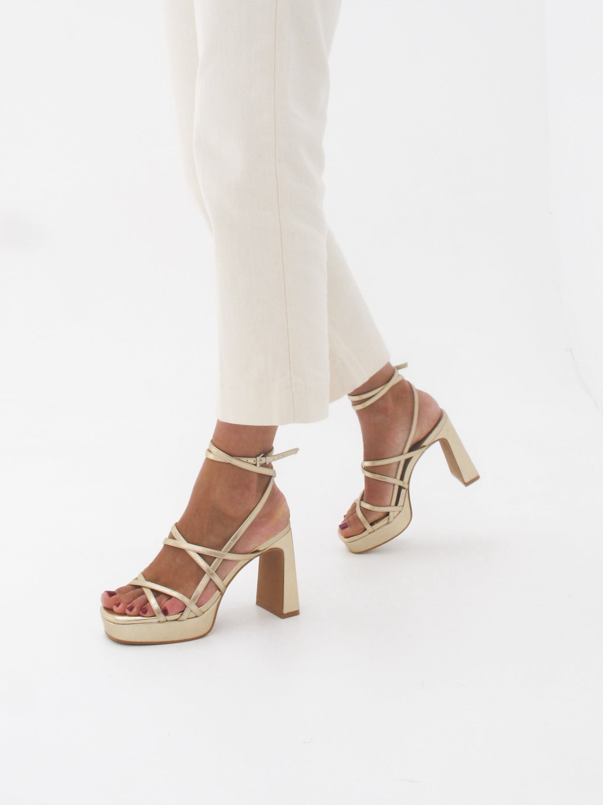 Sandalia de tacón y plataforma color dorado brillante. Parte delantera abierta con varias tiras asimétricas y tacón rectangular. Cierre en tiras al tobillo con hebilla metálica.