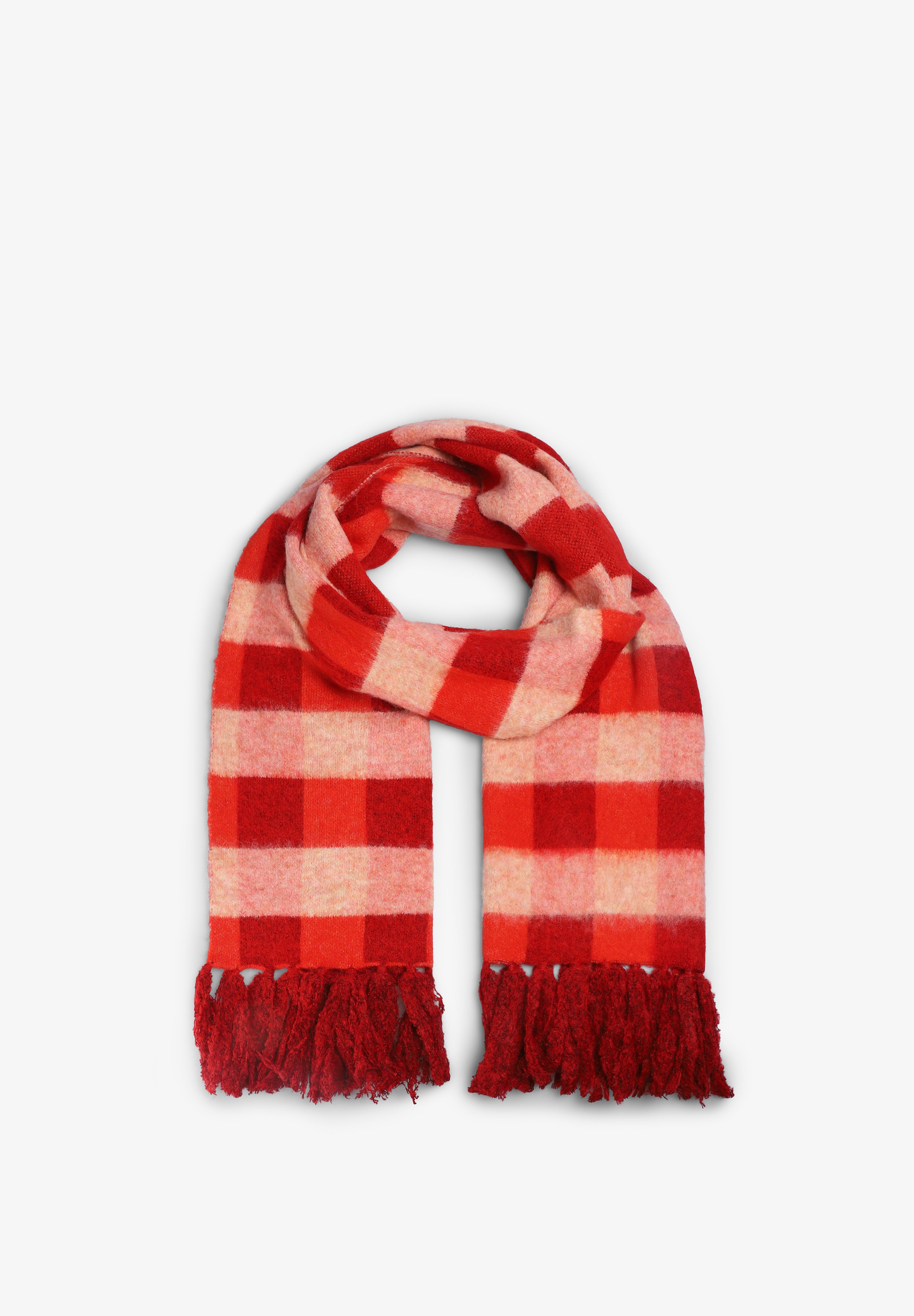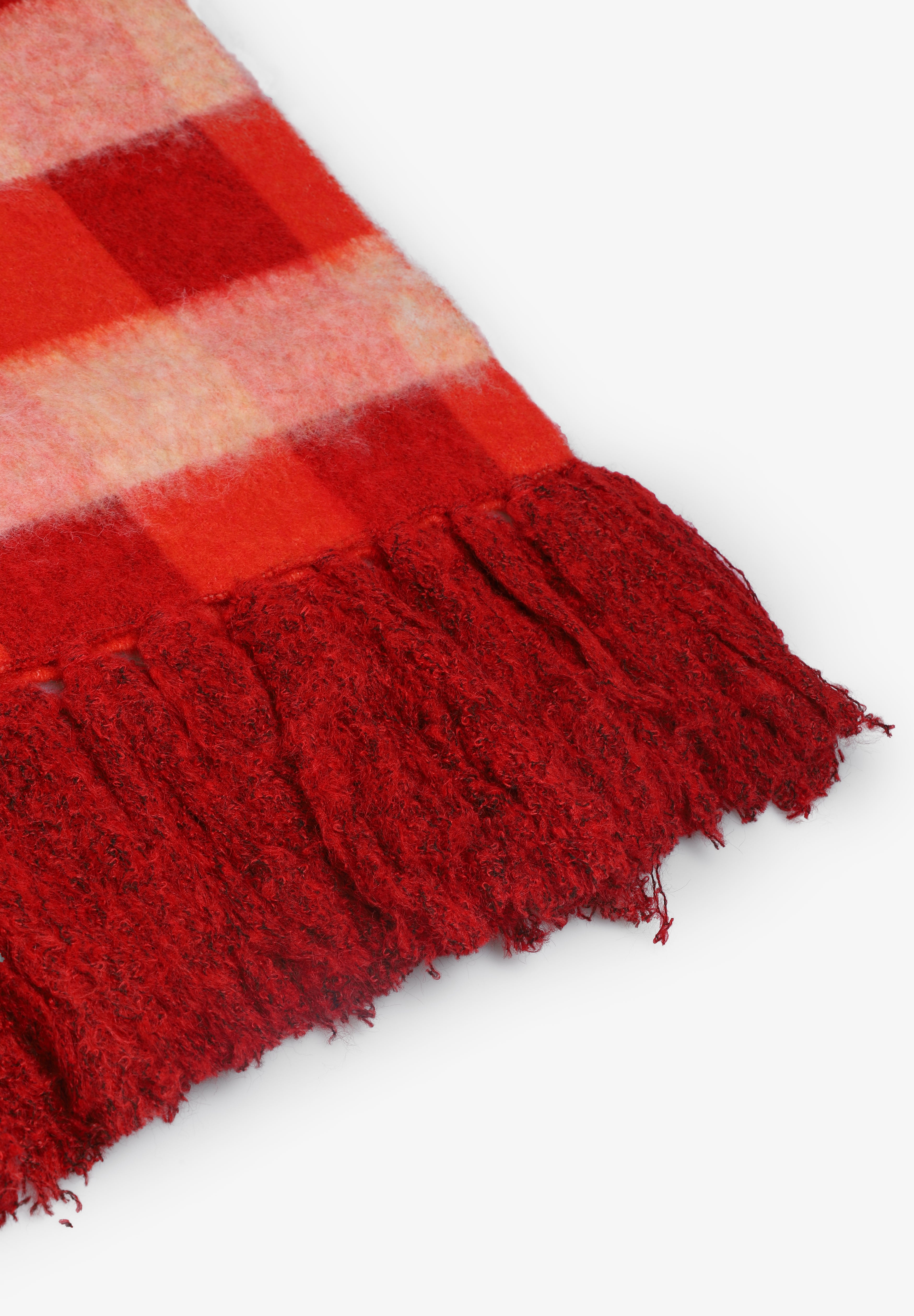 Maxi Bufanda de cuadros en tonos rojos. Detalle de flecos en los extremos.