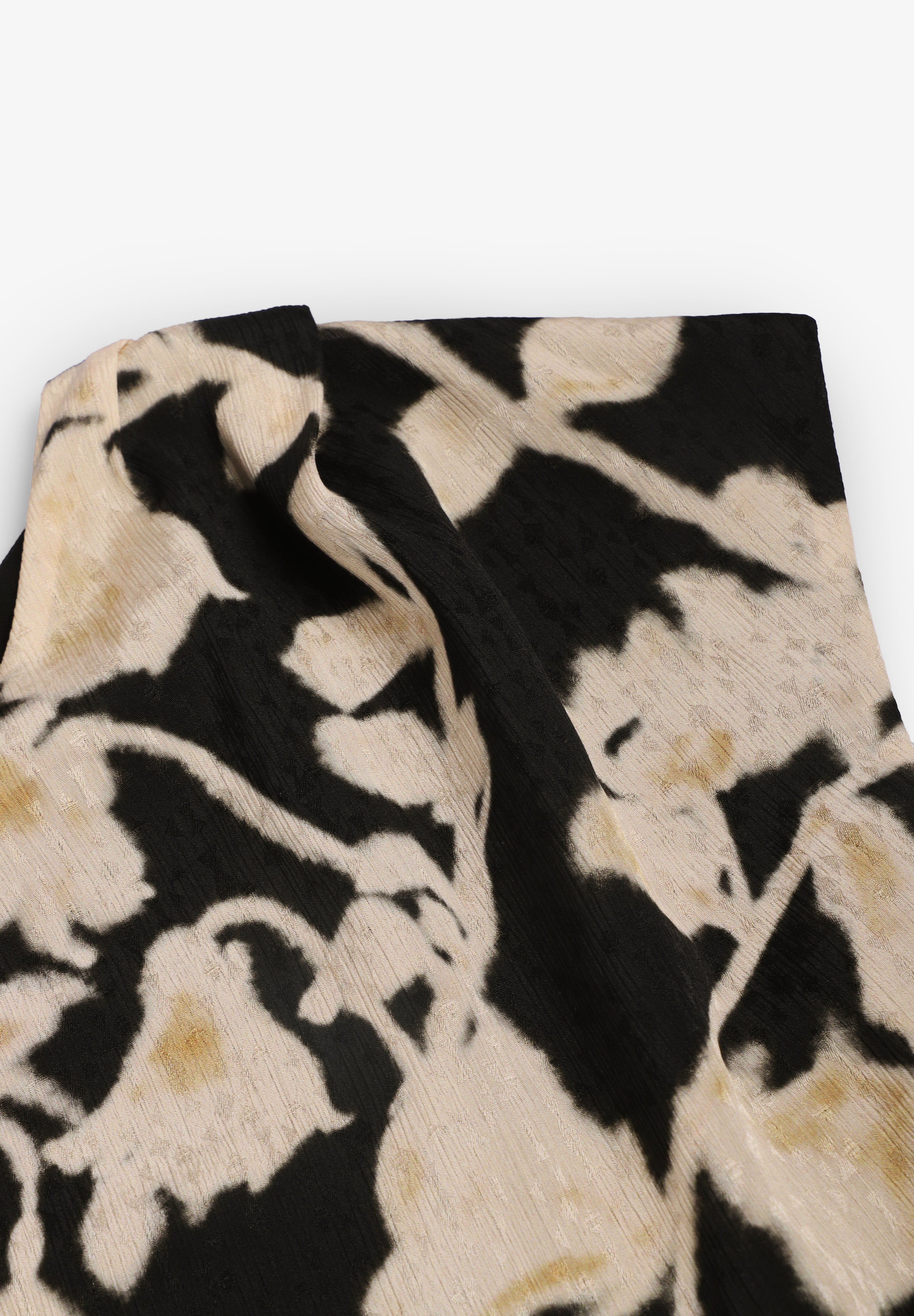 Top de una manga con corte asimétrico. Print de motivos florales en tonos off white y negro. Forro interior.