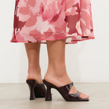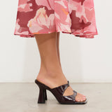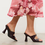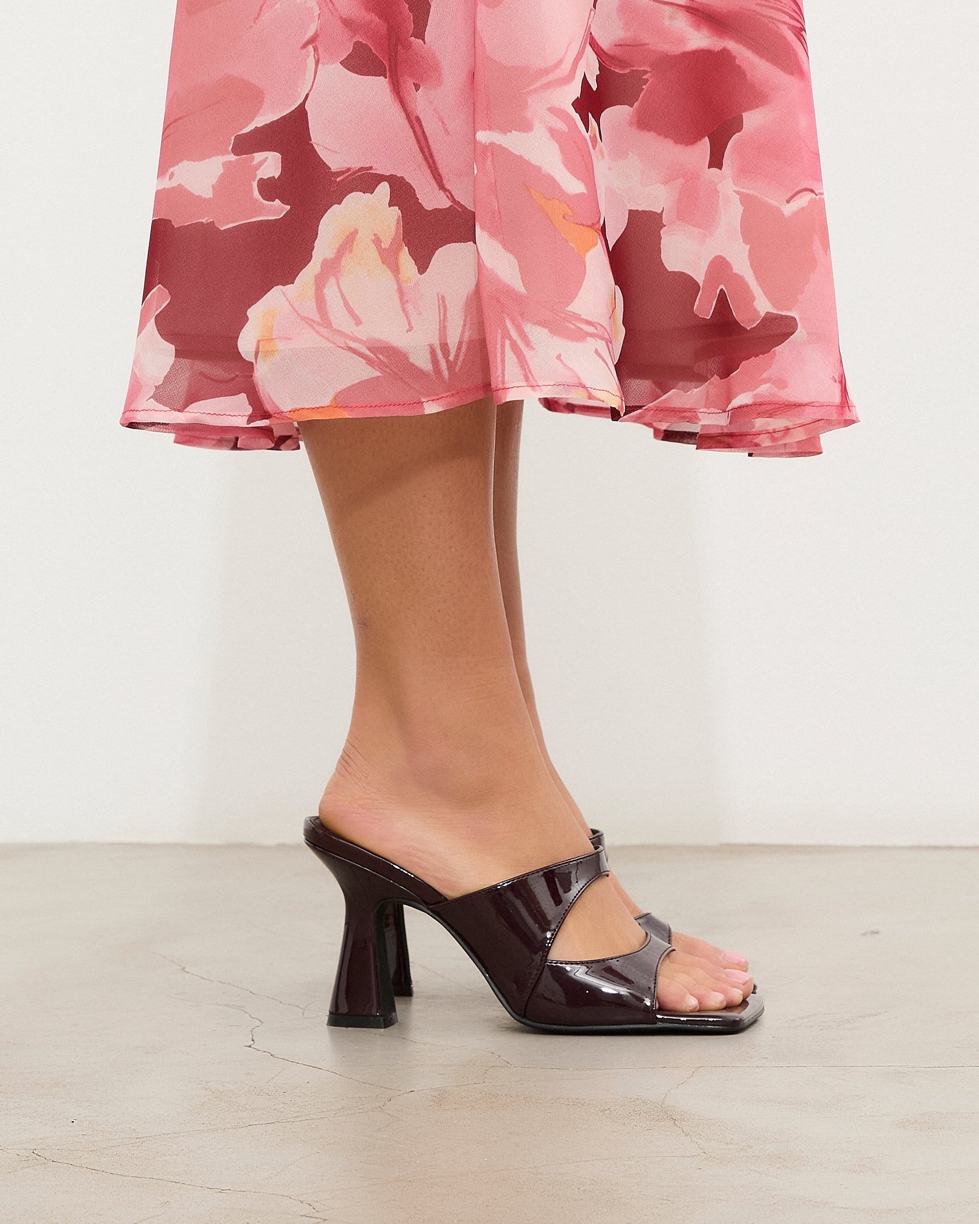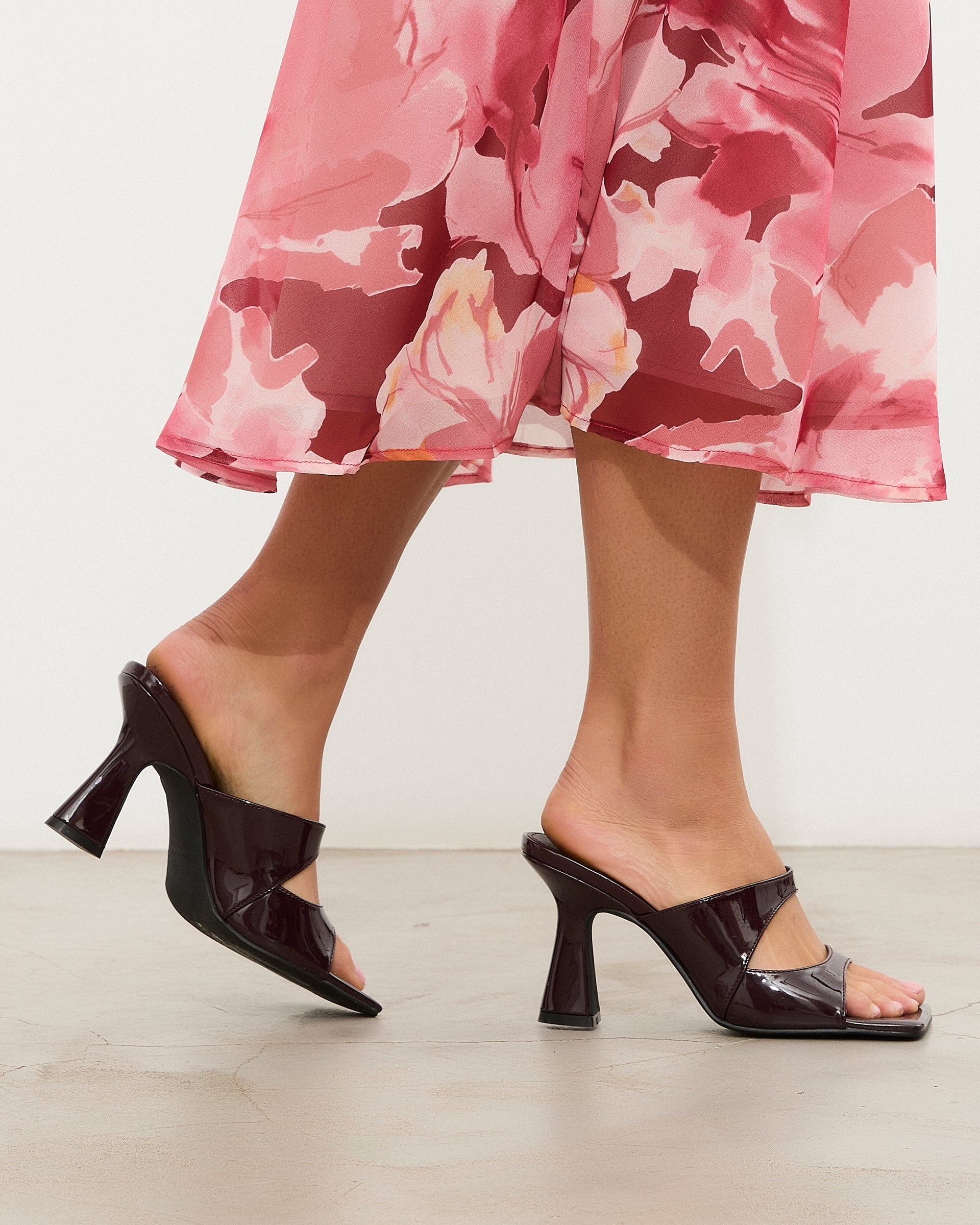 Sandalia de tacón tipo mule en color burdeos con puntera cuadrada. Dos tira delanteras superpuestas en el lateral. Tacón tipo aguja de base ancha.