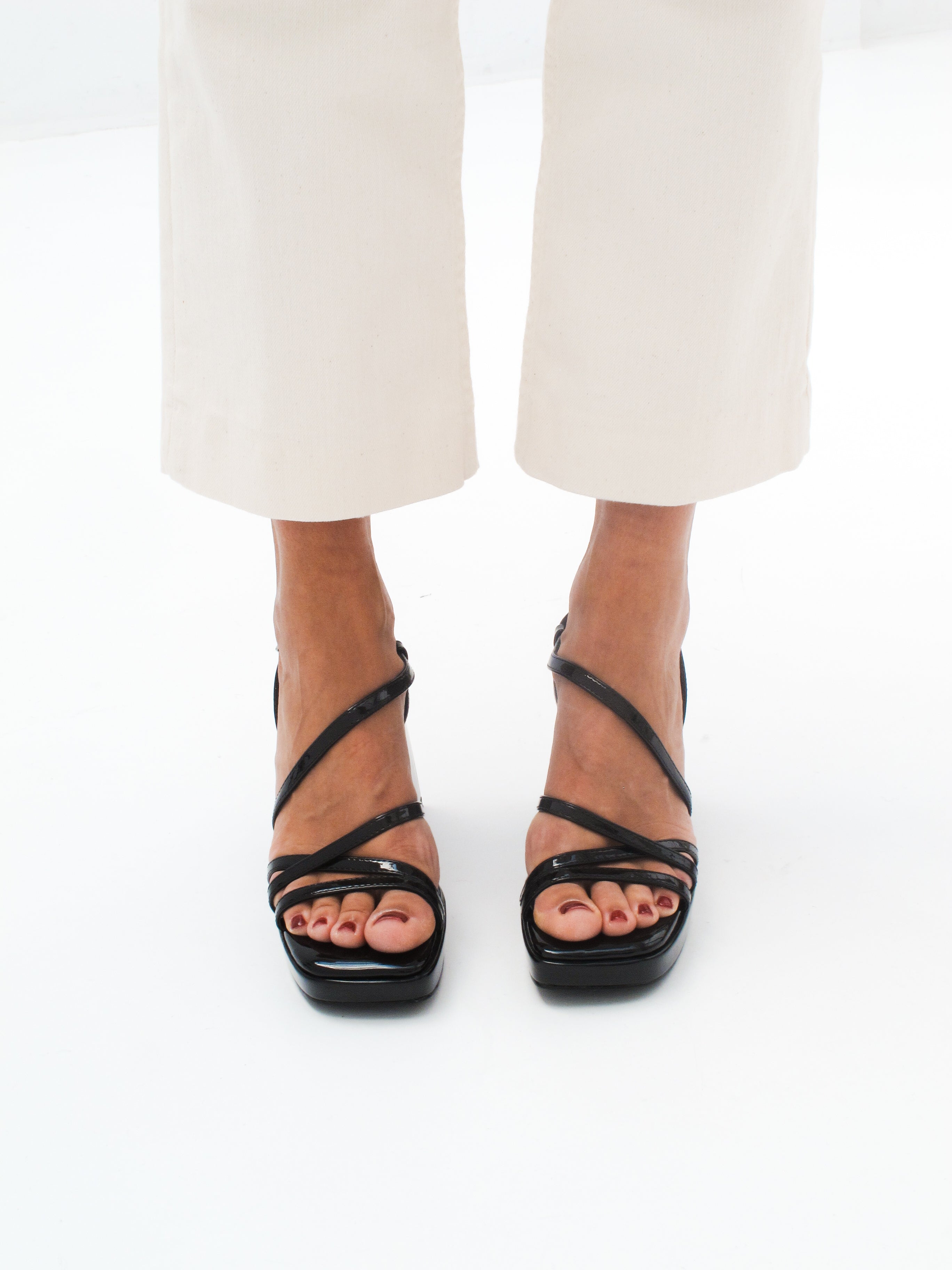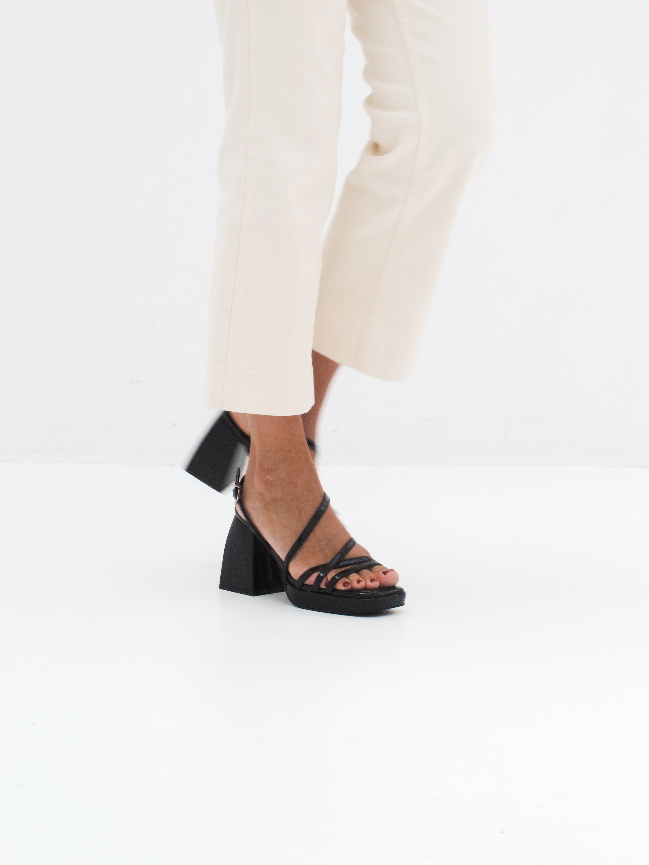 Sandalia de tacón en color negro. Parte delantera abierta con varias tiras tubulares. Tacón cuadrado. Cierre de pulsera al tobillo con hebilla metálica.