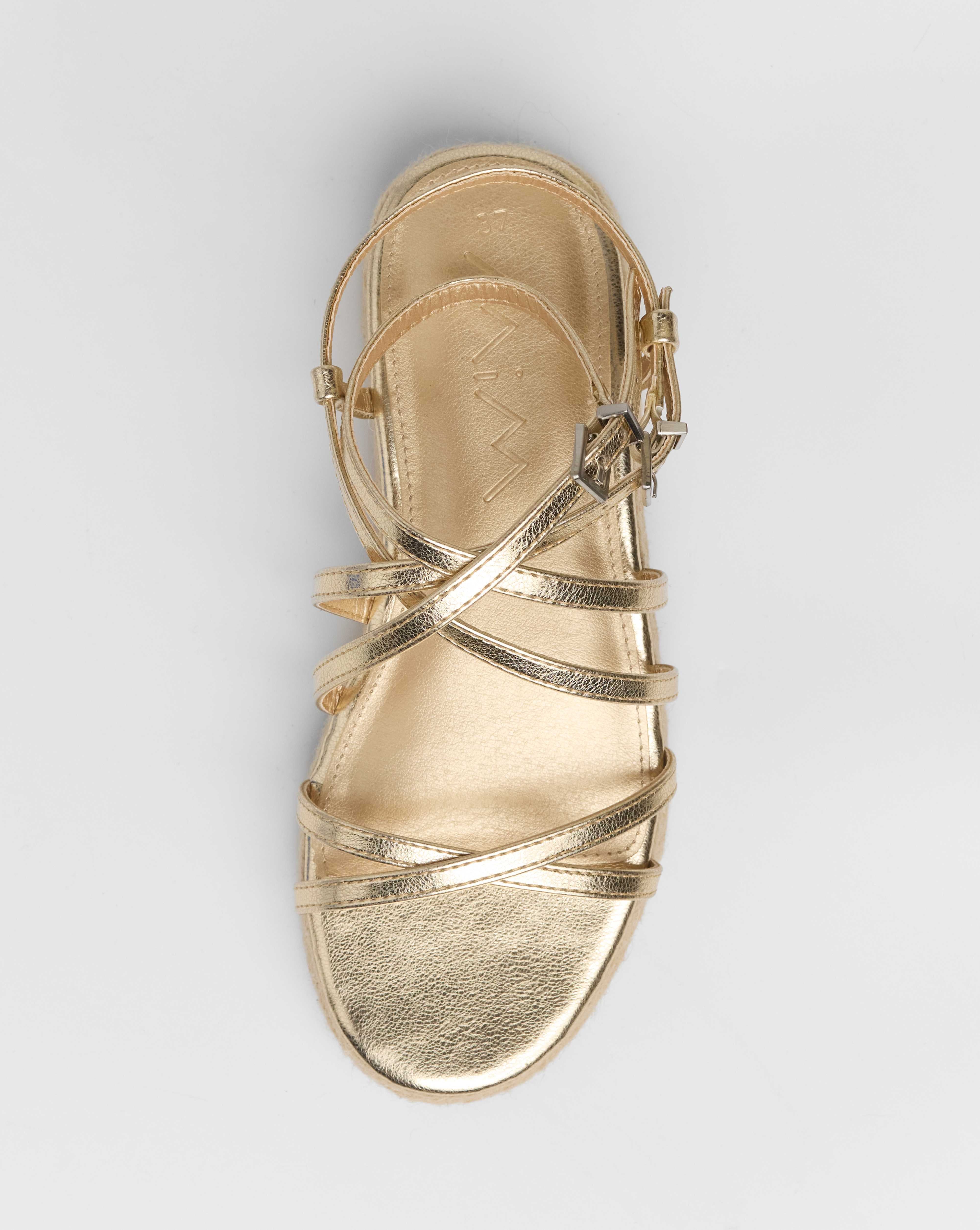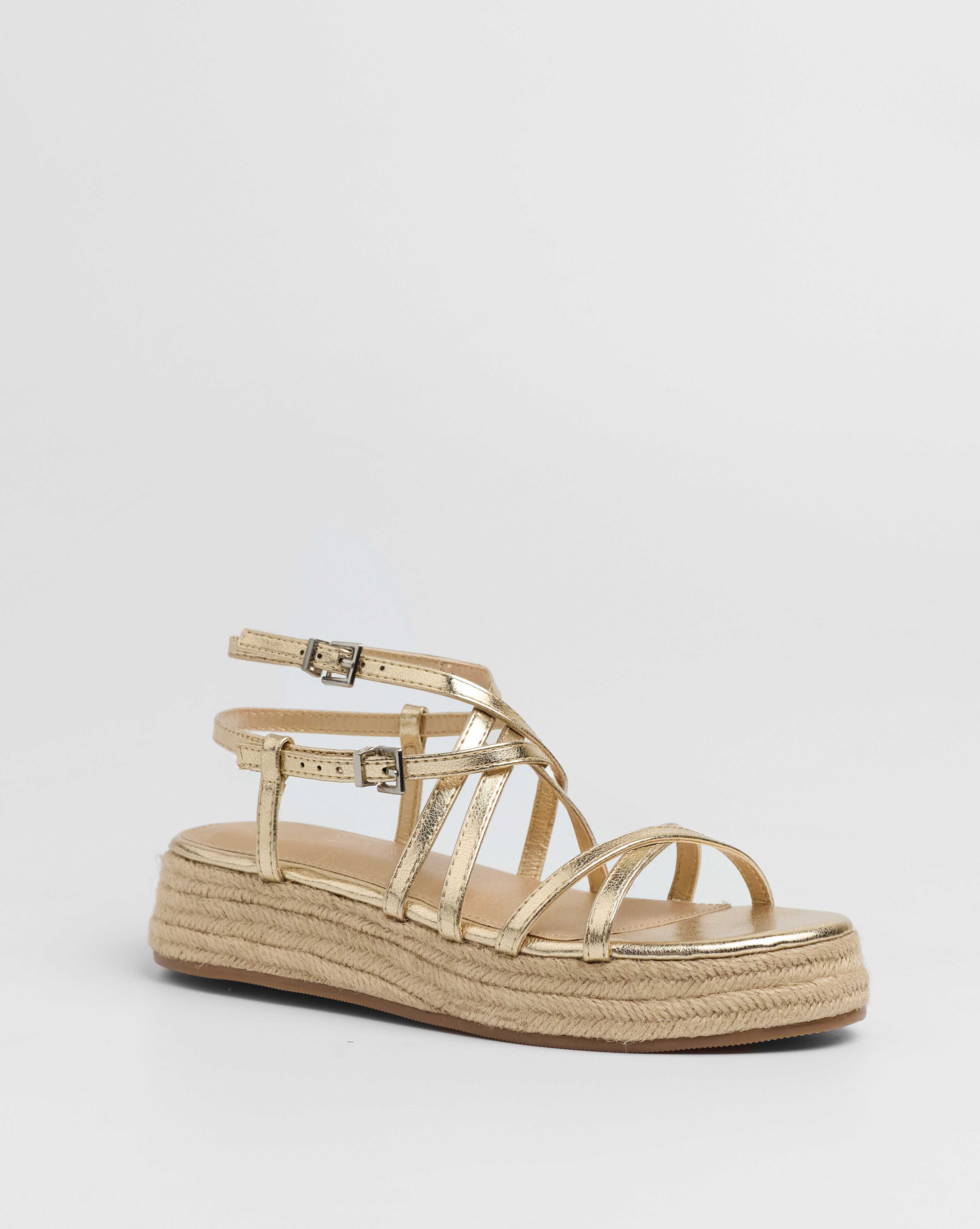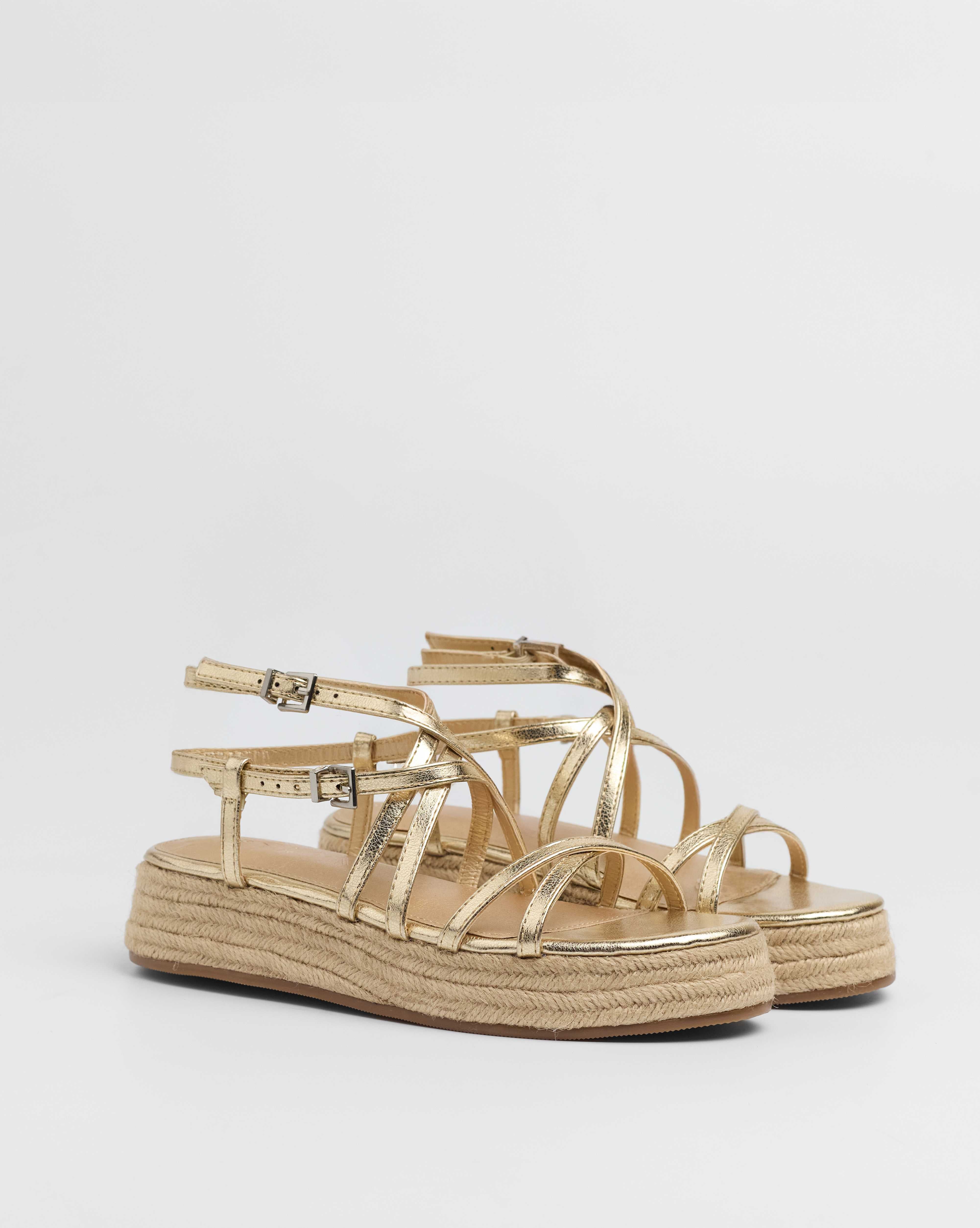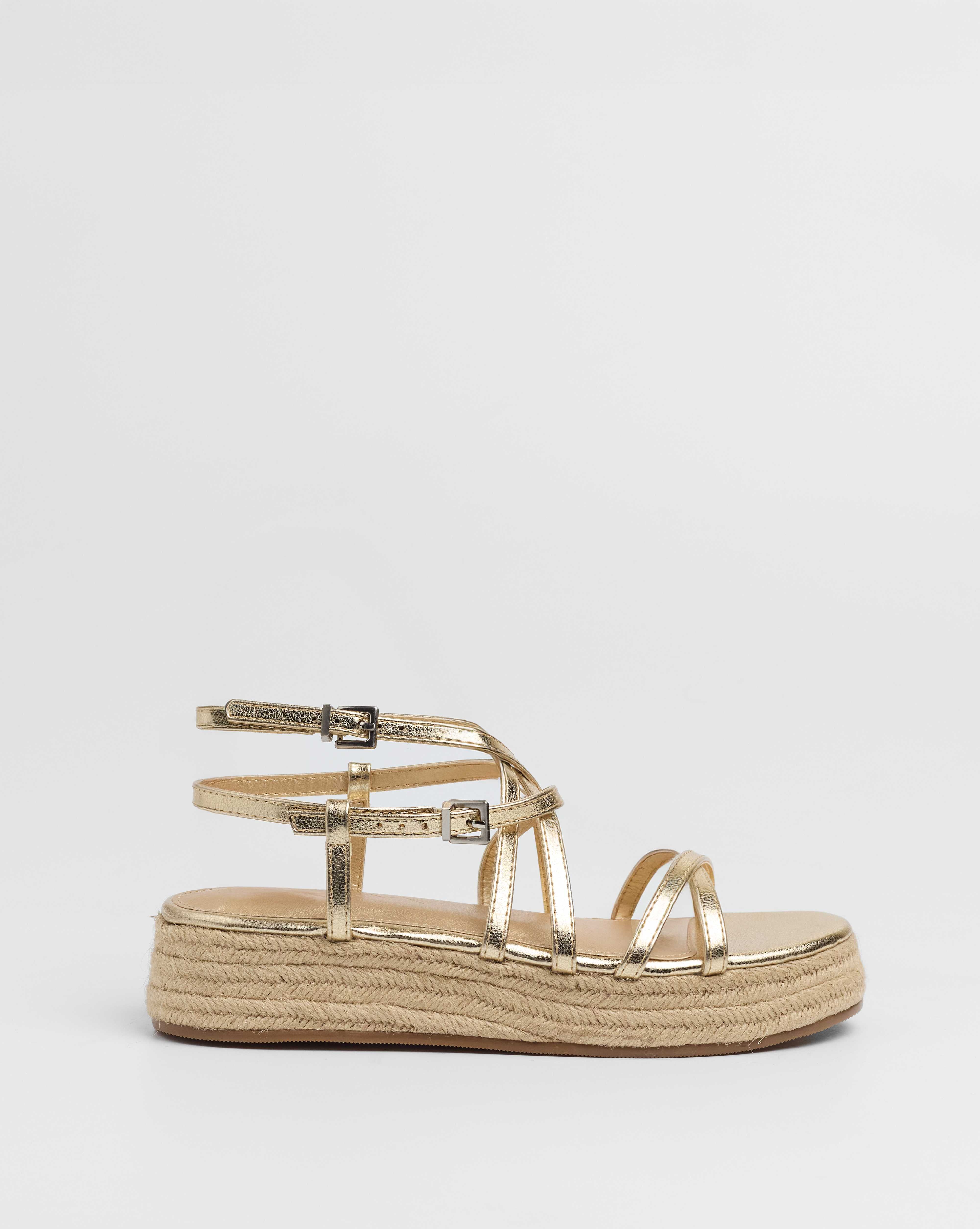 Sandalia con doble suela esparto. Tiras a distintas alturas y sujeción en el tobillo en piel vegano dorado.