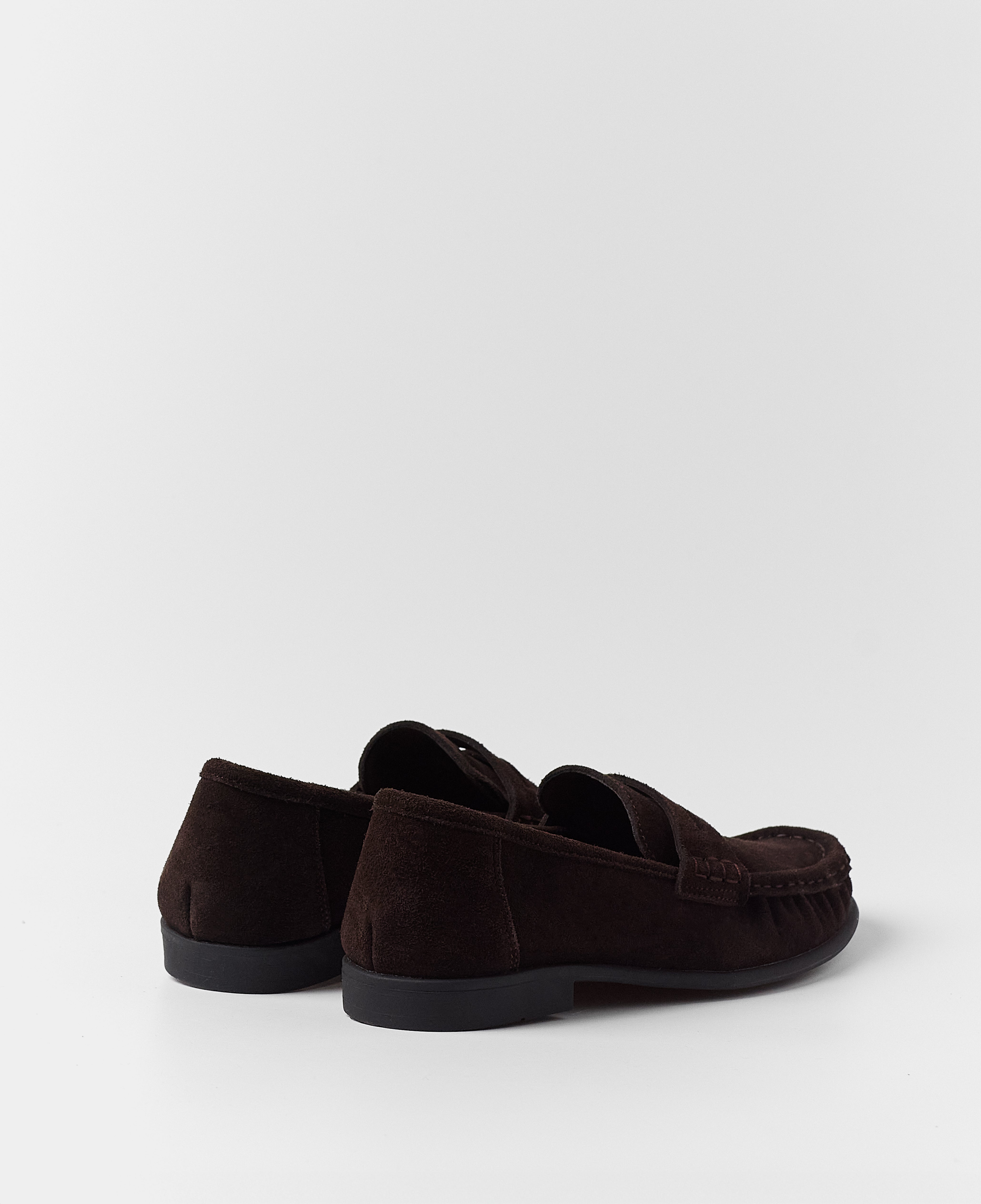 Zapato cerrado estilo mocasín en ante color chocolate.