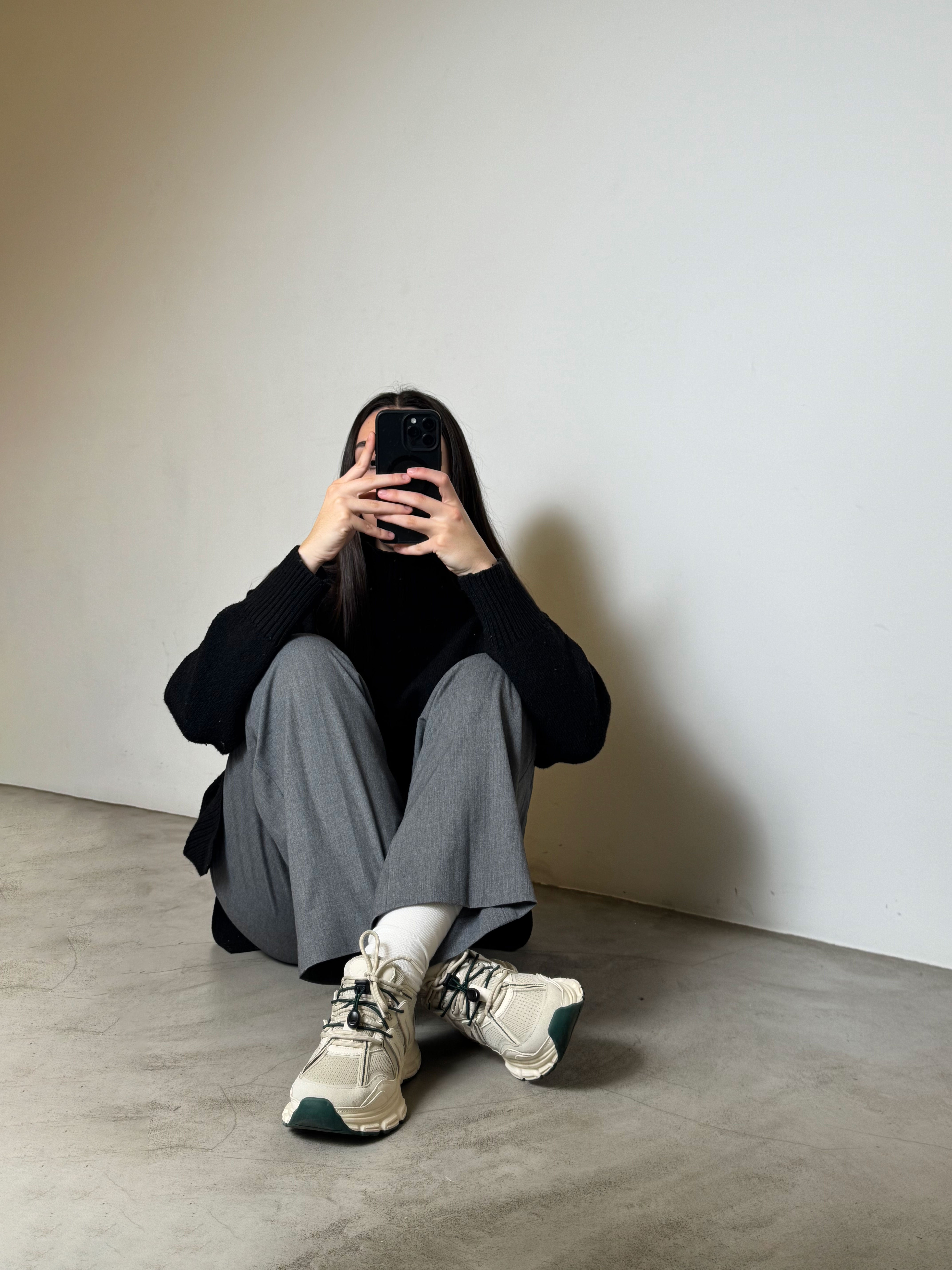 Zapatilla estilo running de piel y mesh en tonos beige. Cierre con cordones elásticos.