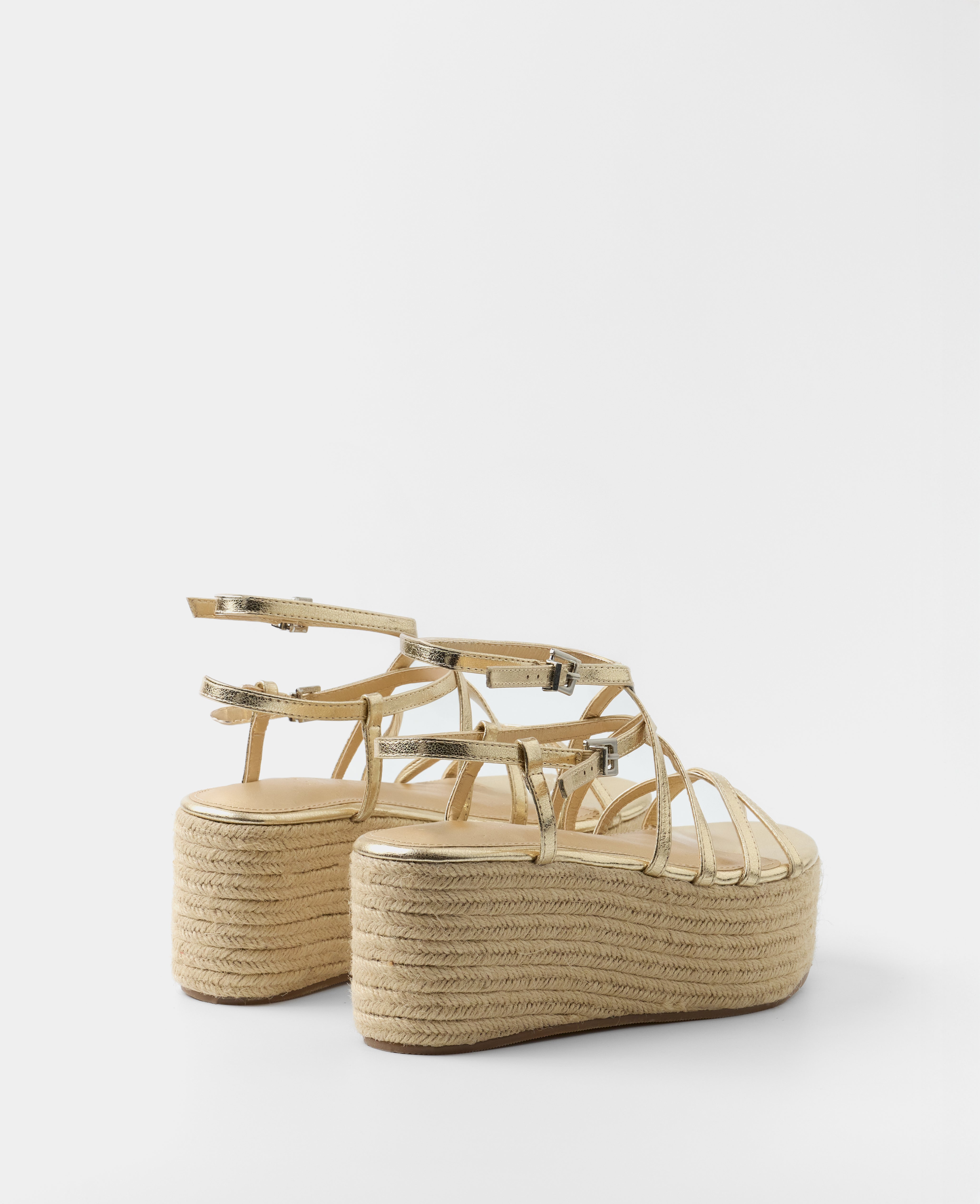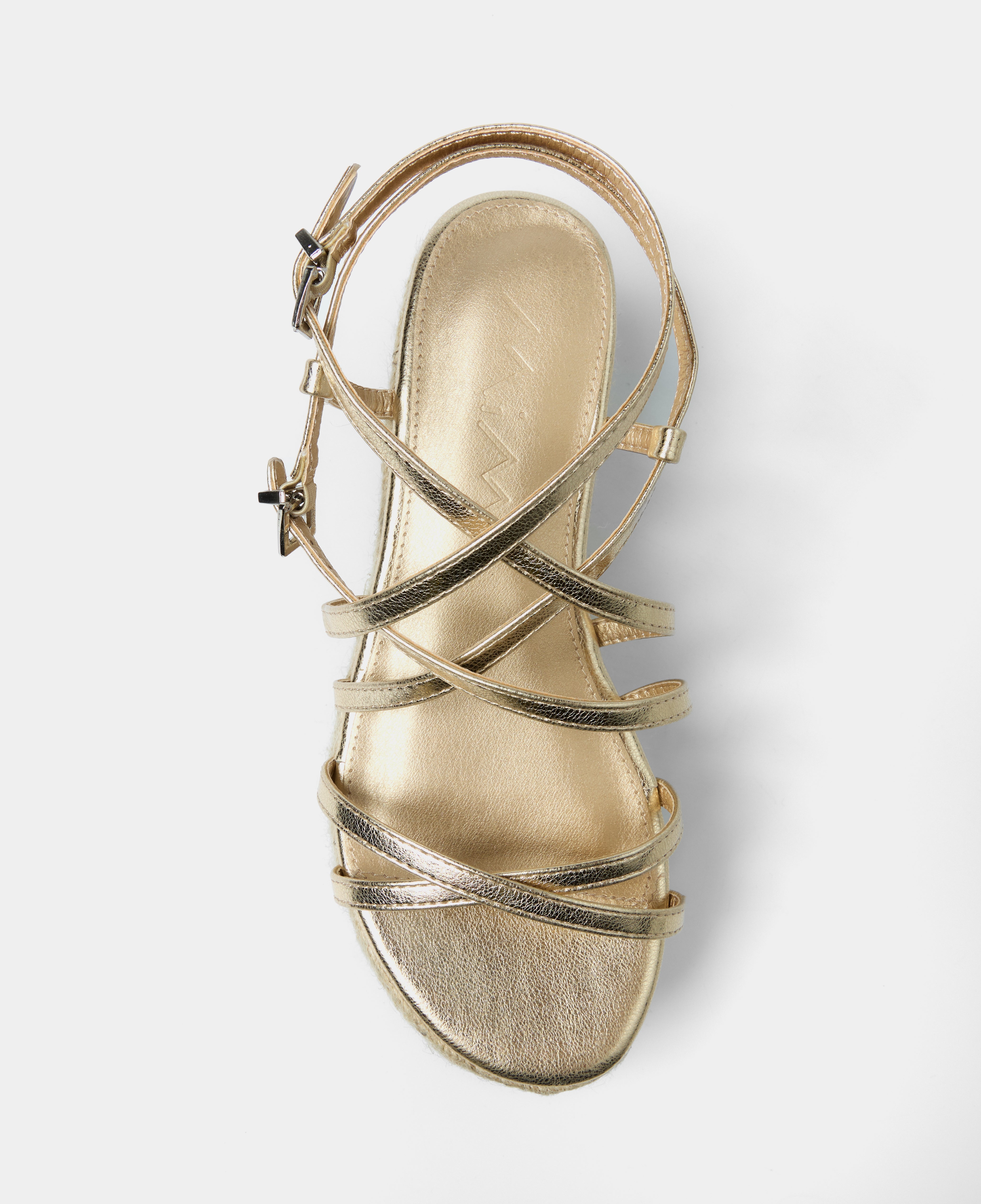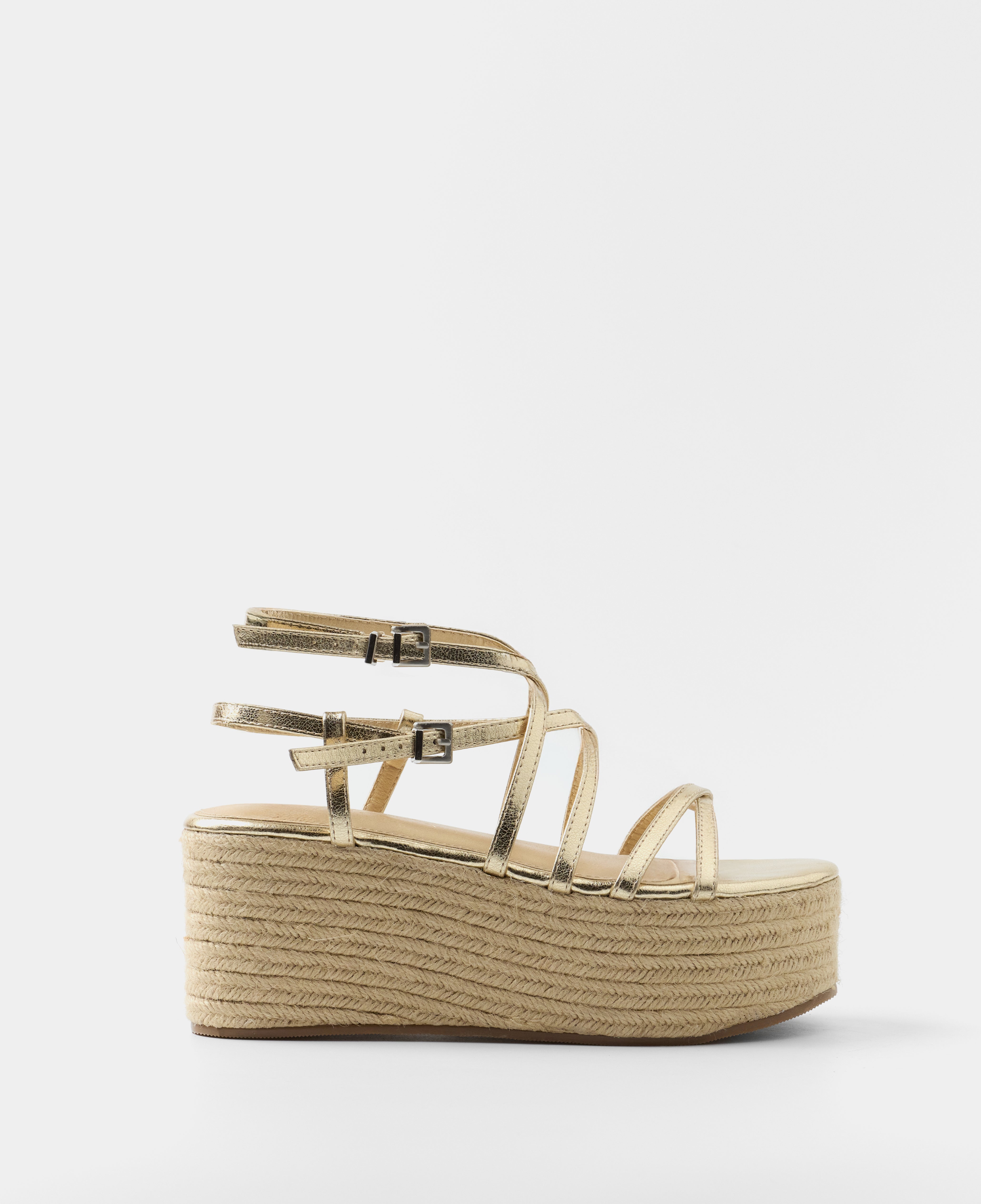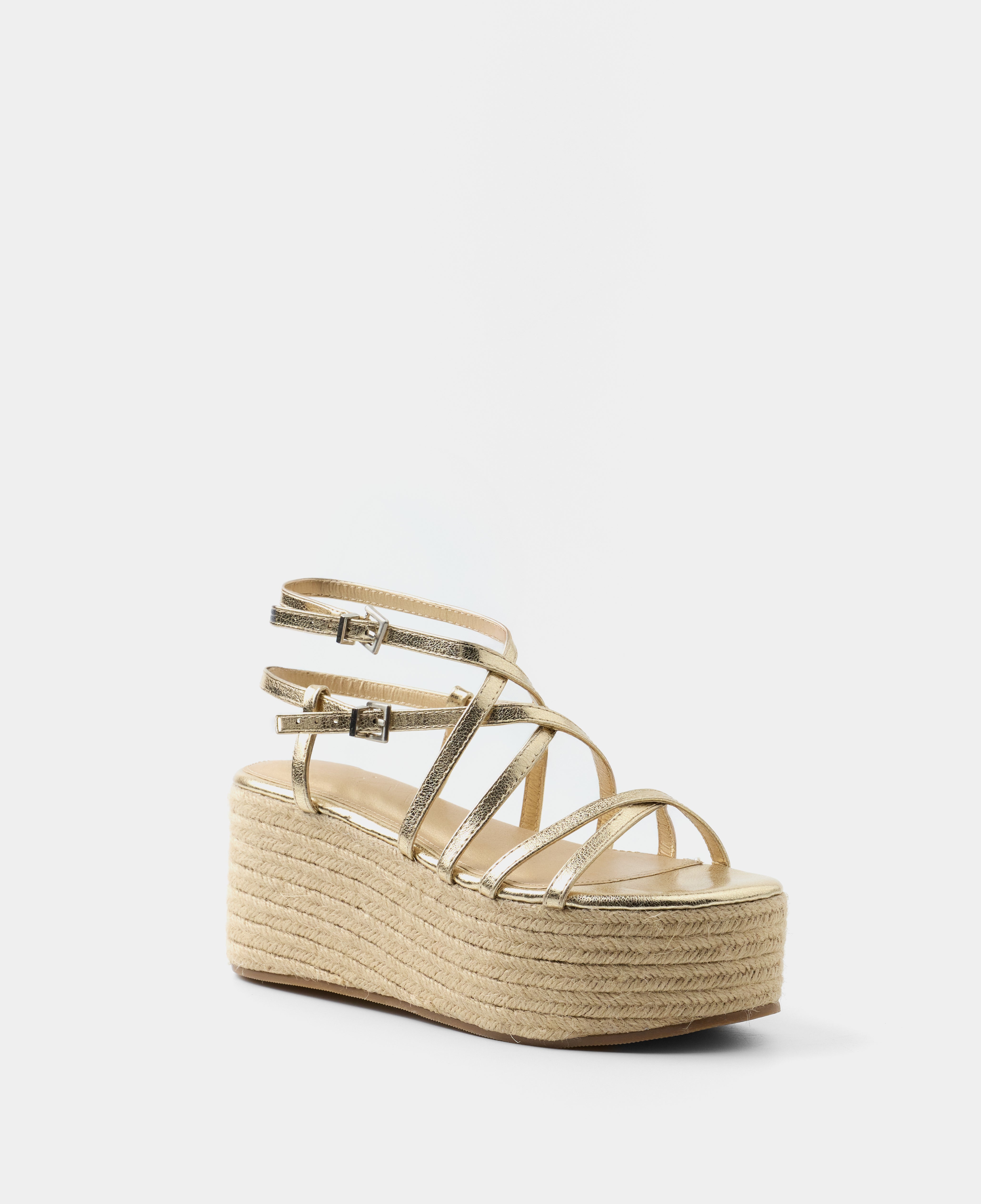 Sandalia con plataforma de esparto color dorado con tiras a diferentes niveles y con doble hebilla para atar alrededor del tobillo.