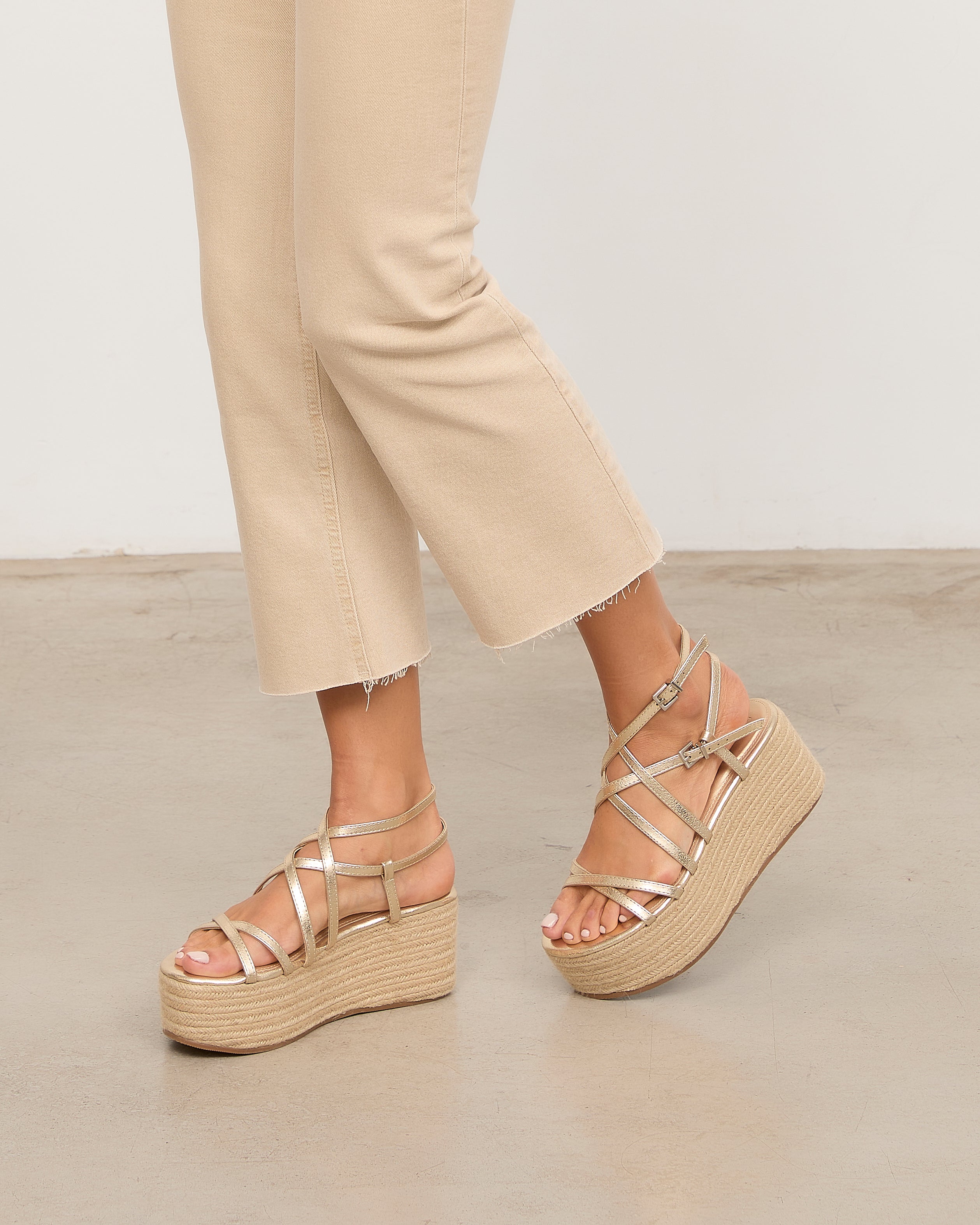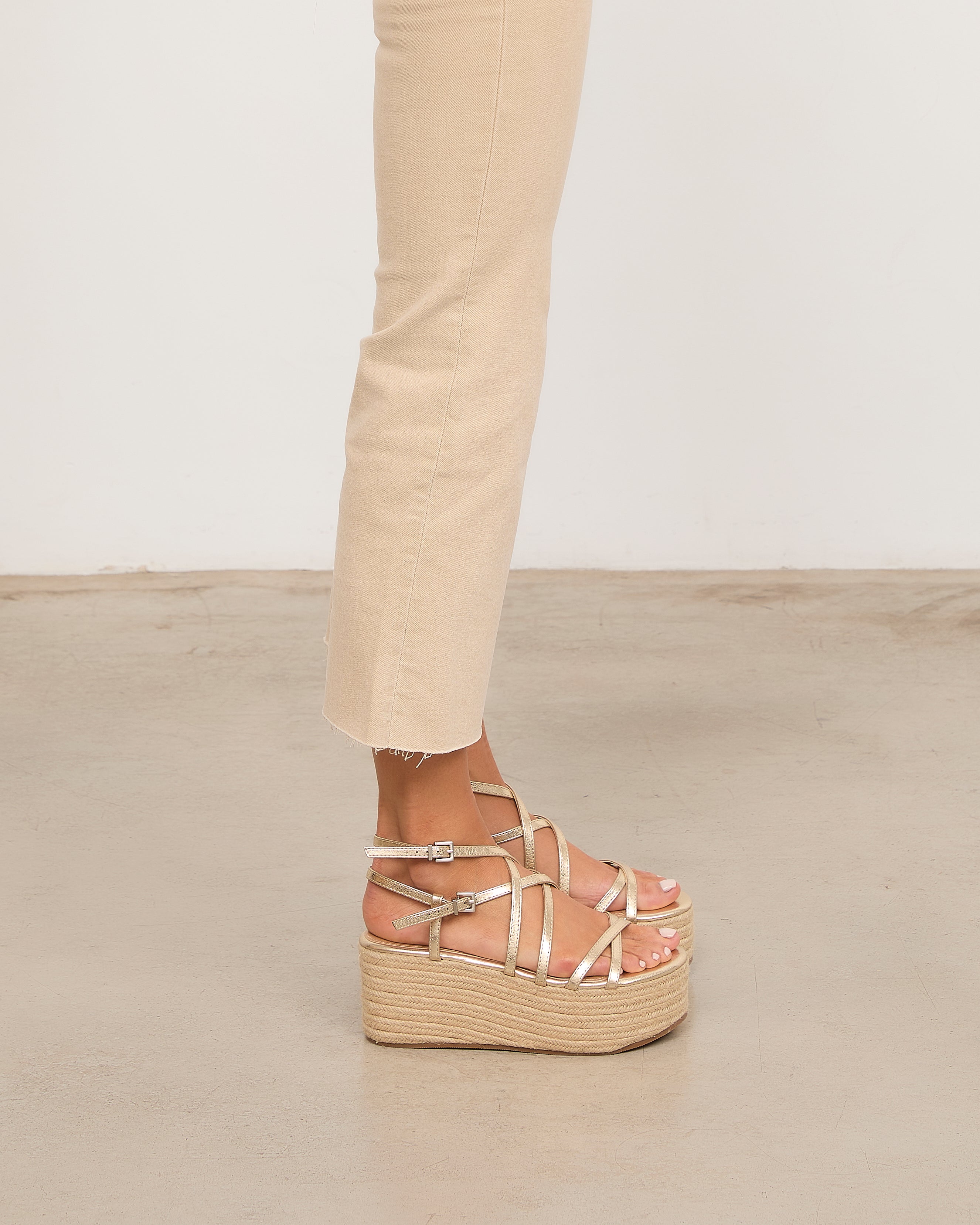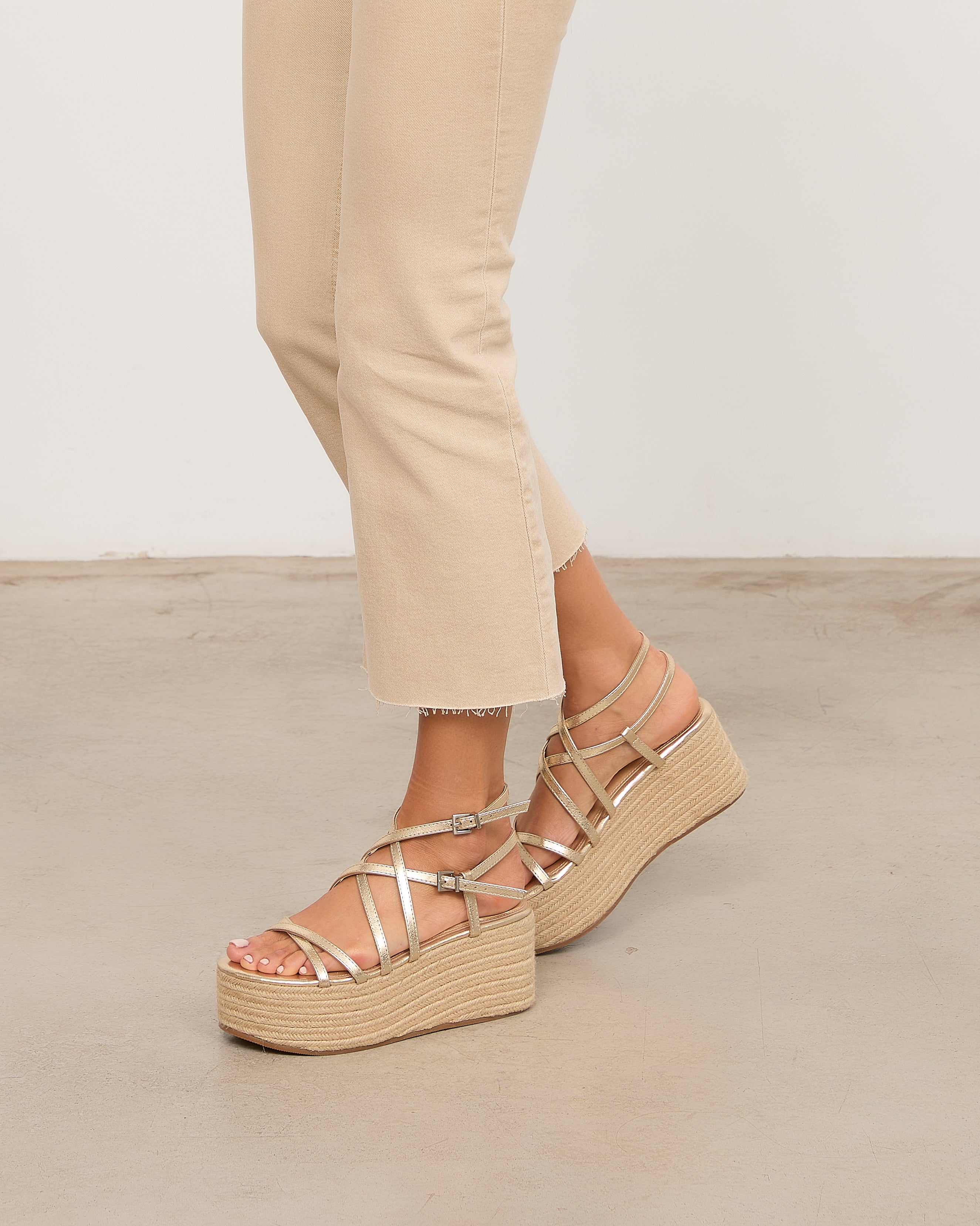 Sandalia con plataforma de esparto color dorado con tiras a diferentes niveles y con doble hebilla para atar alrededor del tobillo.