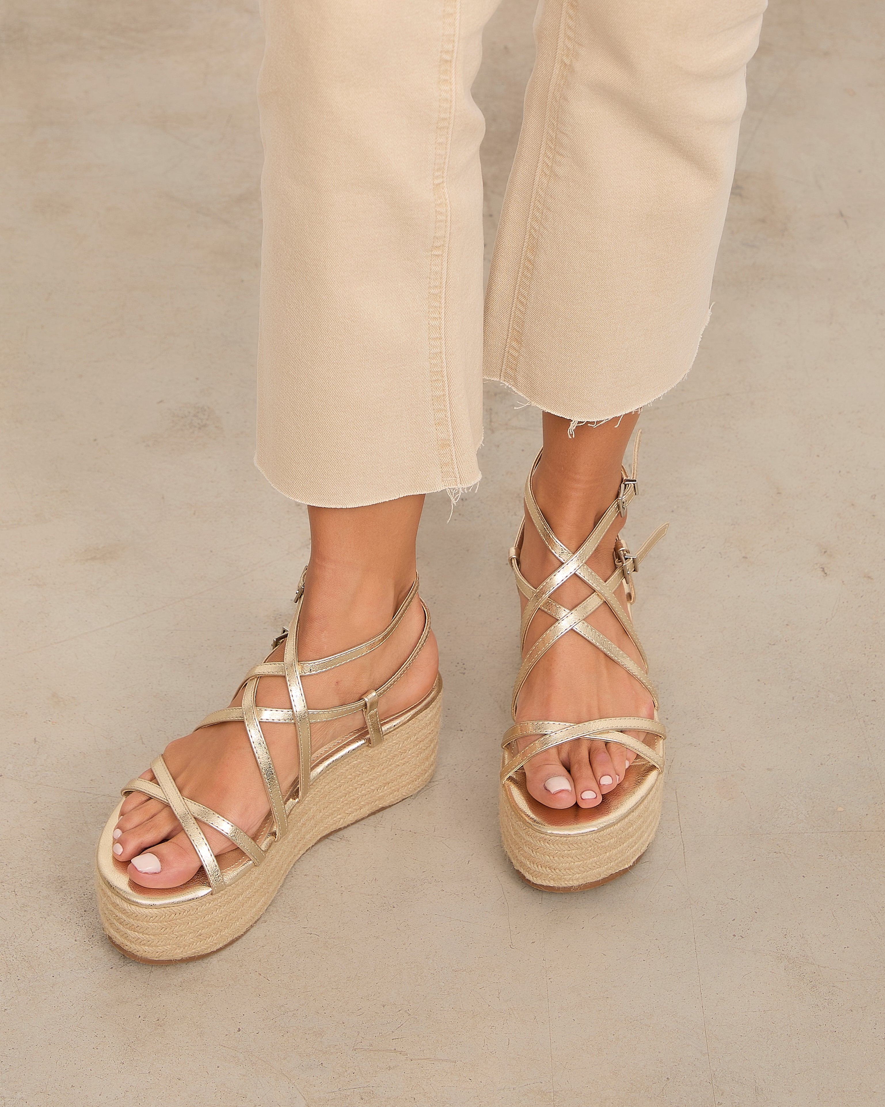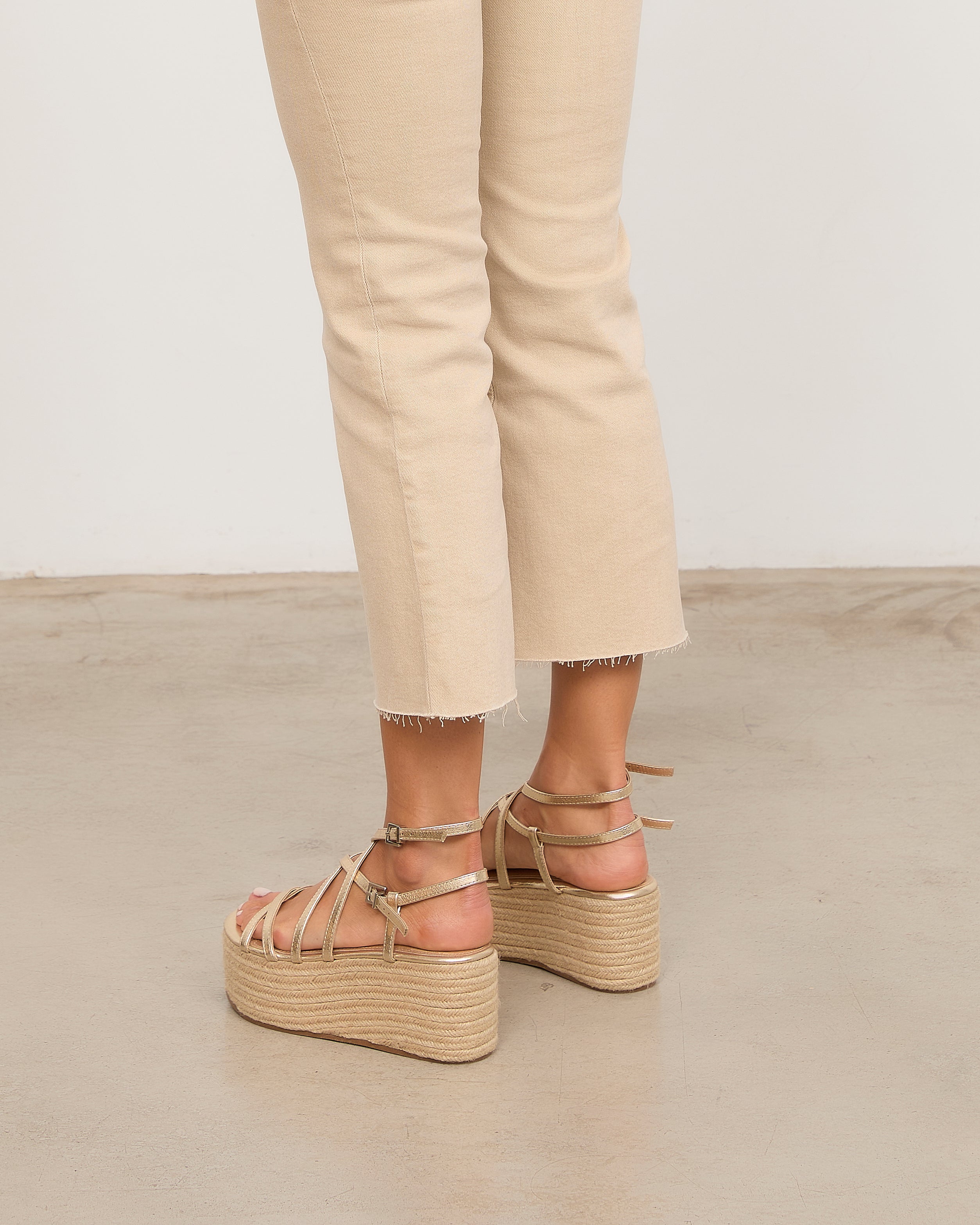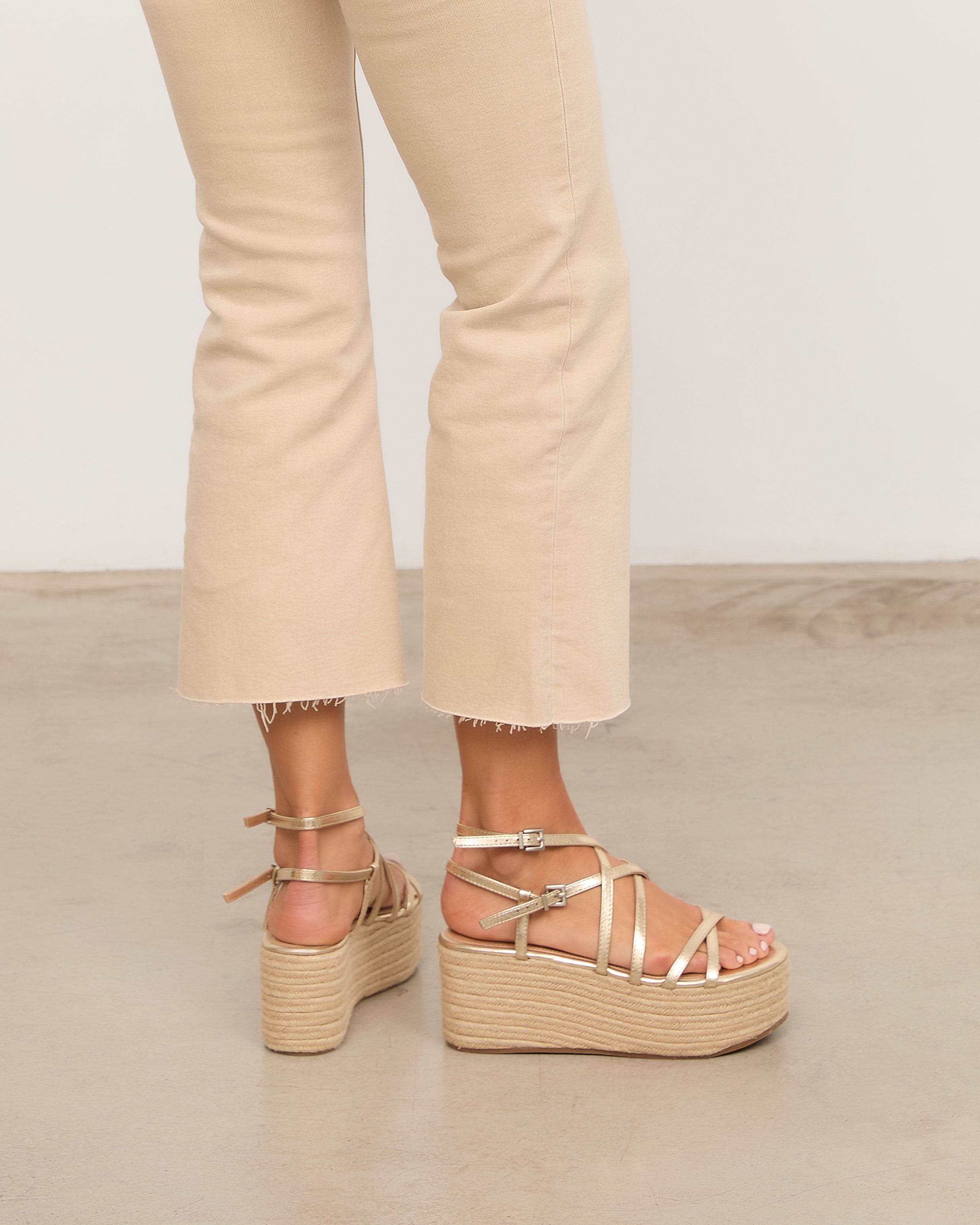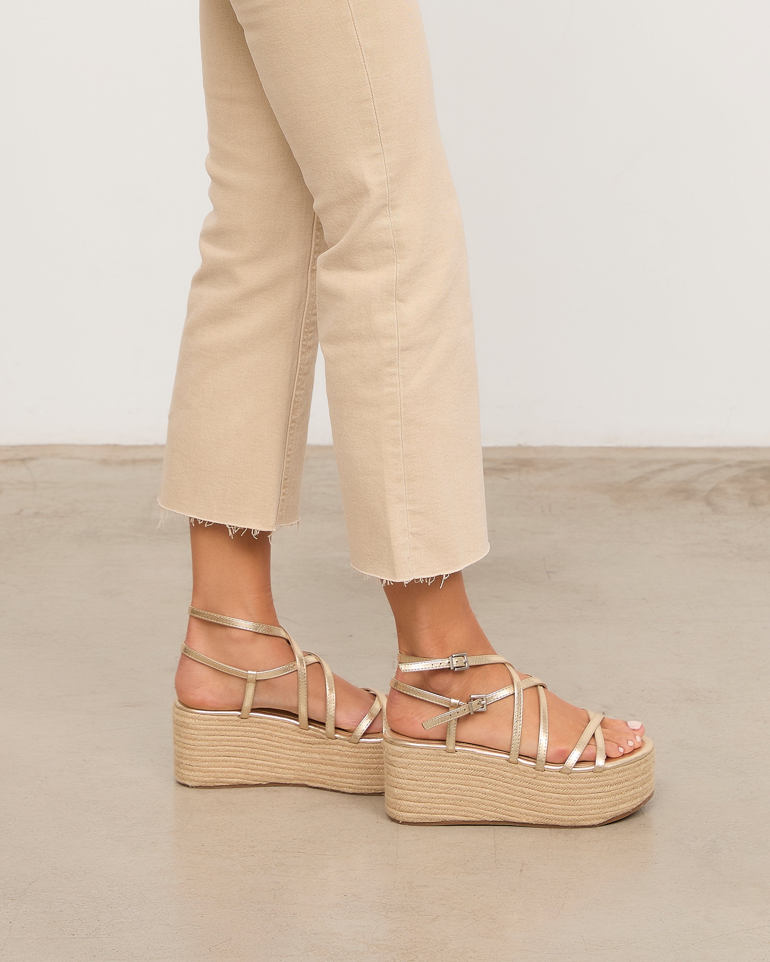 Sandalia con plataforma de esparto color dorado con tiras a diferentes niveles y con doble hebilla para atar alrededor del tobillo.