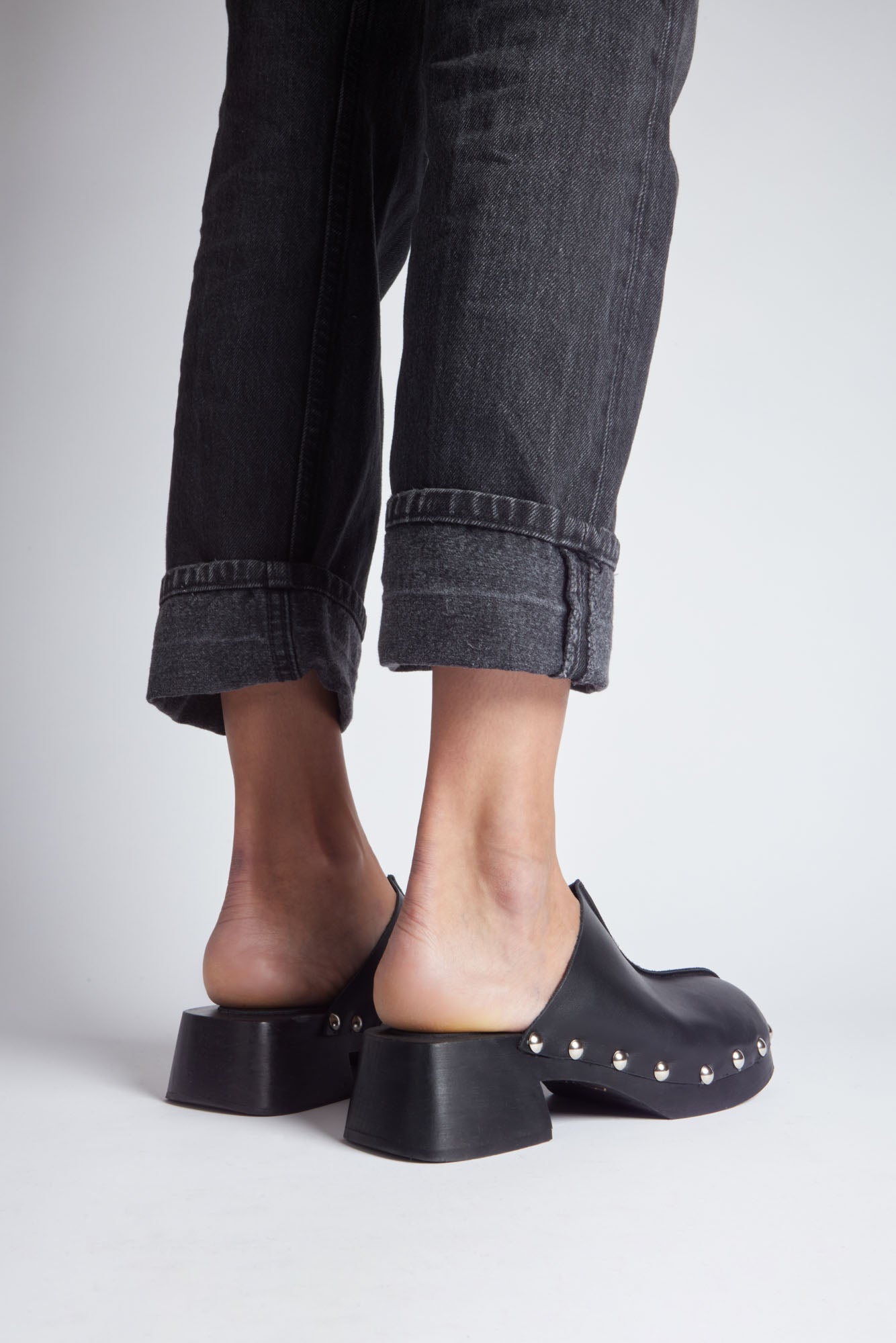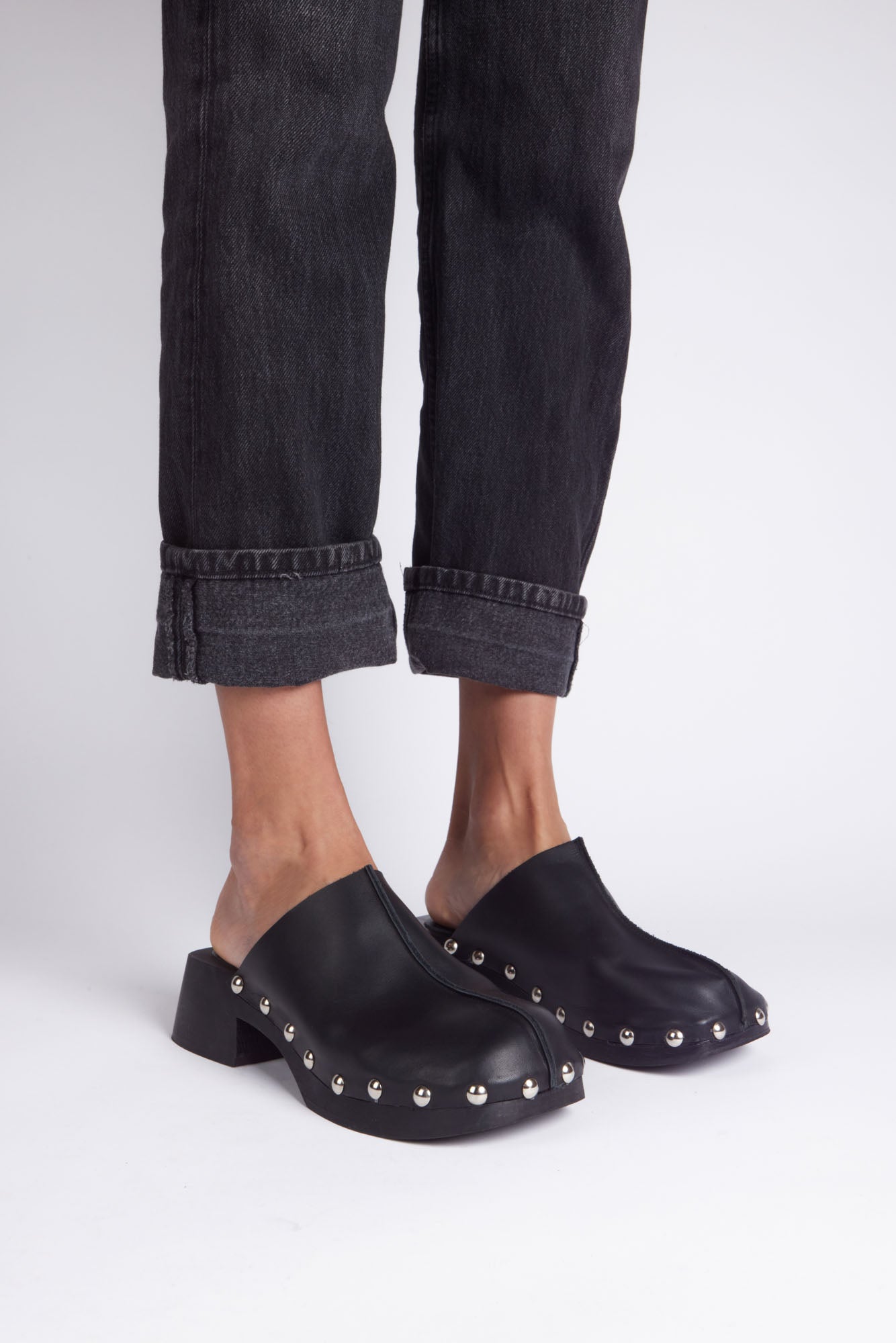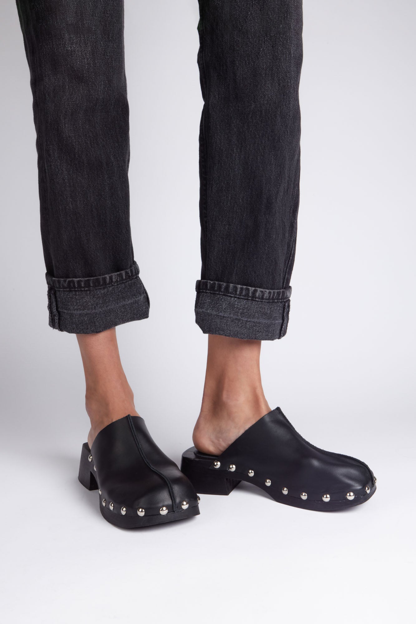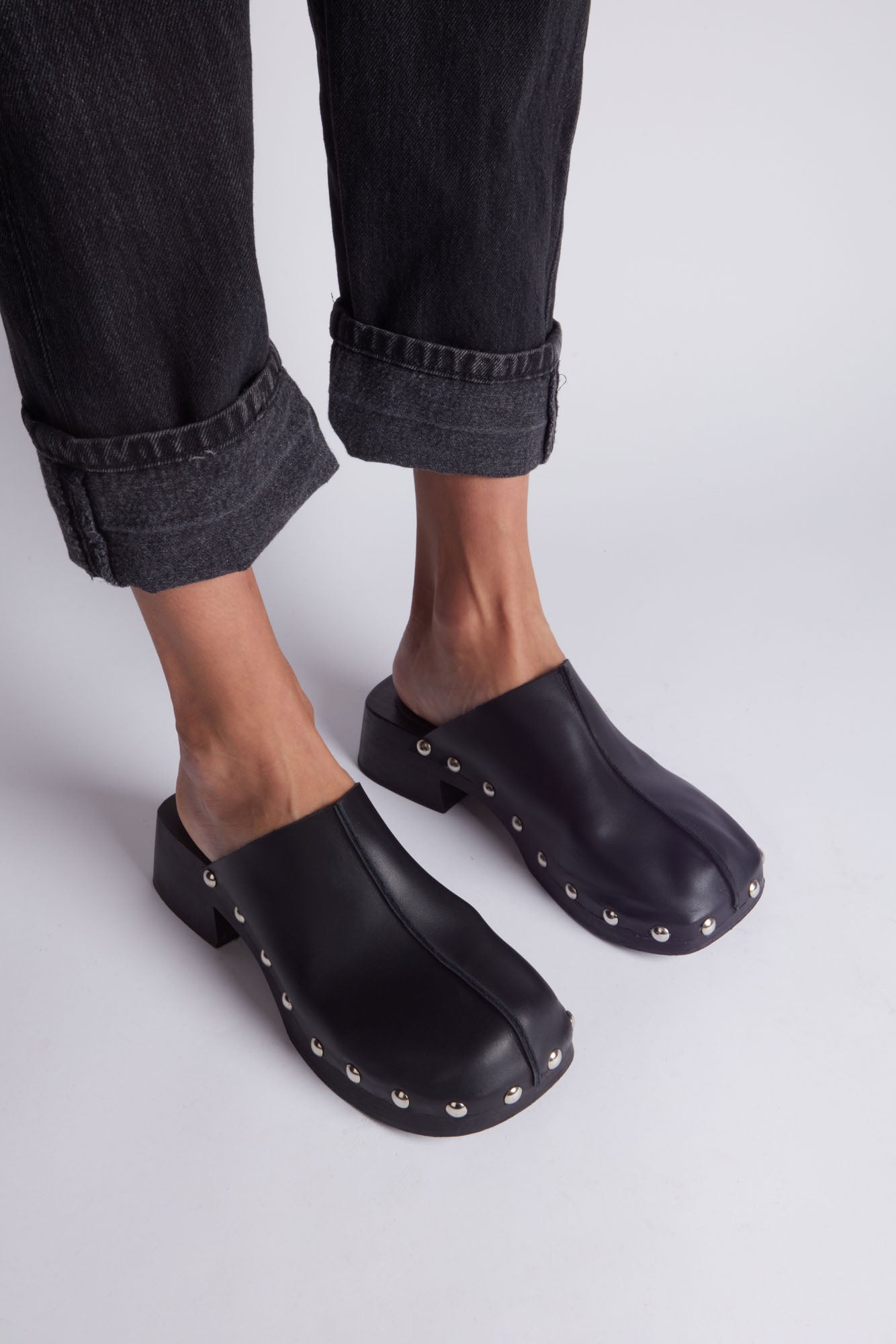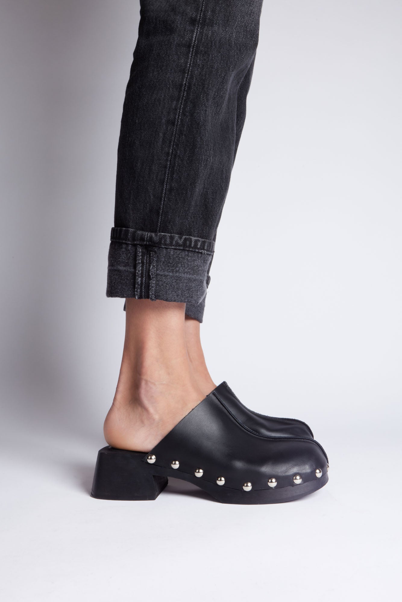 Sabot en cuir noir. Plateforme en bois et détails avec clous argentés.