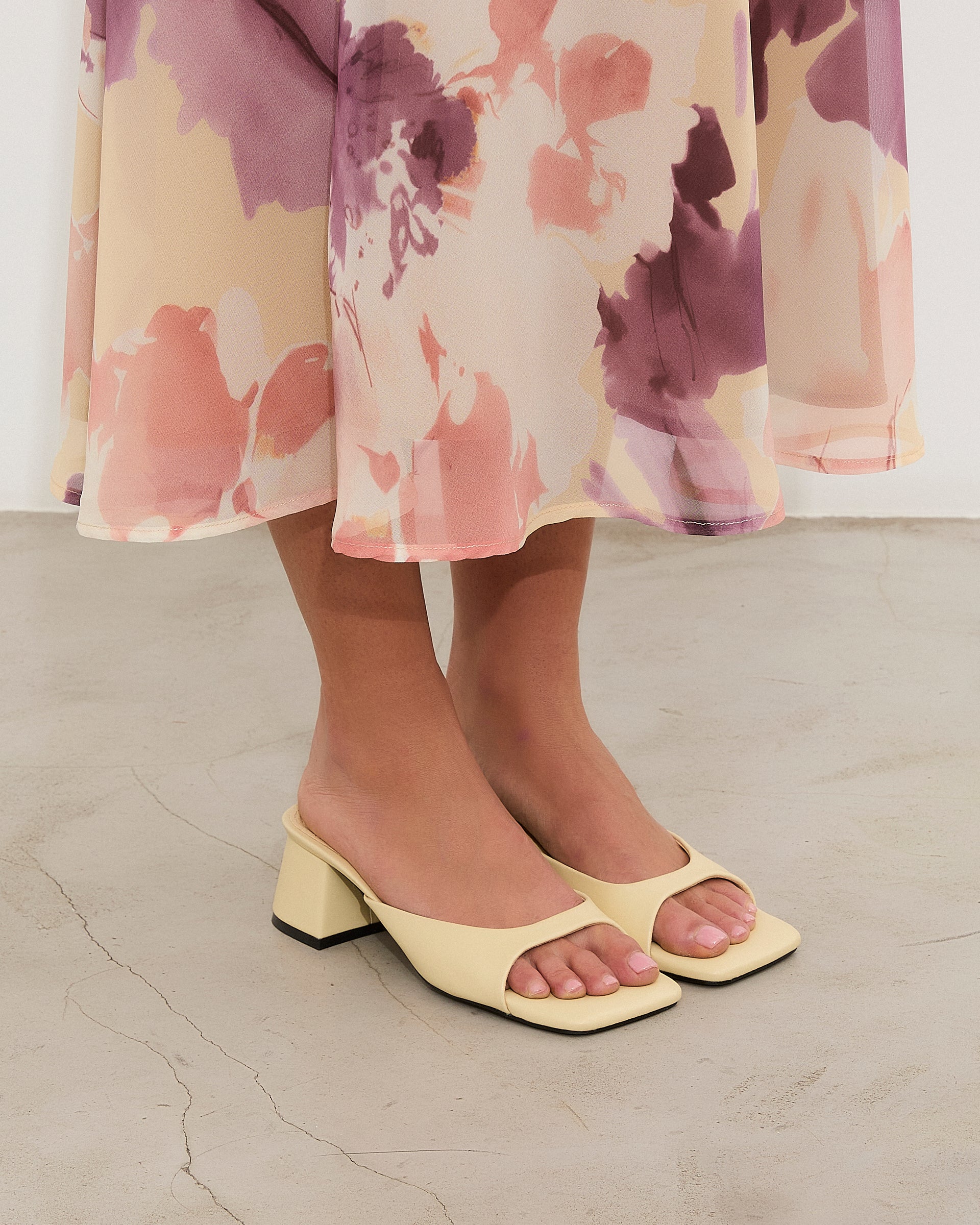Sandalia de tacón tipo mule con puntera cuadrada en color amarillo. Tira delantera envolvente en laterales. Tacón cuadrado bajo.