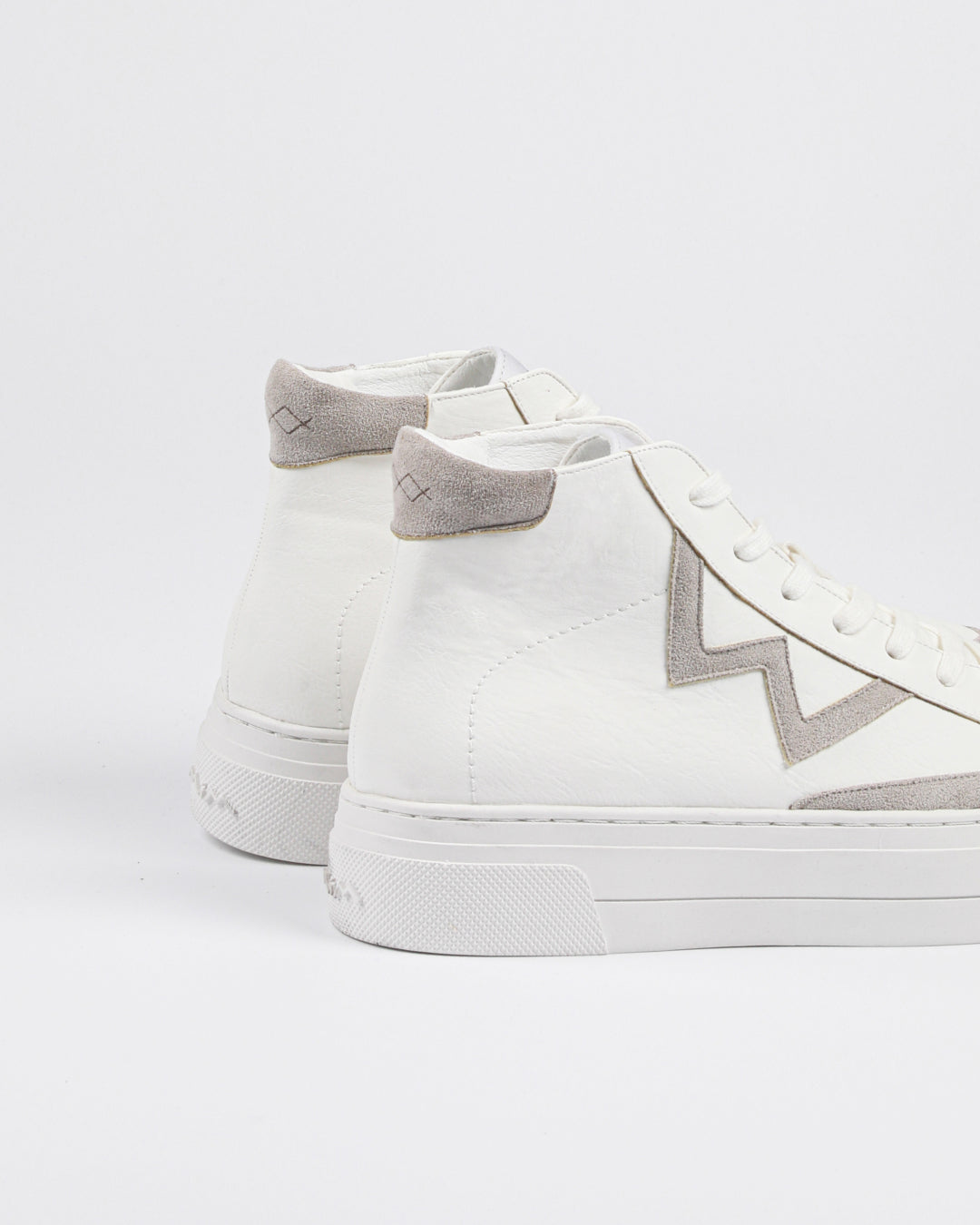 Basket montante en cuir végétalien avec le détail du M en gris.