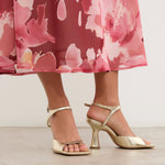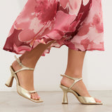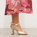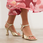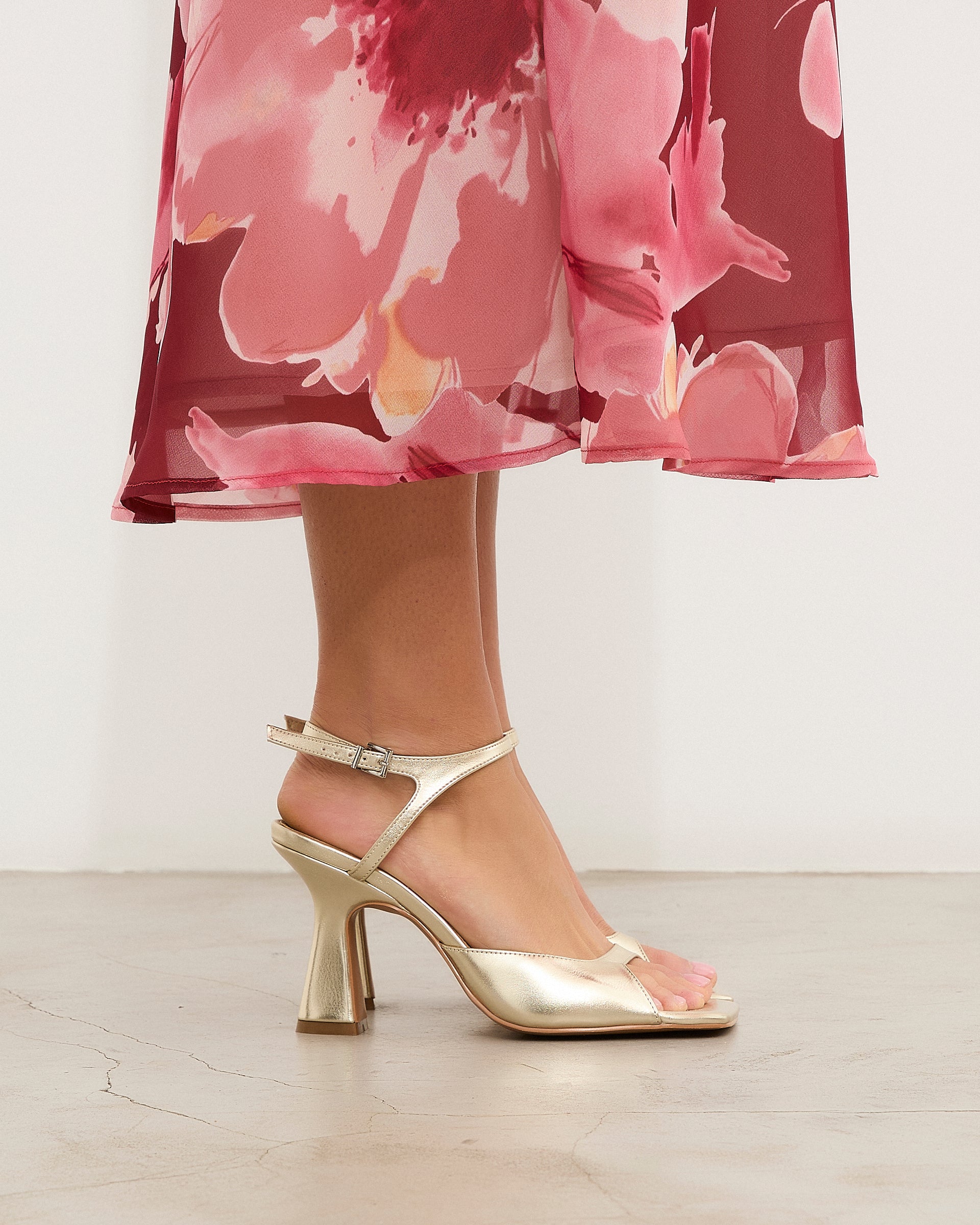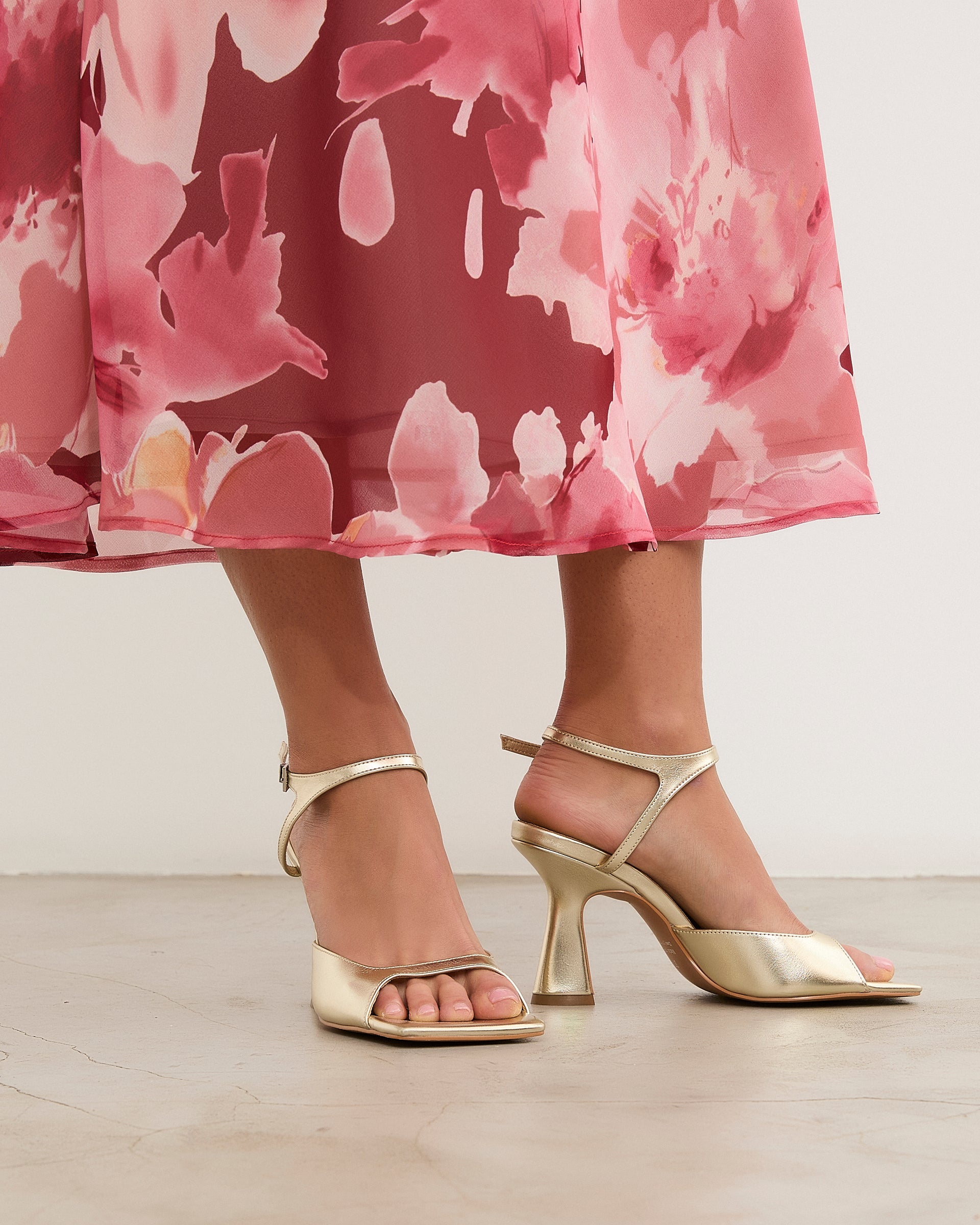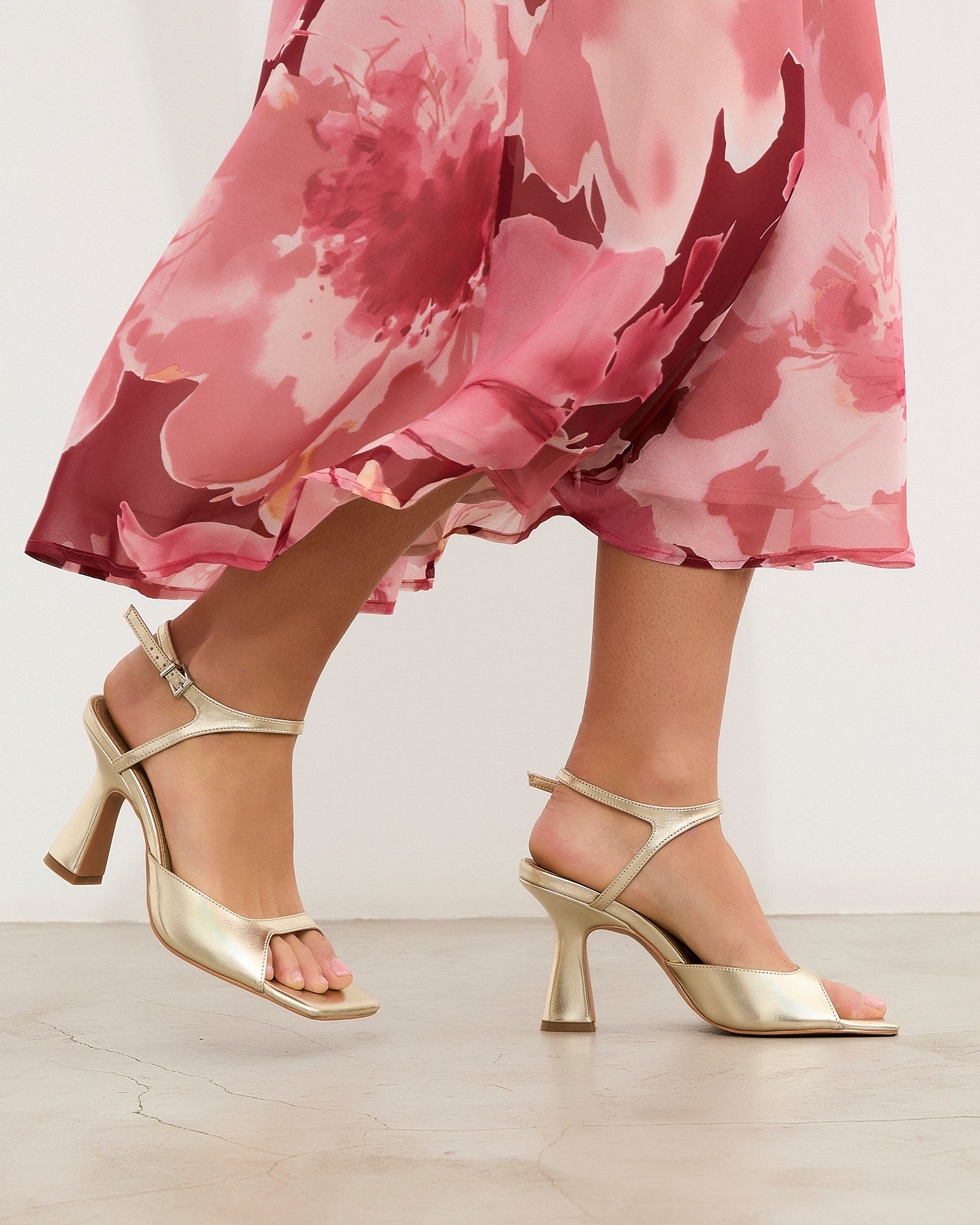 Sandalia de tacón en color dorado con puntera cuadrada. Tira delantera envolvente en laterales. Pulsera en el tobillo para cierre con hebilla. Tacón tipo aguja con base ancha.