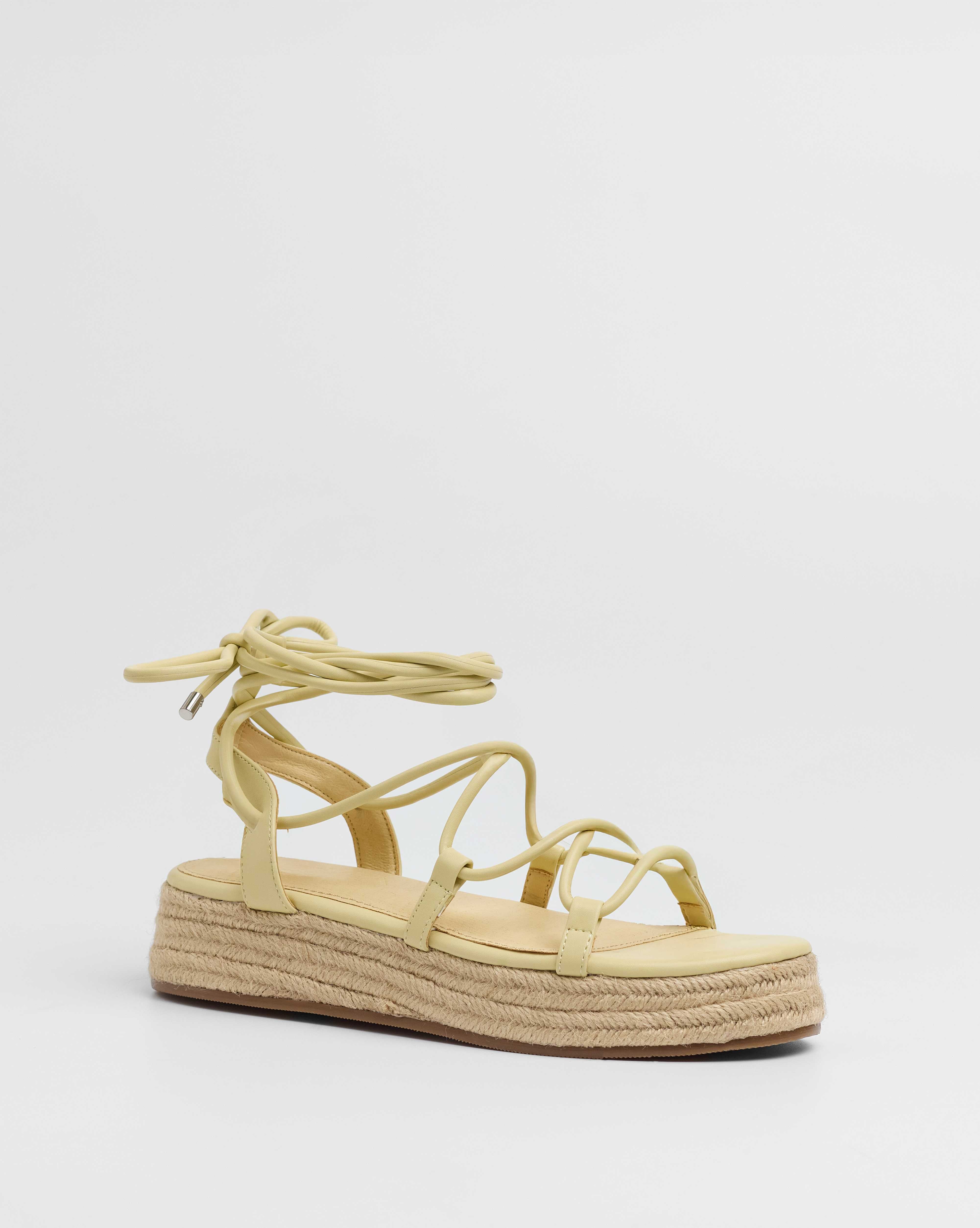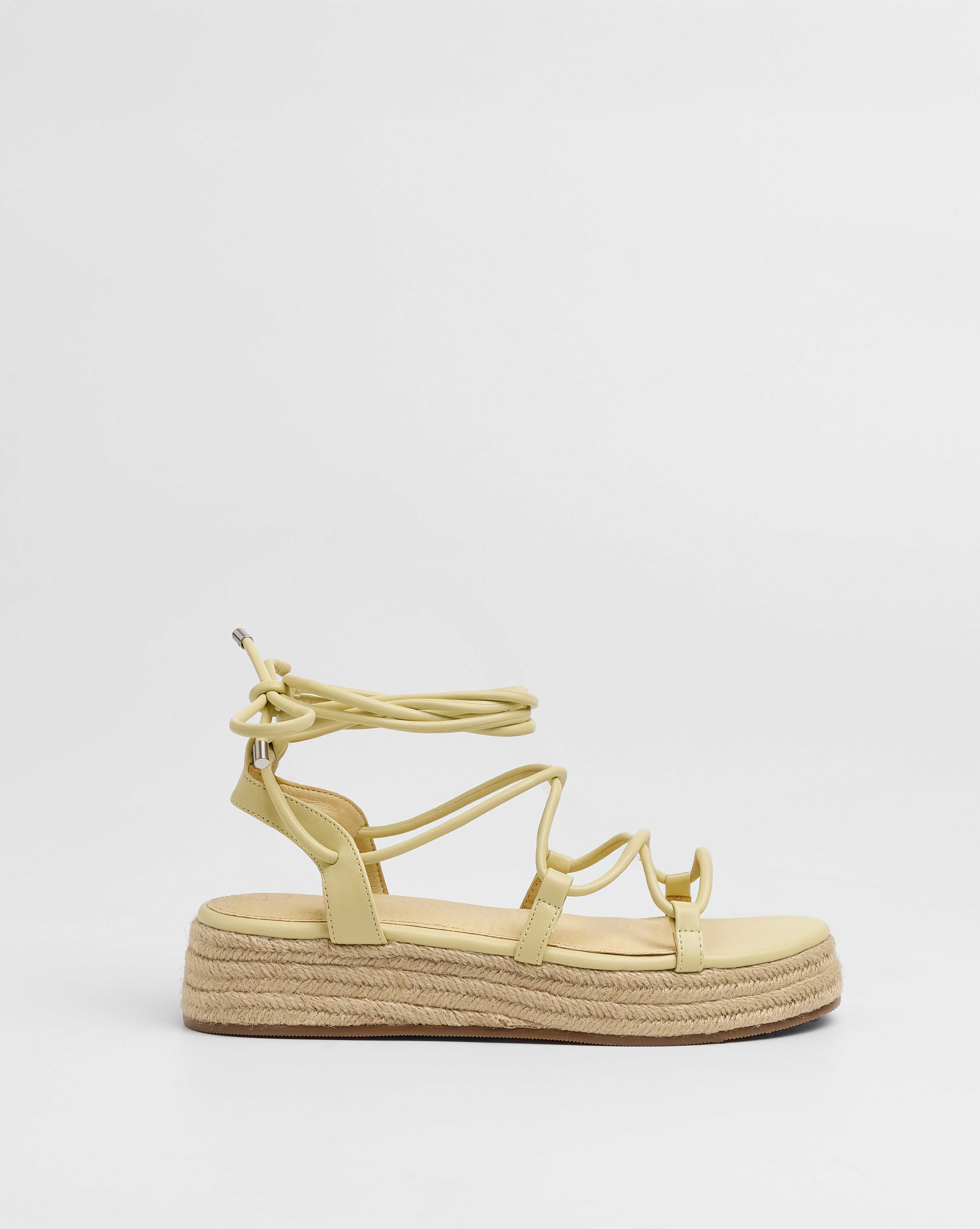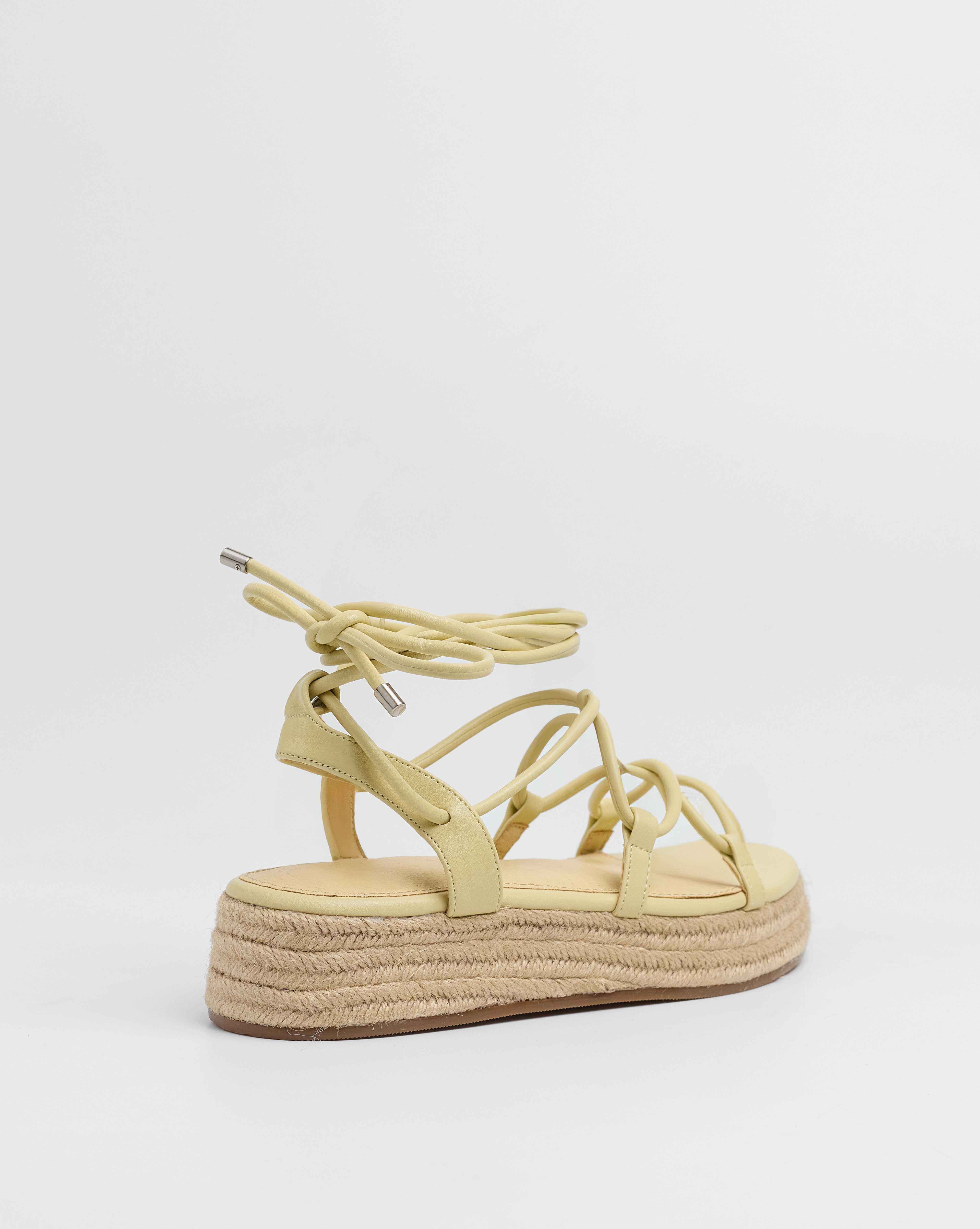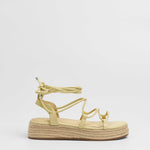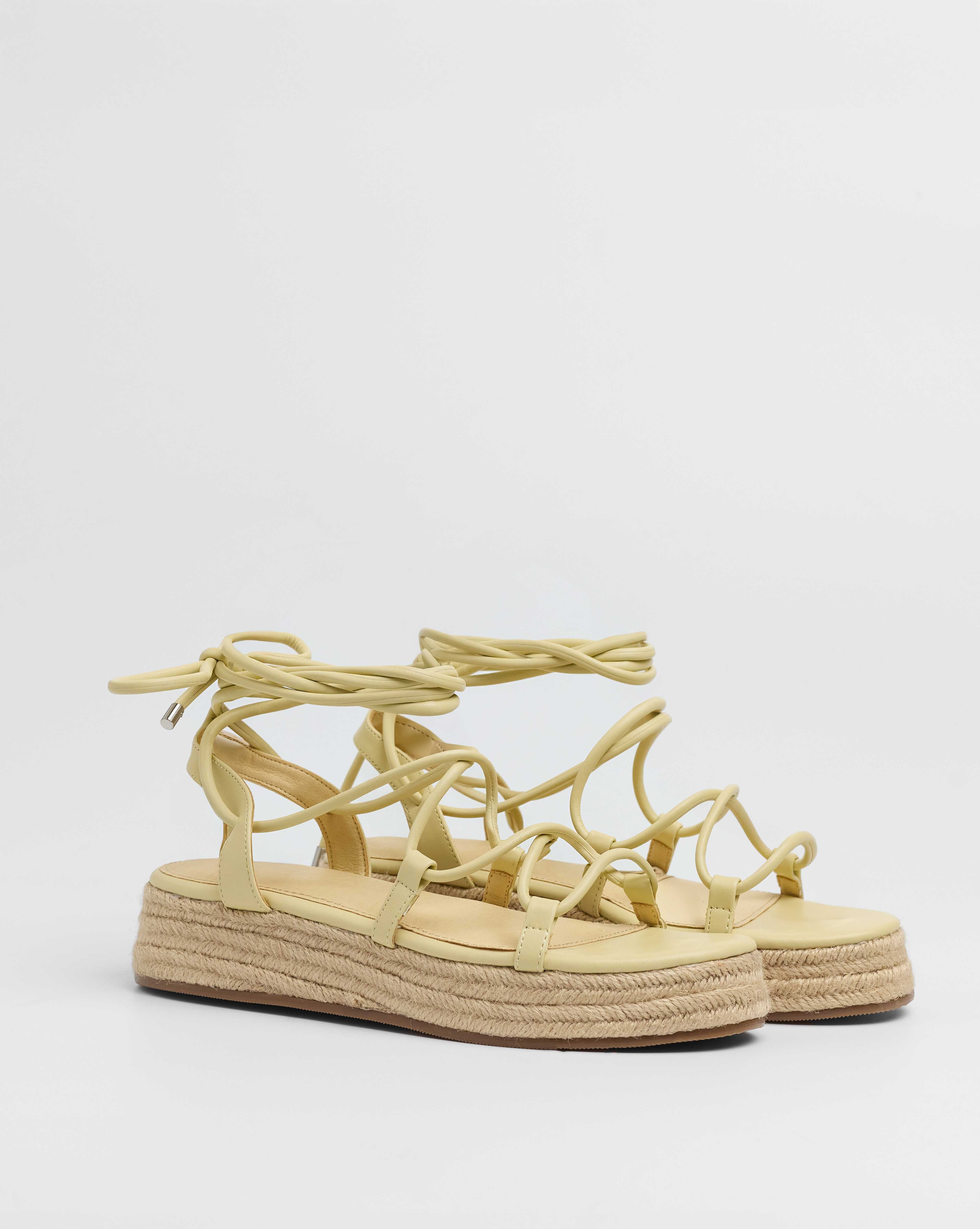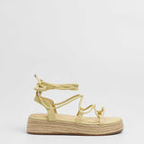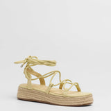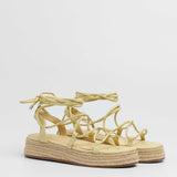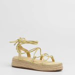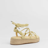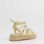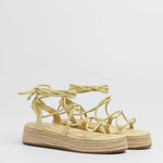 Sandalia esparto con plataforma en color amarilllo. Compuesto por varias tiras tubulares y cierre con tiras anudadas al tobillo.