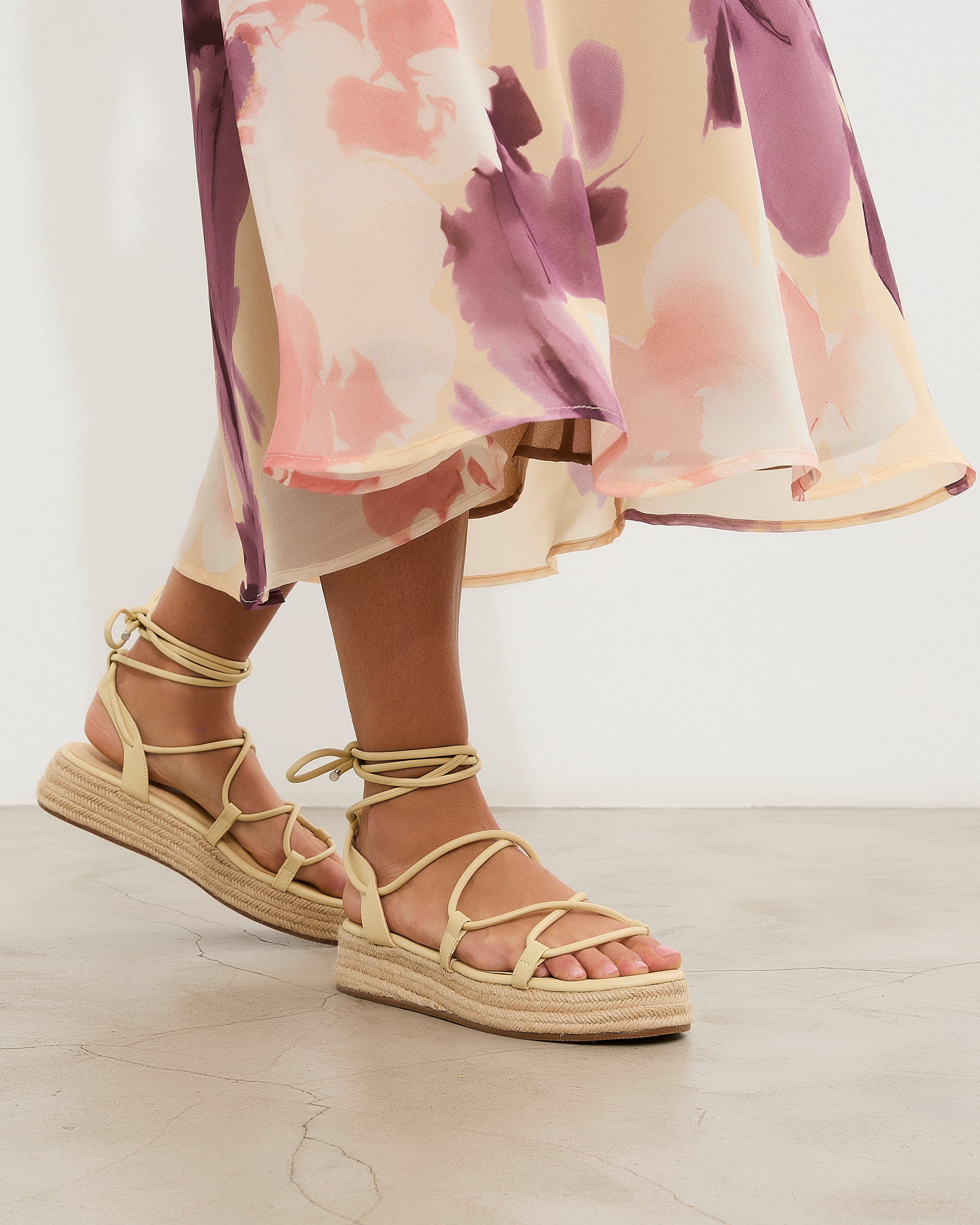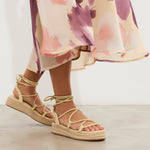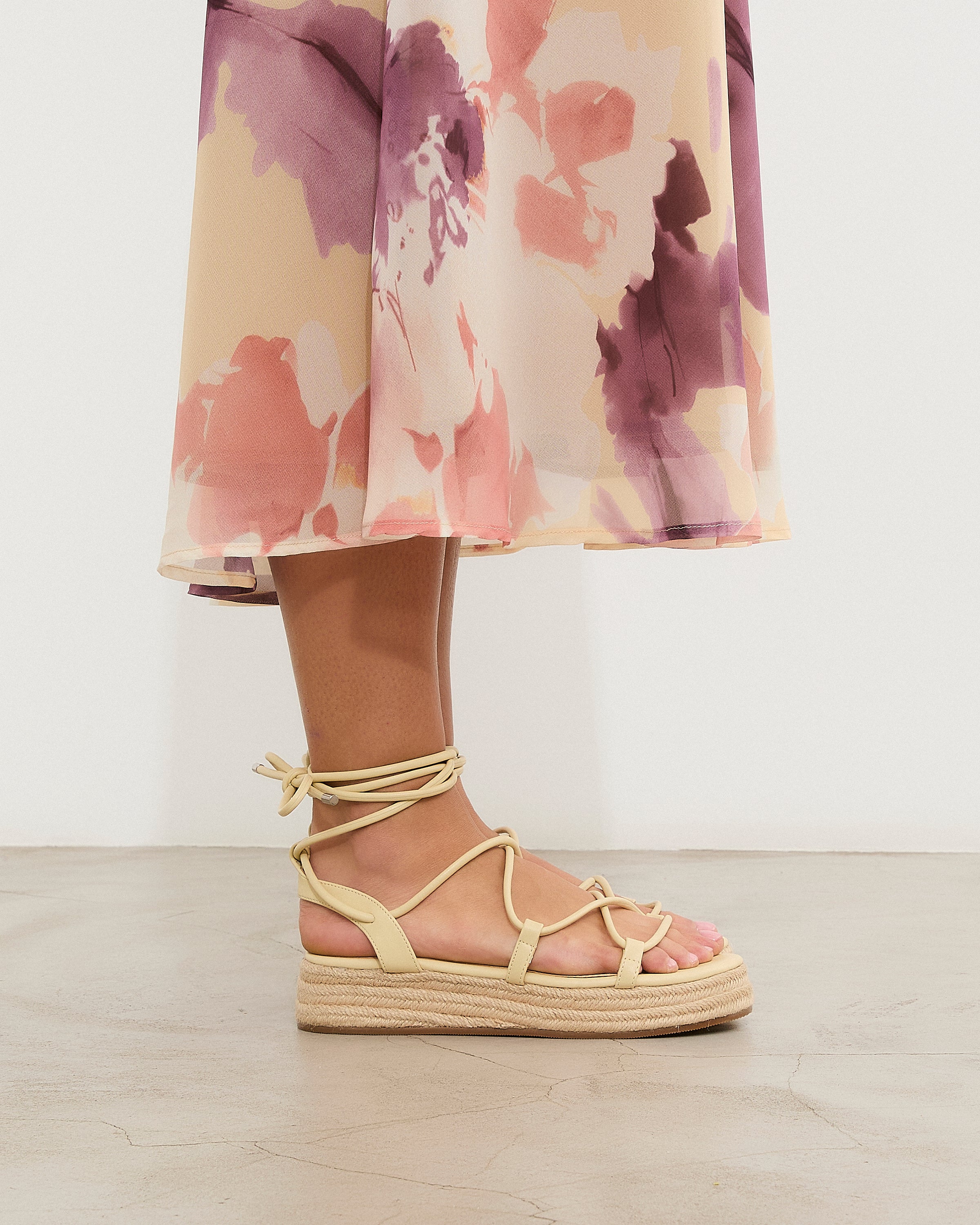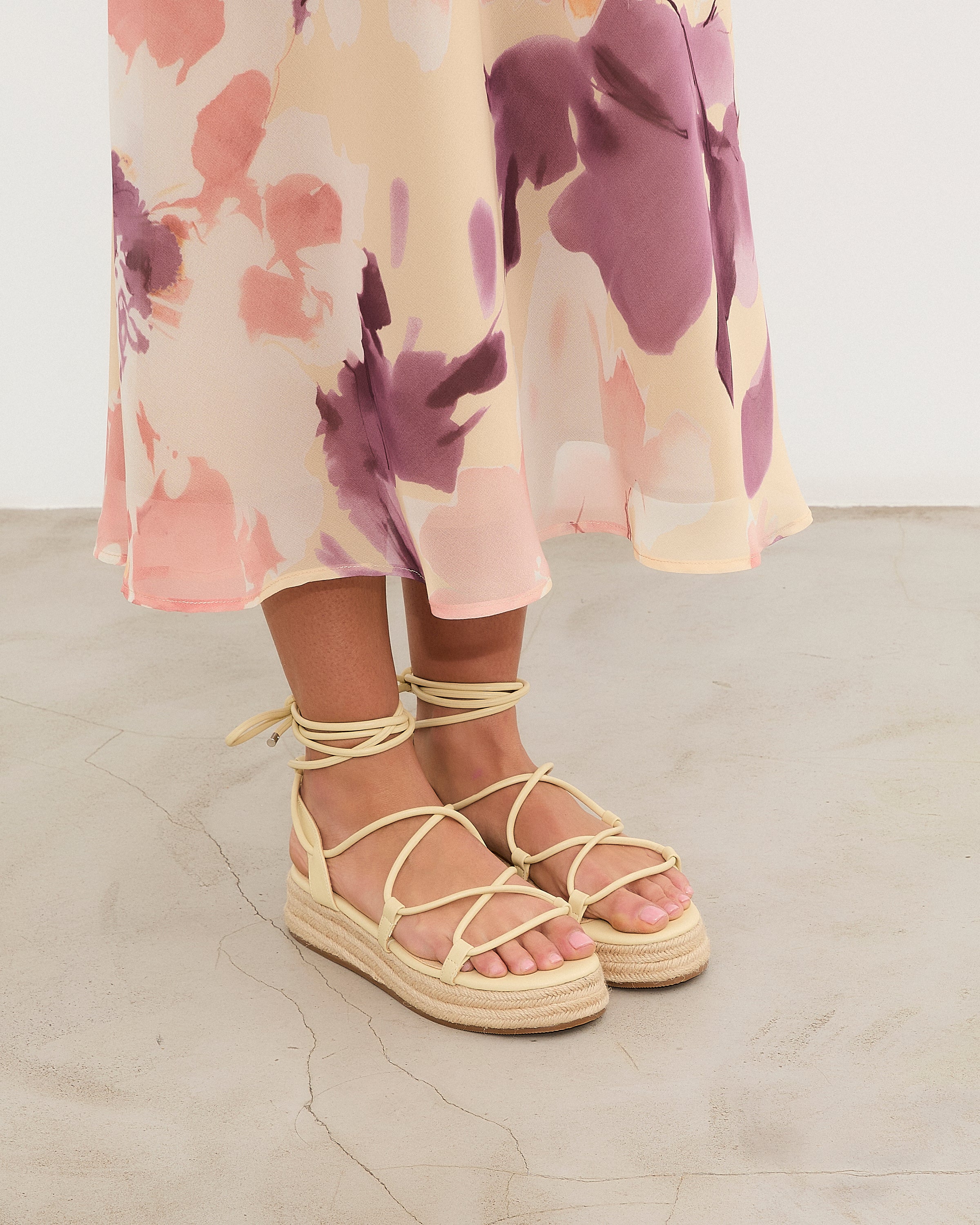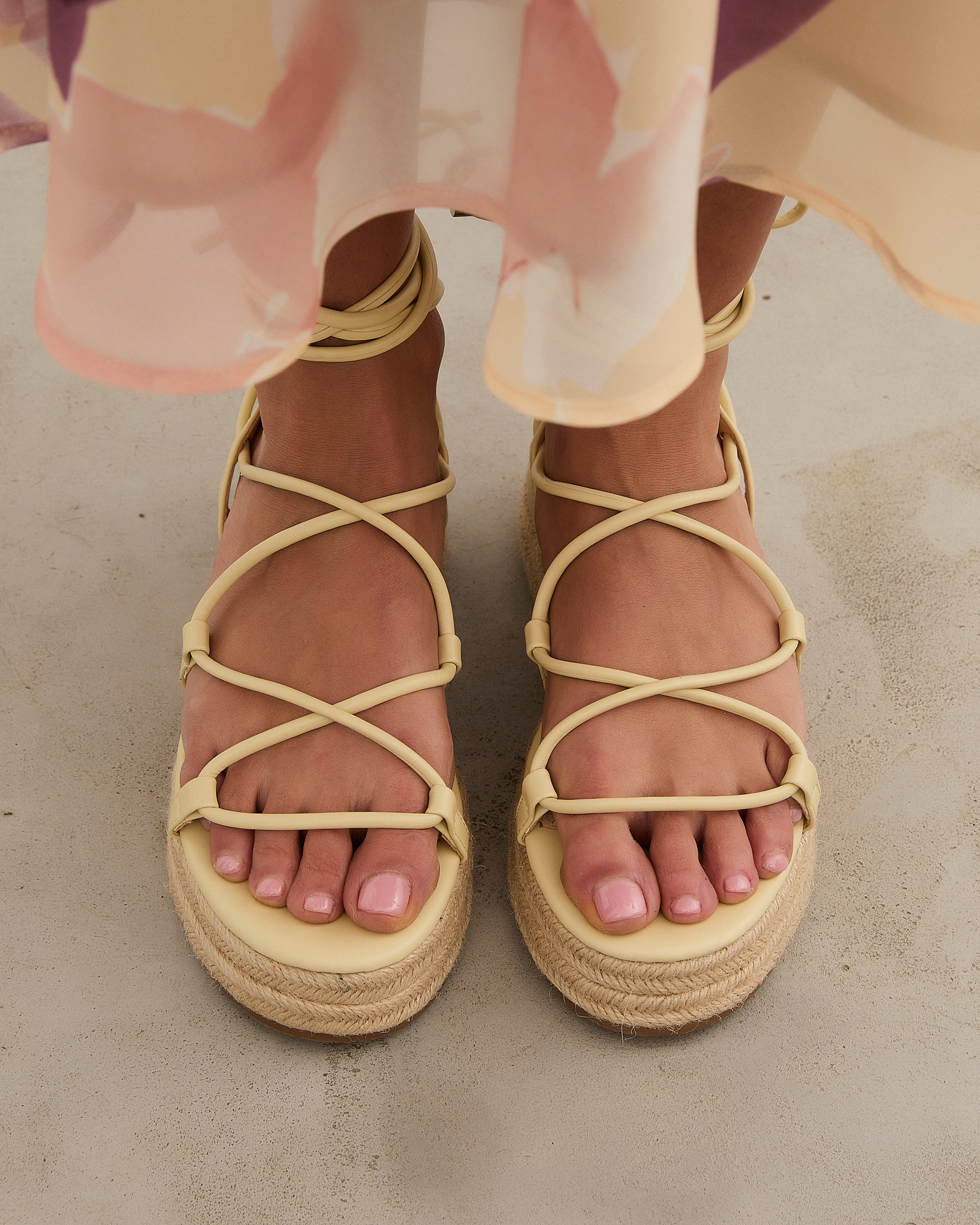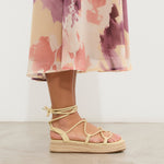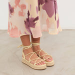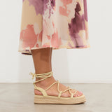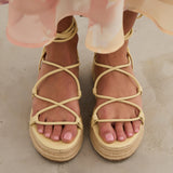 Sandalia esparto con plataforma en color amarilllo. Compuesto por varias tiras tubulares y cierre con tiras anudadas al tobillo.