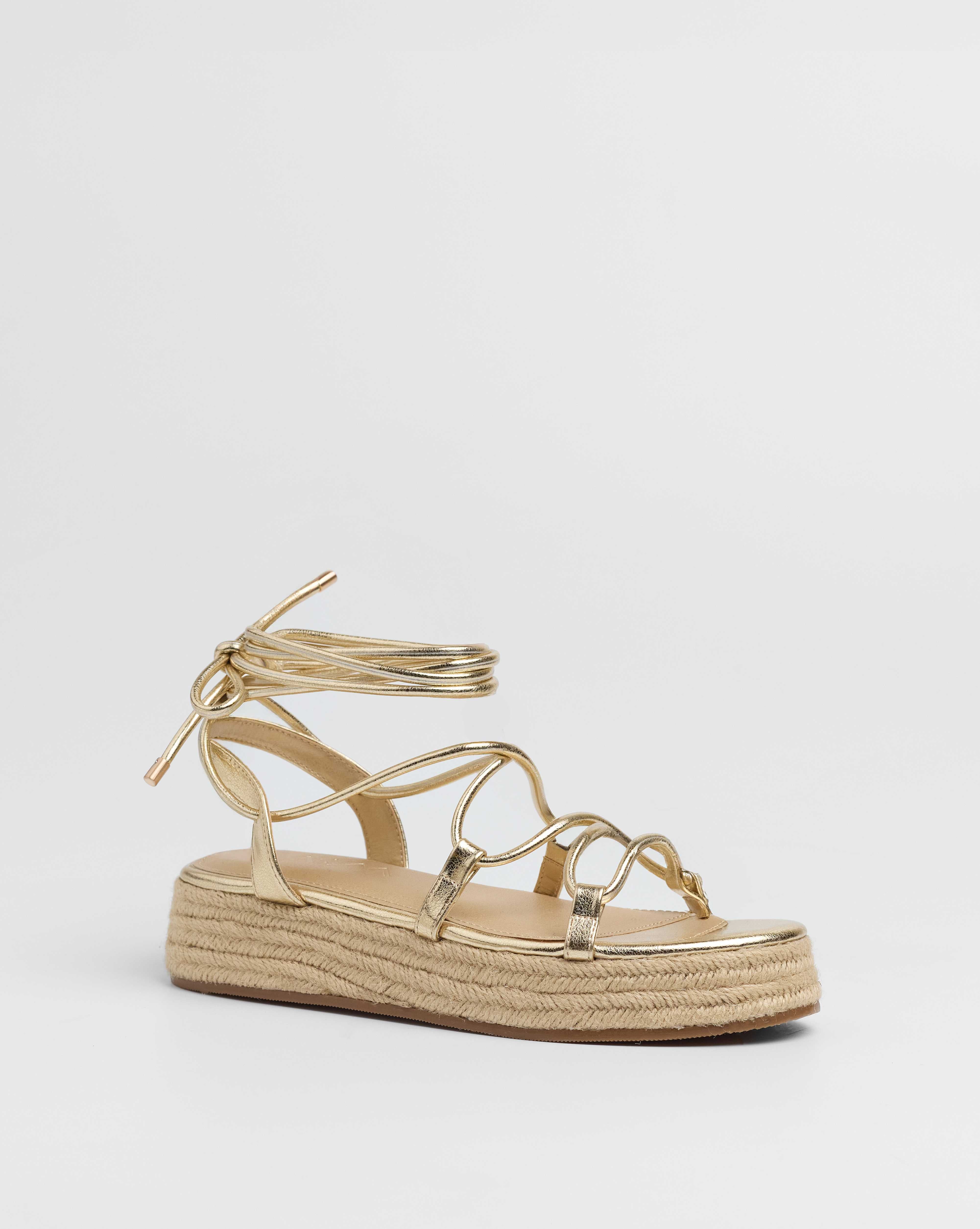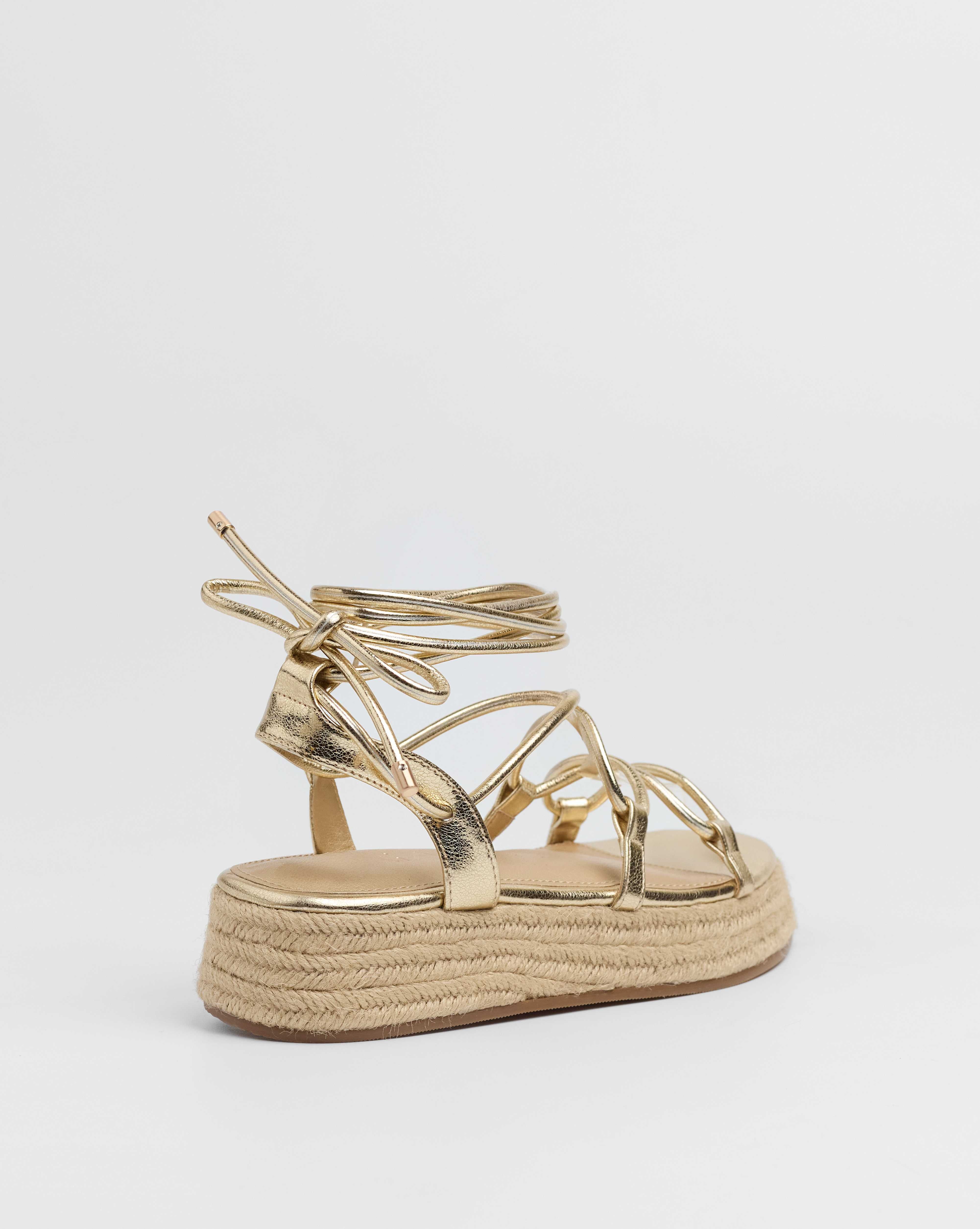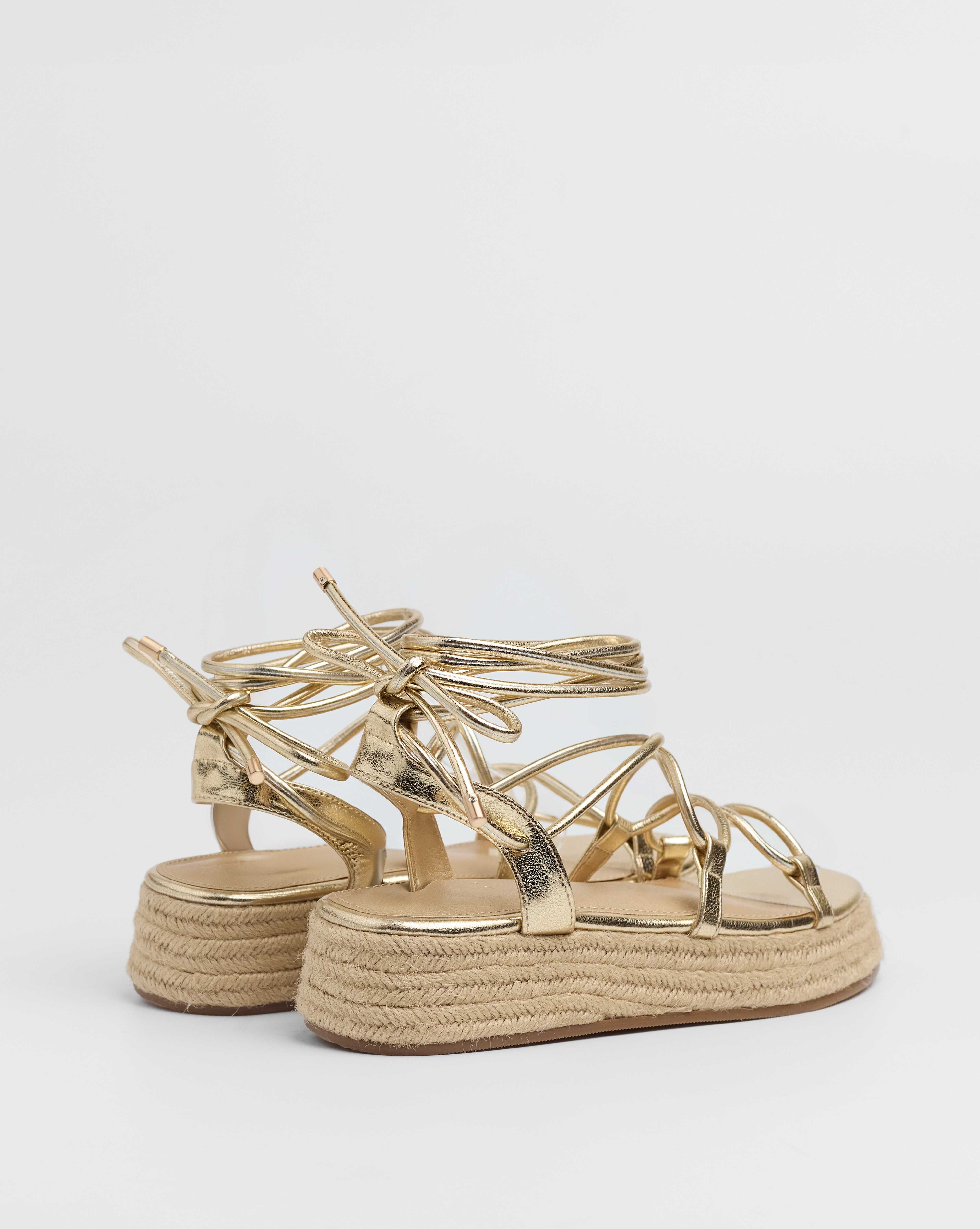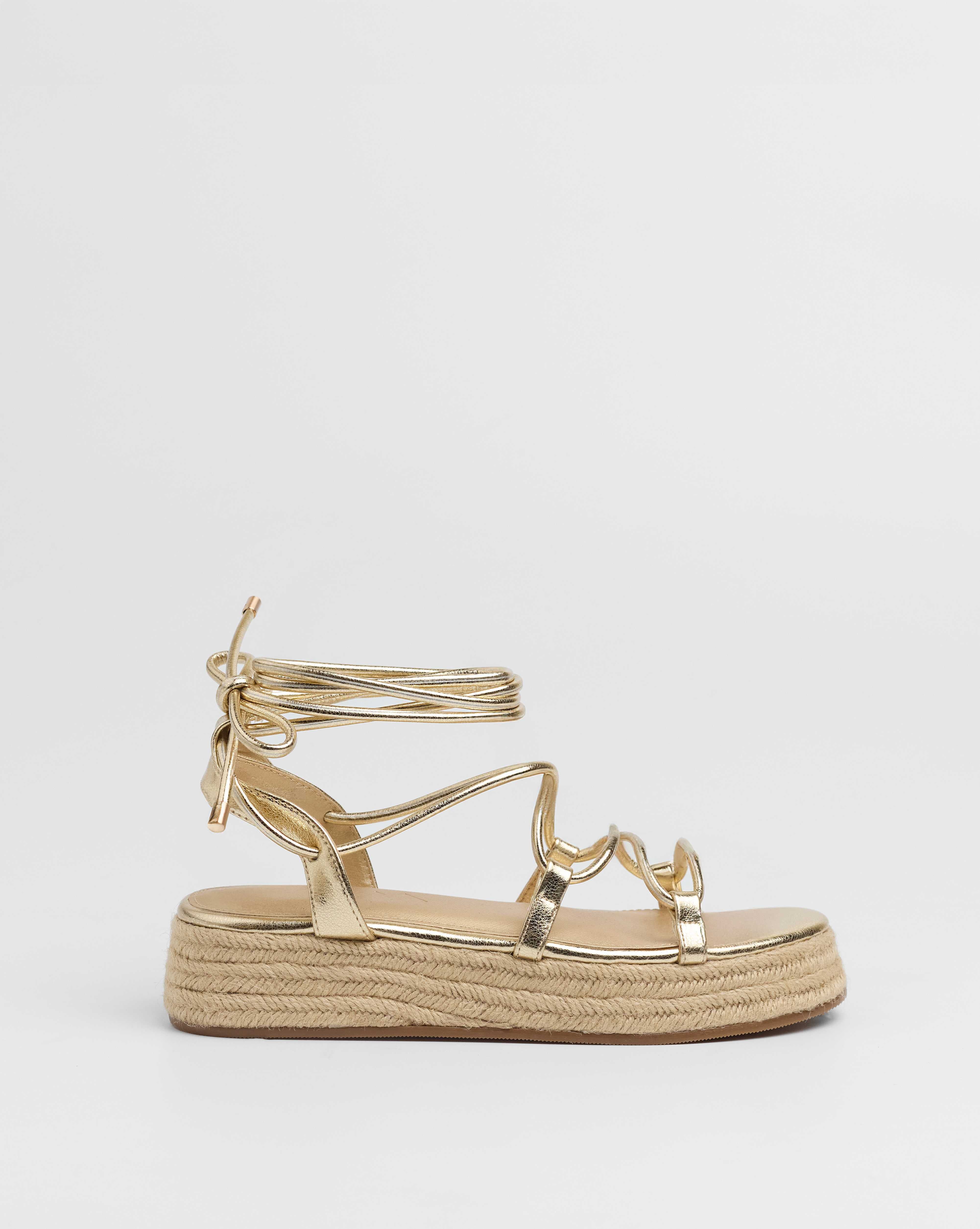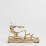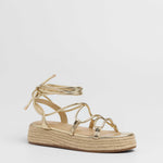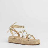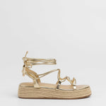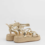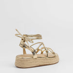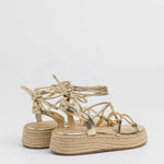 Sandalia esparto con plataforma en color dorado. Compuesto por varias tiras tubulares y cierre con tiras anudadas al tobillo.