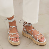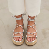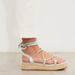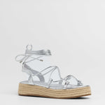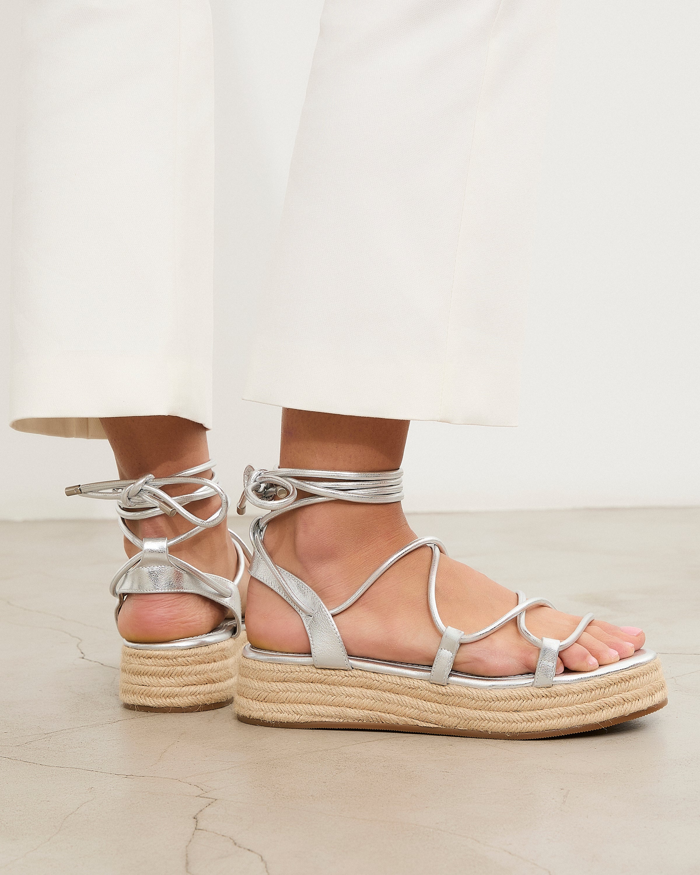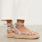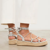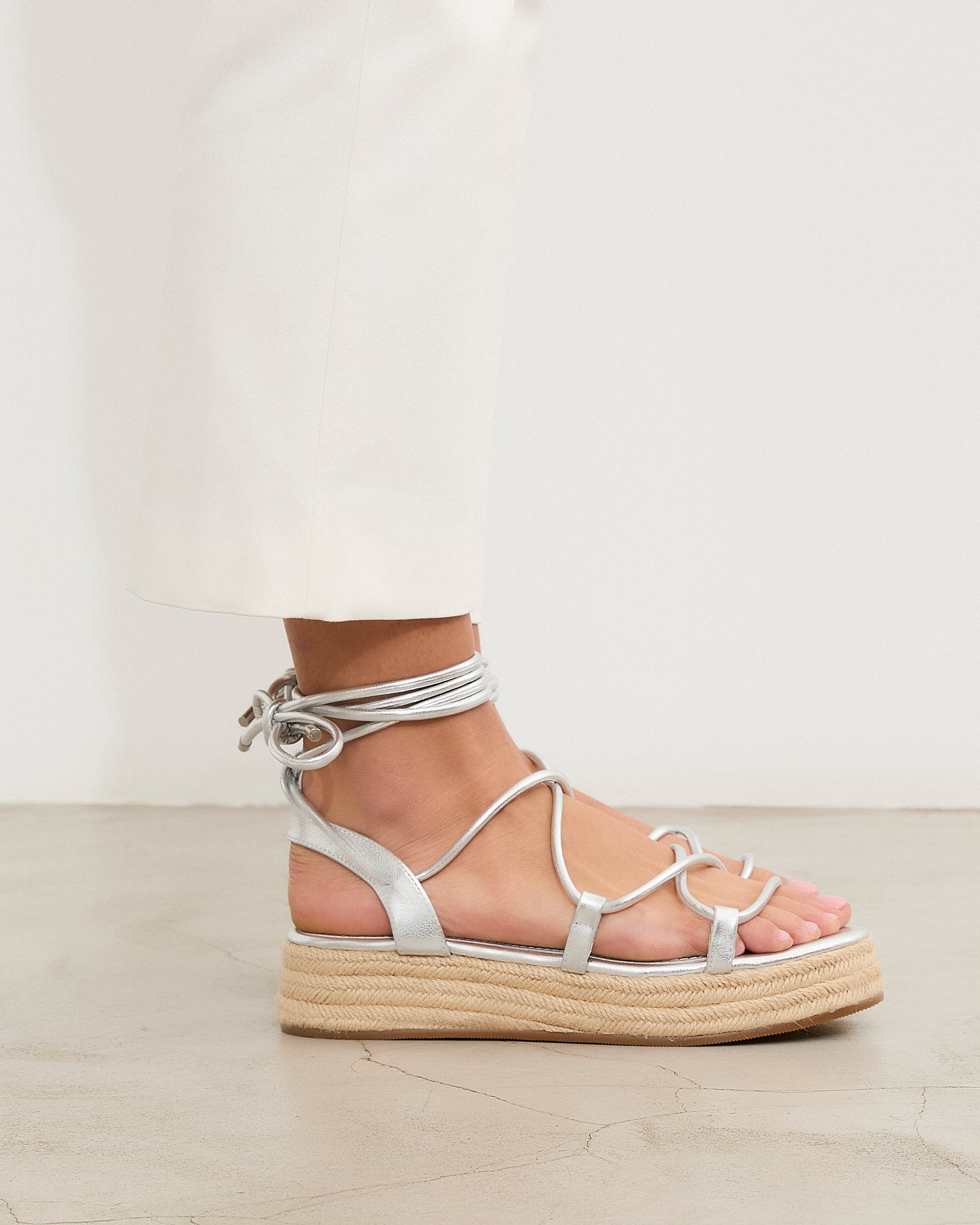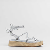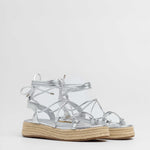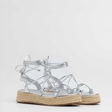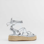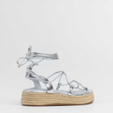 Sandalia esparto con plataforma en color plata. Compuesto por varias tiras tubulares y cierre con tiras anudadas al tobillo.